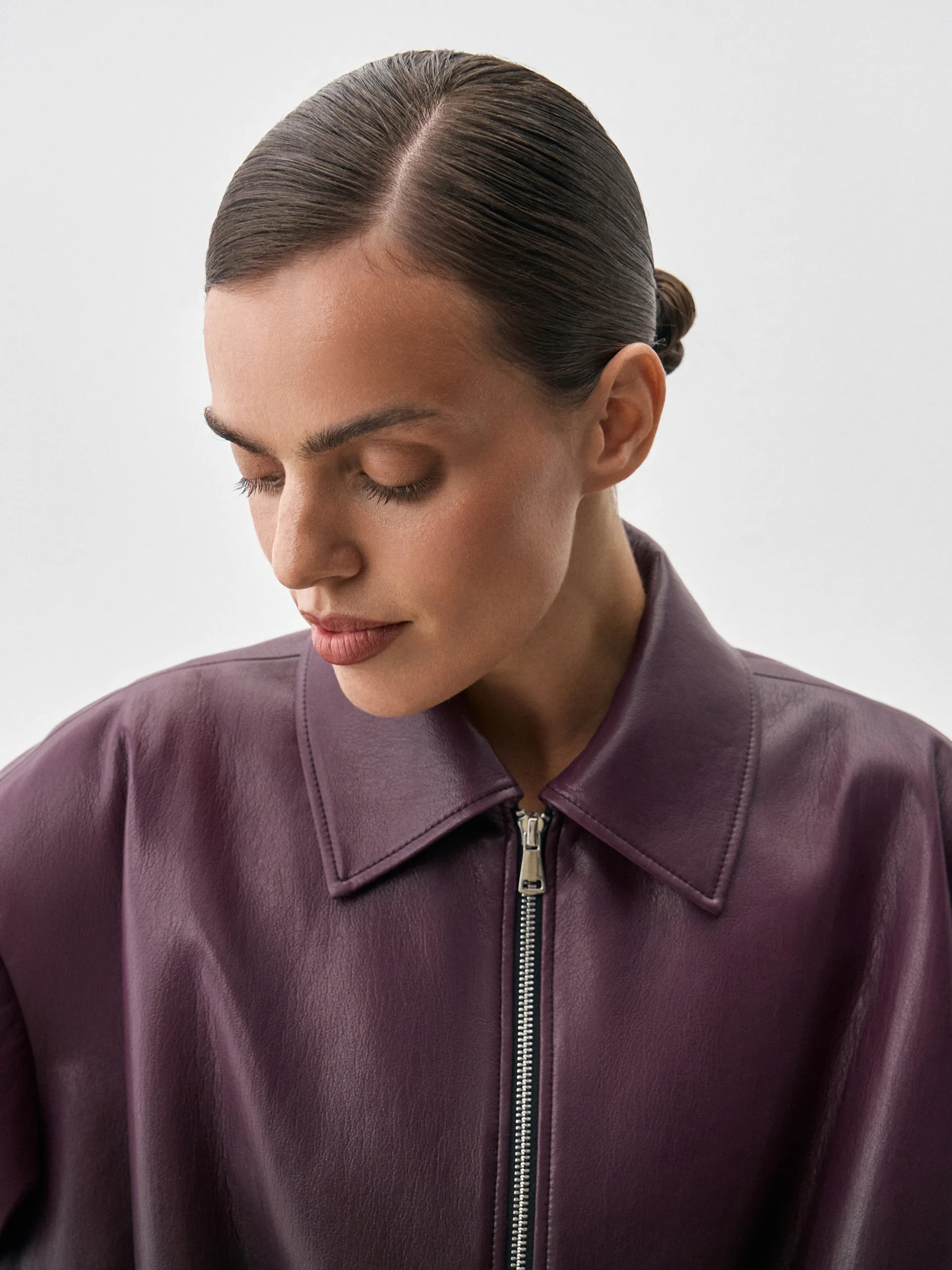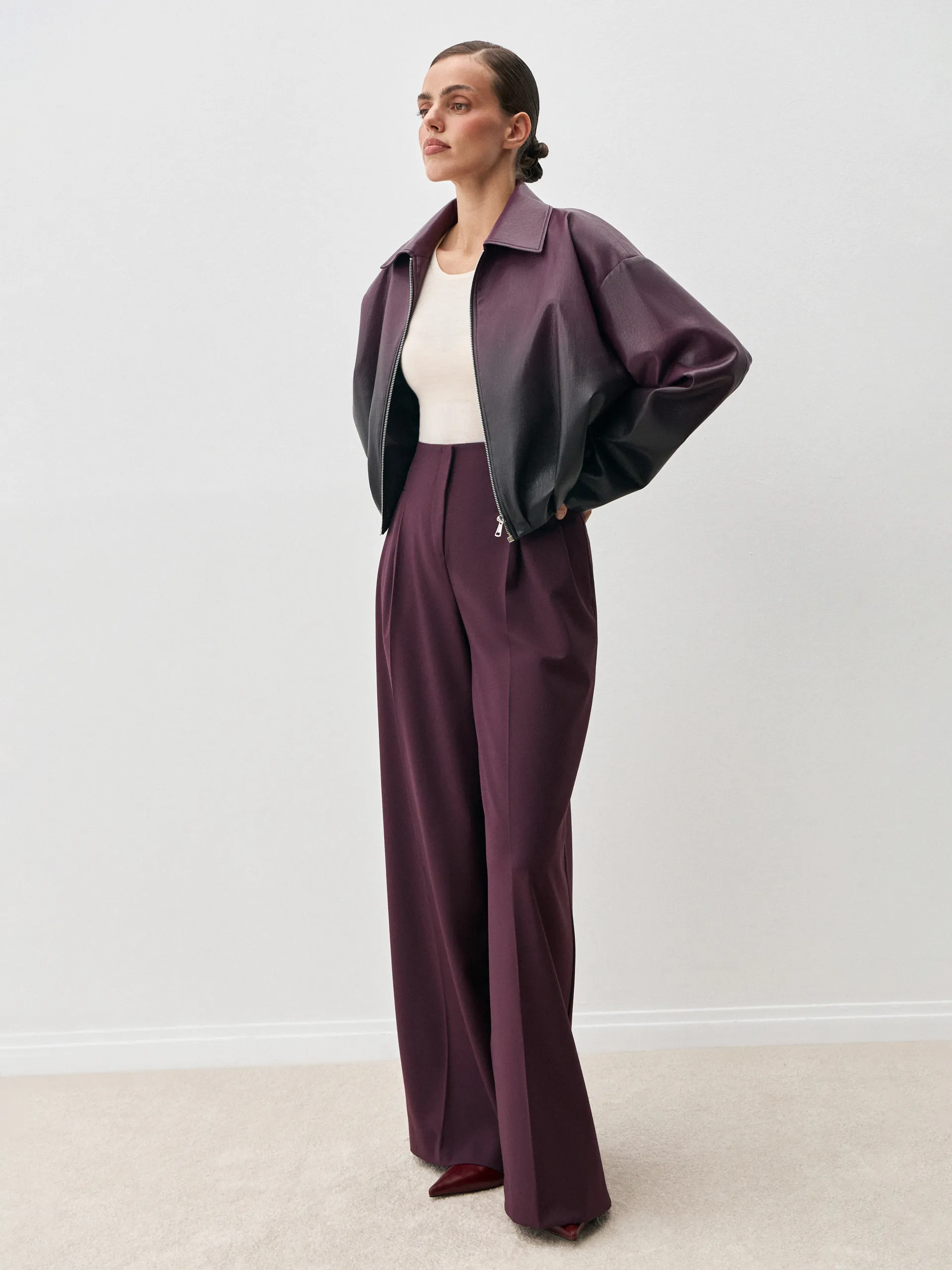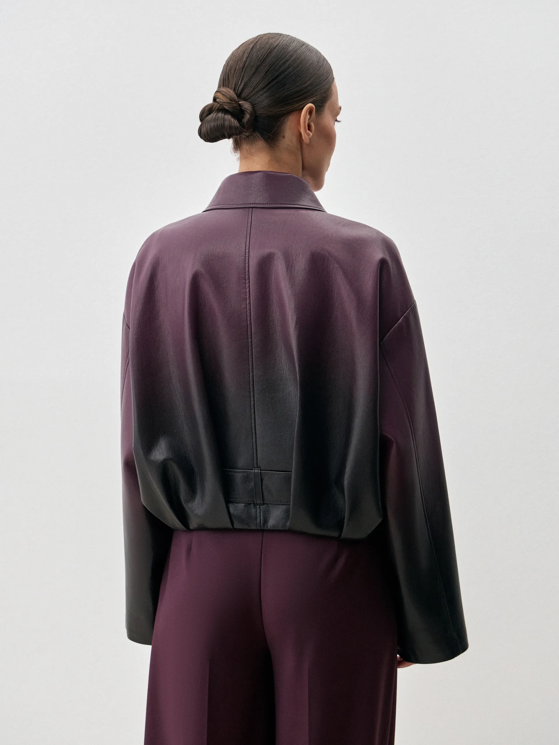 Бомбер Abby. Эффектный бомбер из мягкой премиальной экокожи с уникальным переходом цвета от тёмного к фиолетовому. Укороченный силуэт придаёт образу современный и дерзкий акцент, а гладкая экокожа обеспечивает комфорт и долговечность. Благодаря градиенту модель выглядит выразительно и стильно, легко вписываясь как в повседневные, так и в более эффектные образы. Куртка хорошо сочетается с брюками и юбками из комплектной костюмной ткани, трикотажем в тон, а также с джинсами или лаконичными базовыми элементами гардероба. Это универсальный вариант для городских прогулок, стильных выходов и демисезонных ансамблей.