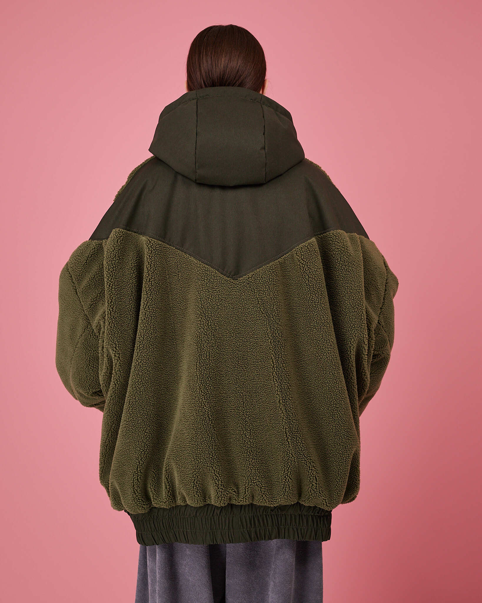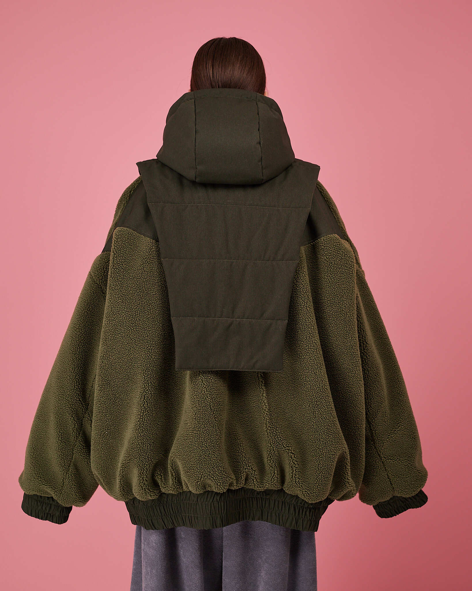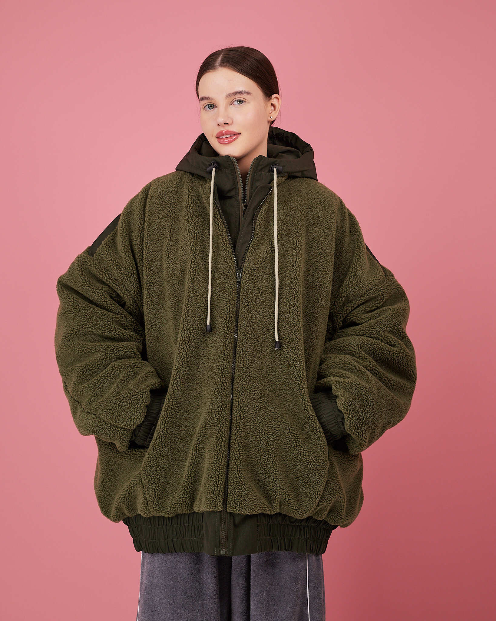 Основная часть бомбера выполнена из шерпы, манжеты, низ и спинка изделия выполнены из плащевой водоотталкивающей ткани. Утеплитель альполюкс 100.