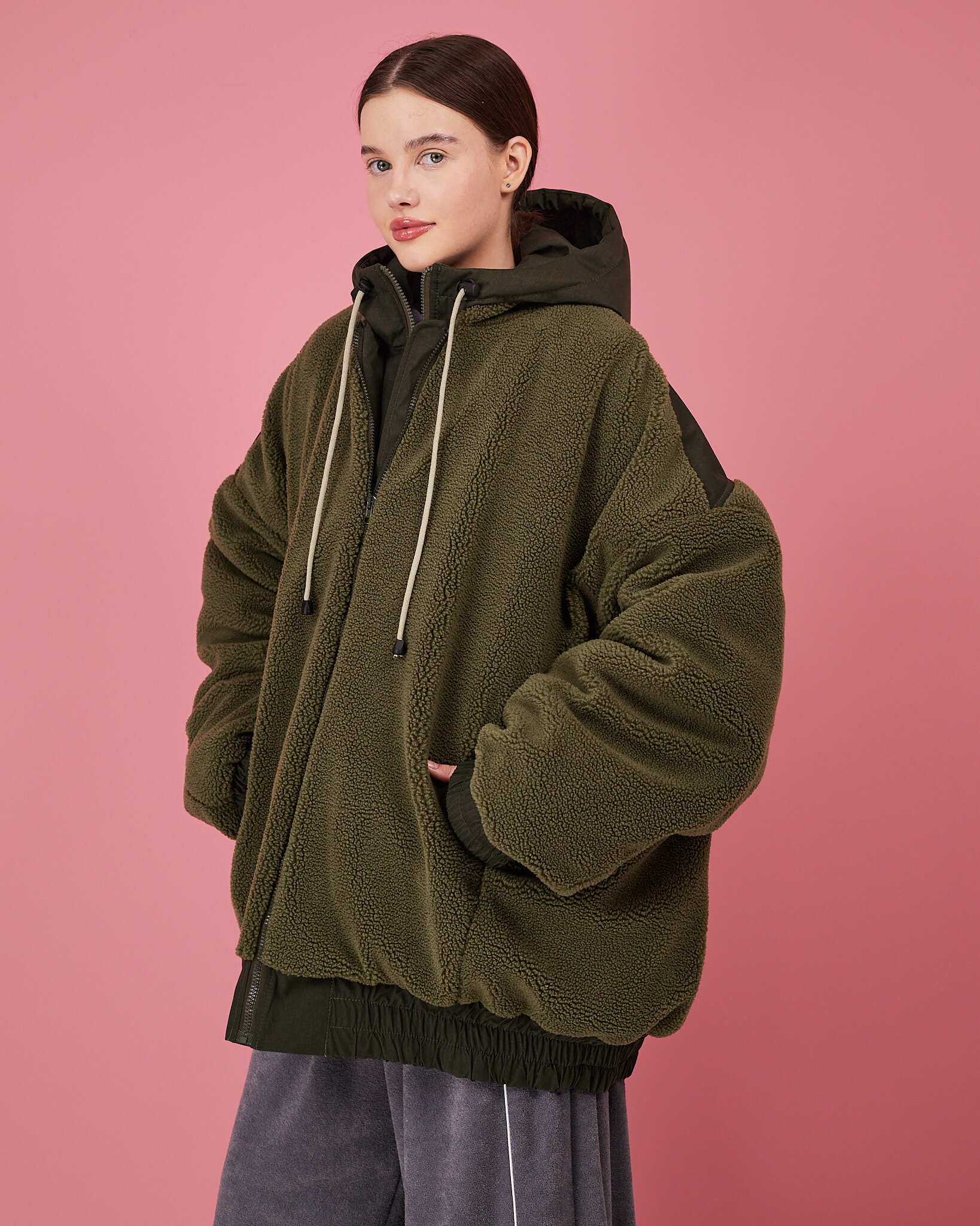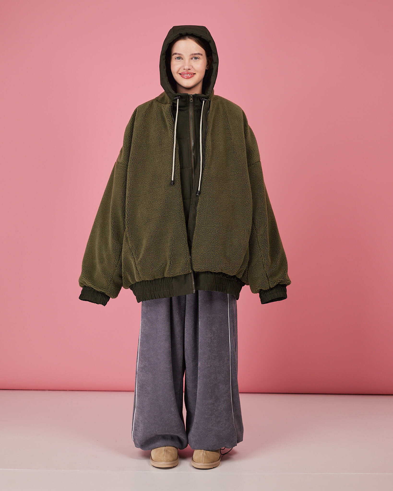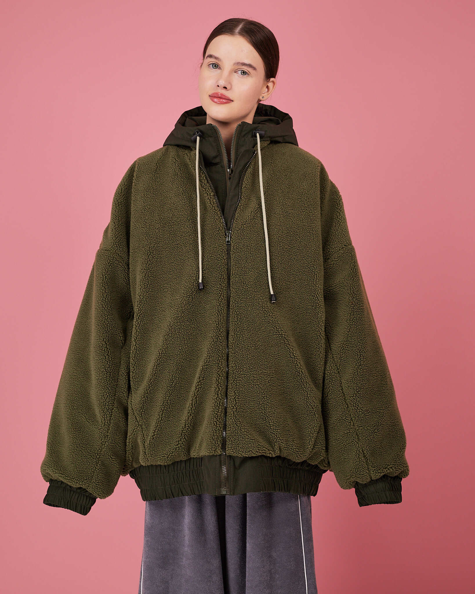 Основная часть бомбера выполнена из шерпы, манжеты, низ и спинка изделия выполнены из плащевой водоотталкивающей ткани. Утеплитель альполюкс 100.