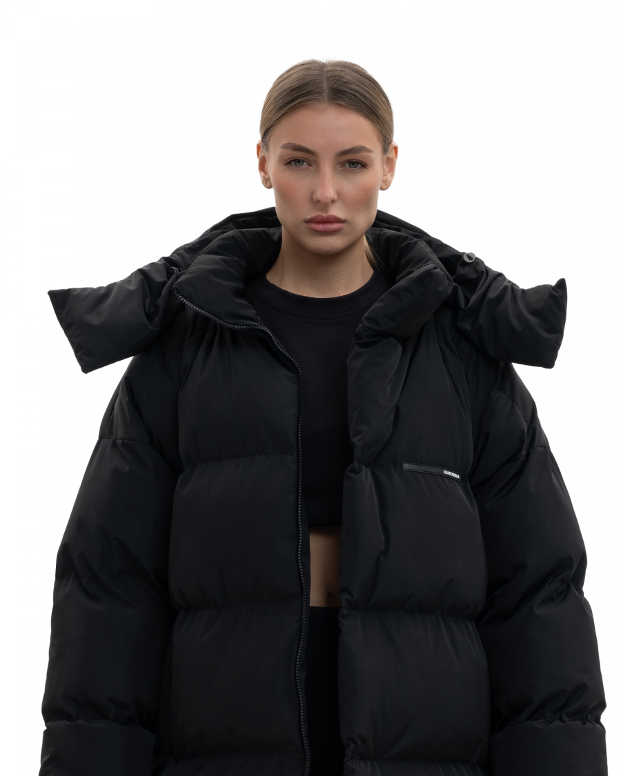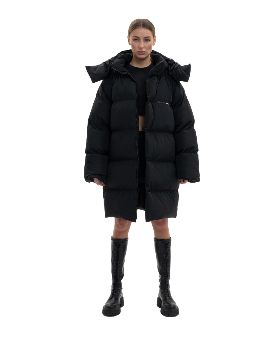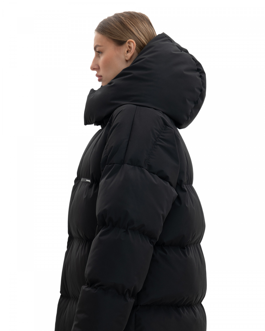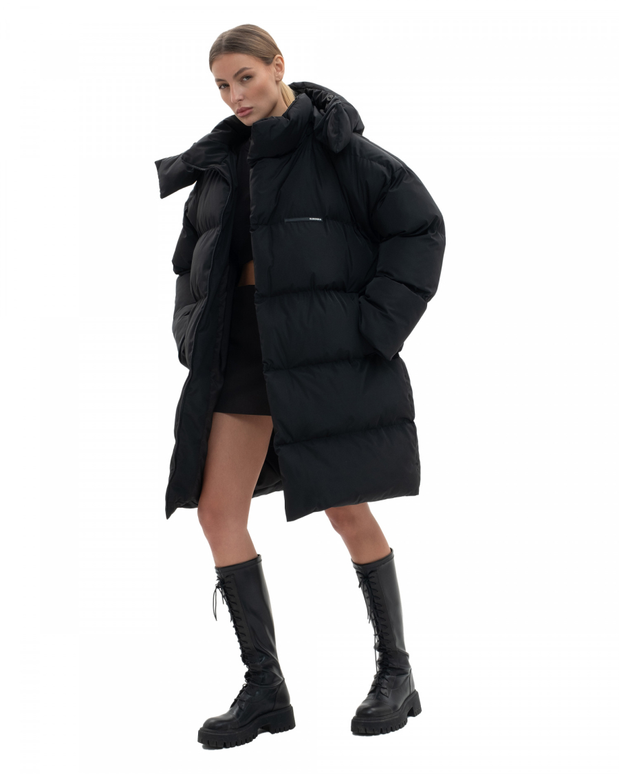 Базовый Удлиненный пуховик оверсайз кроя из водооталкивающей мембраны с защитой от ветра.