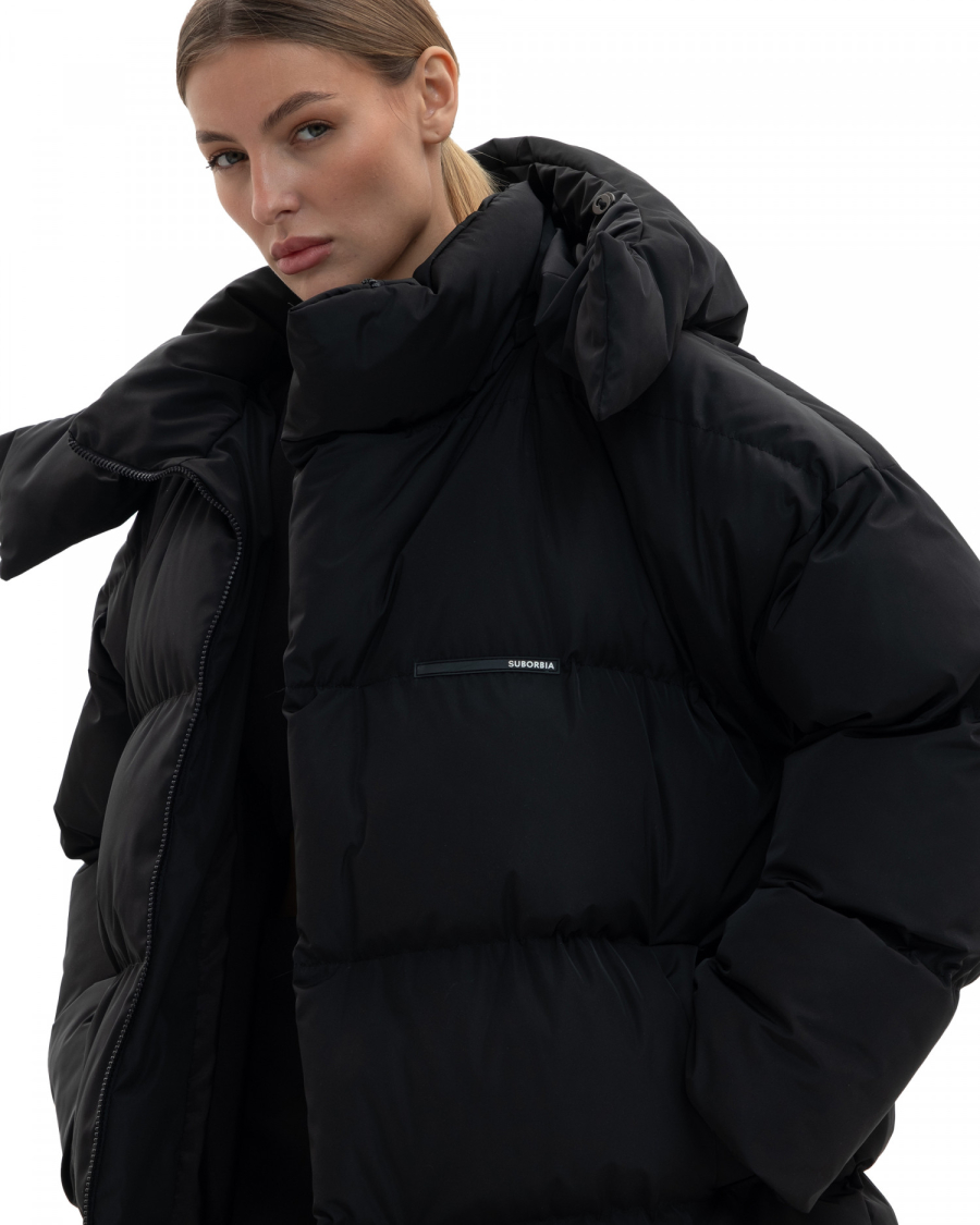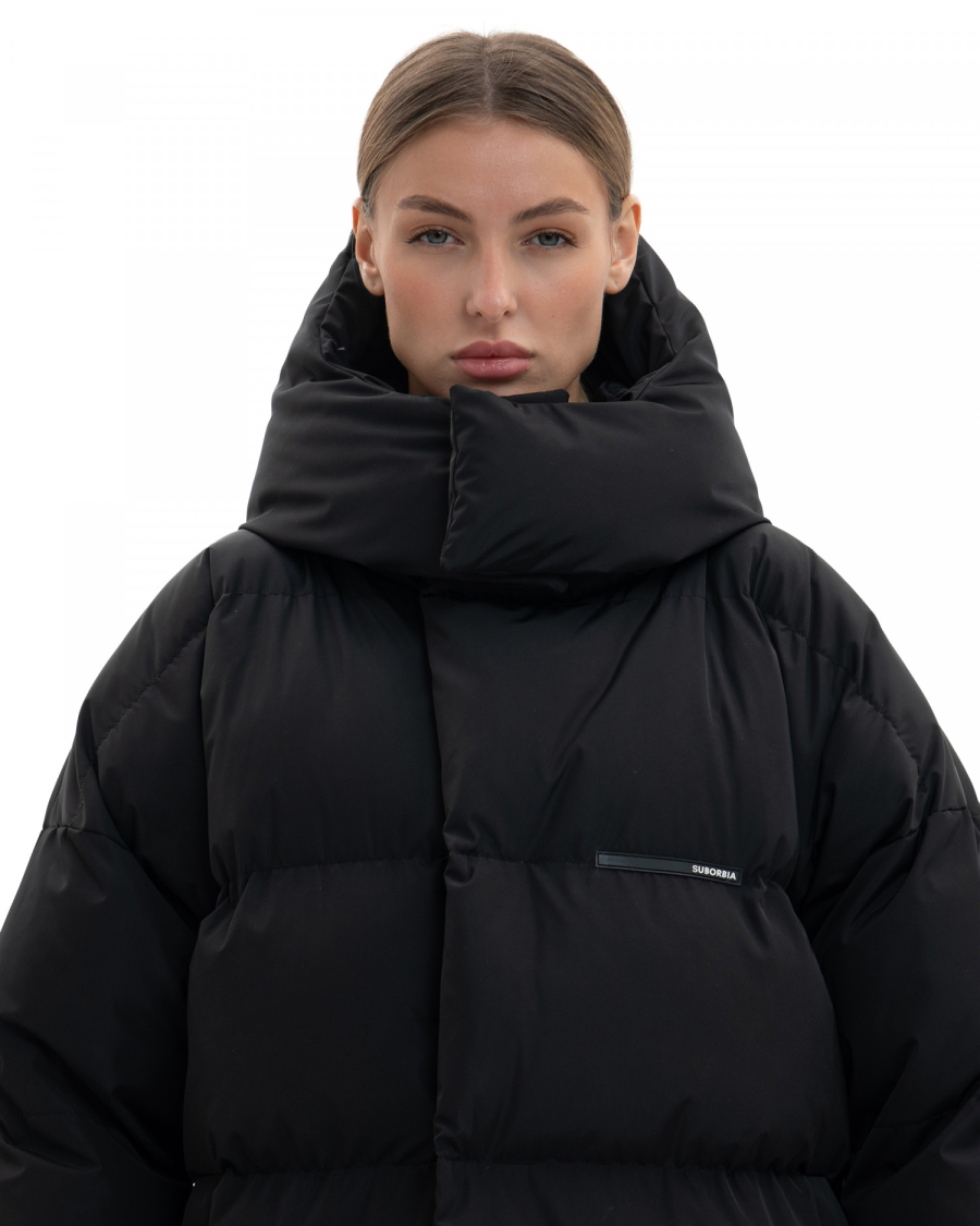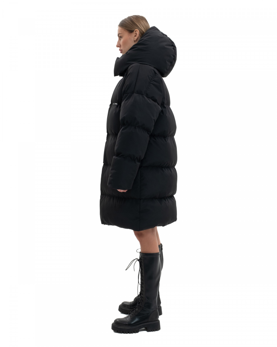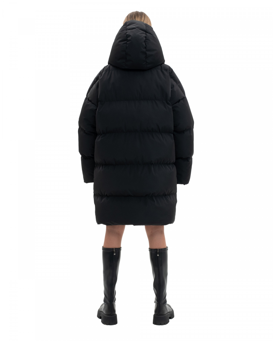 Базовый Удлиненный пуховик оверсайз кроя из водооталкивающей мембраны с защитой от ветра.