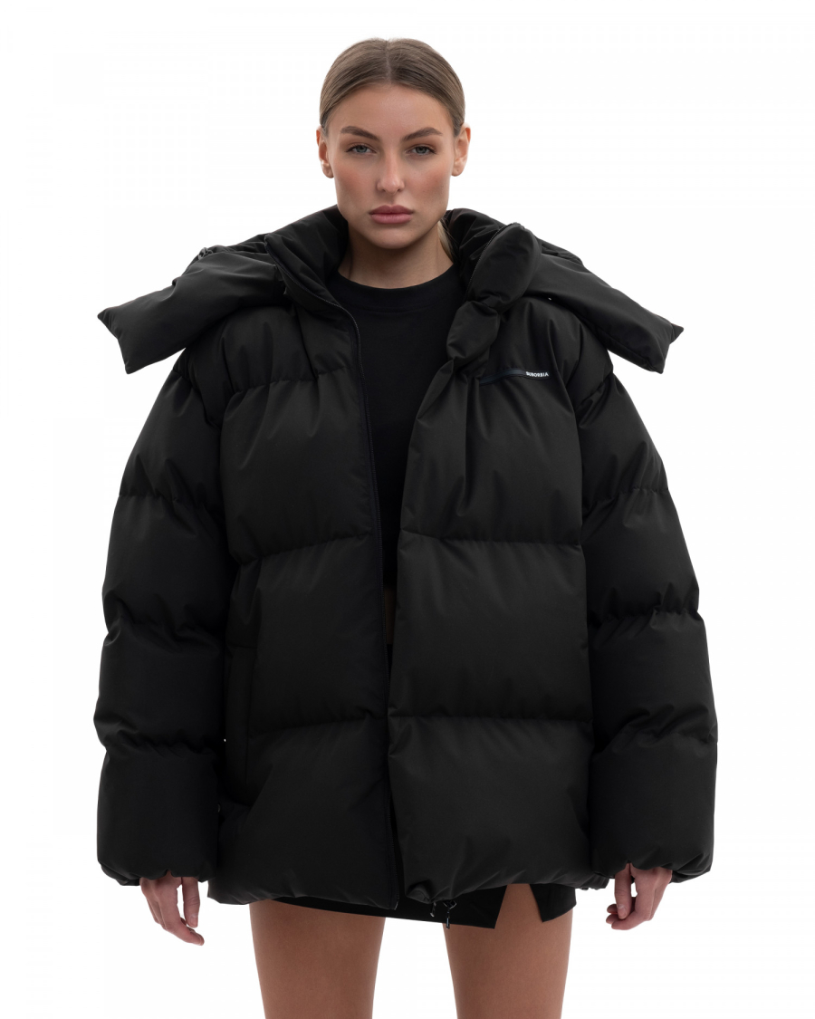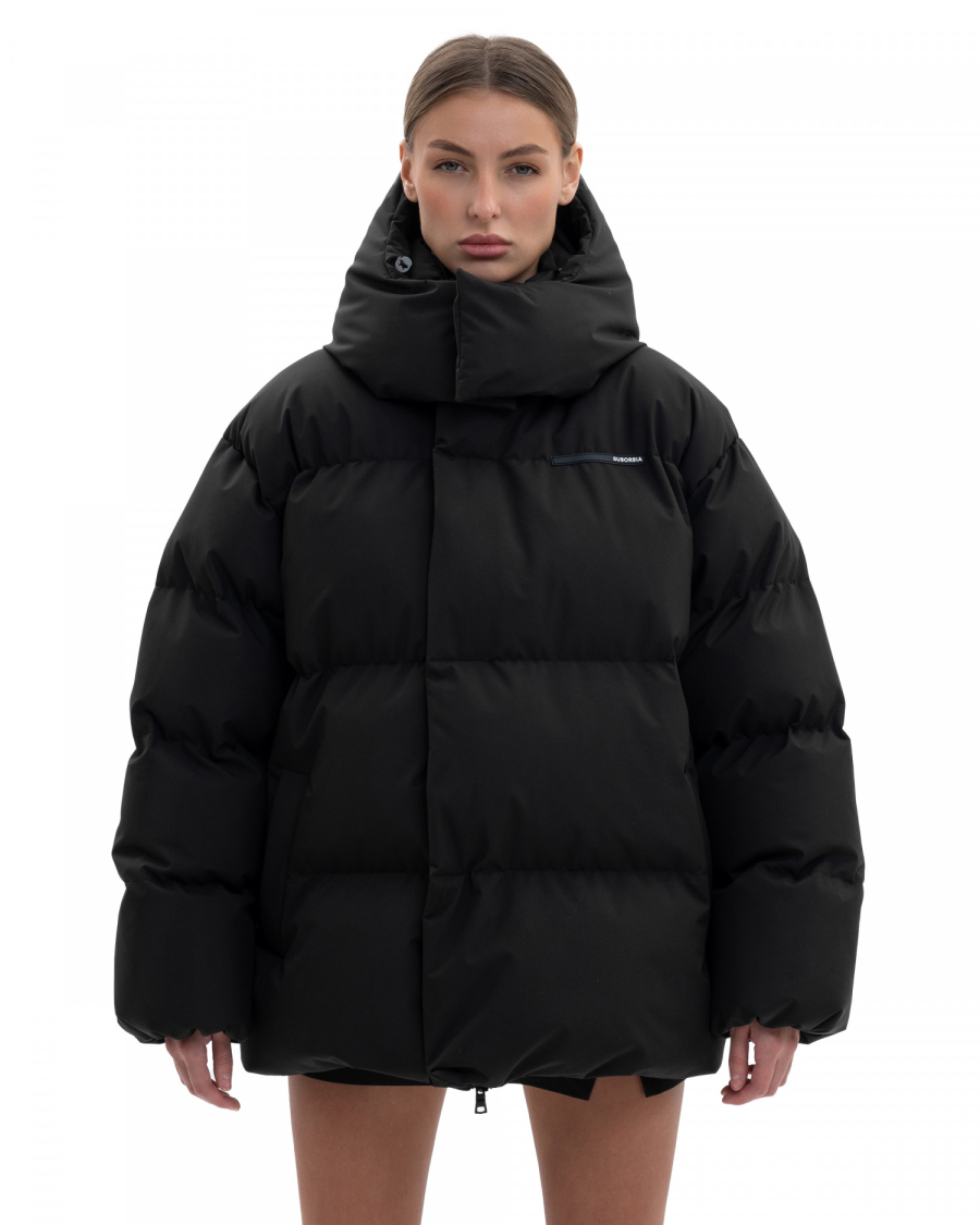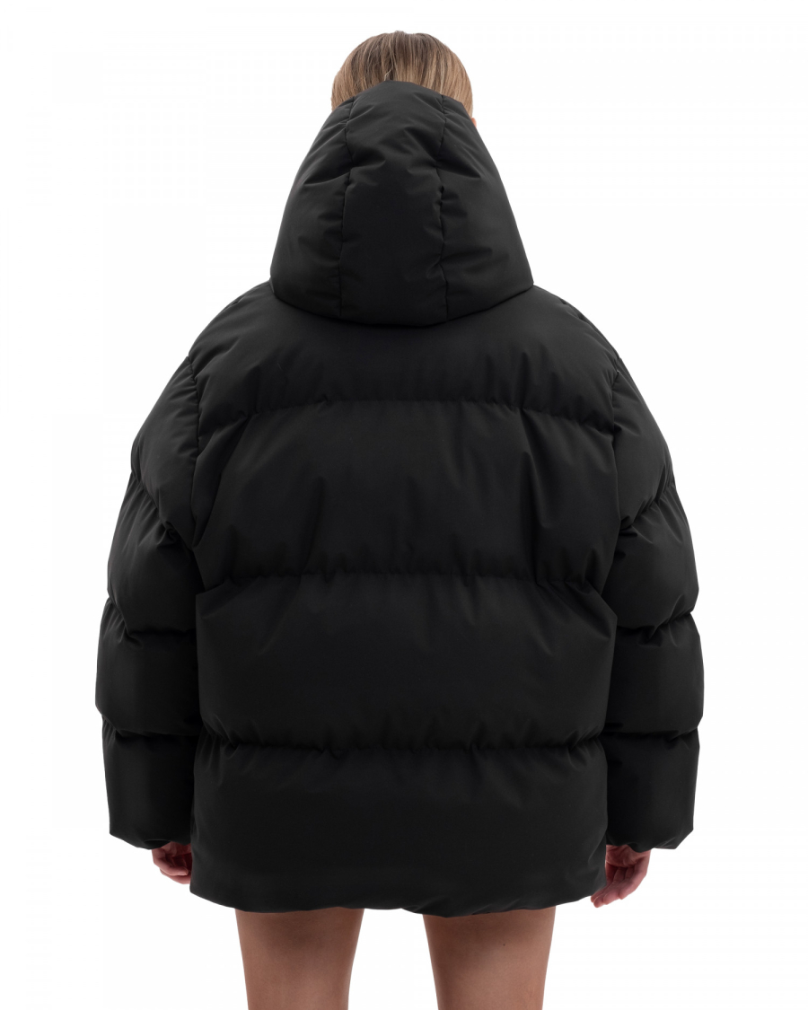 Базовый пуховик средней длины оверсайз кроя из водооталкивающей мембраны с защитой от ветра.