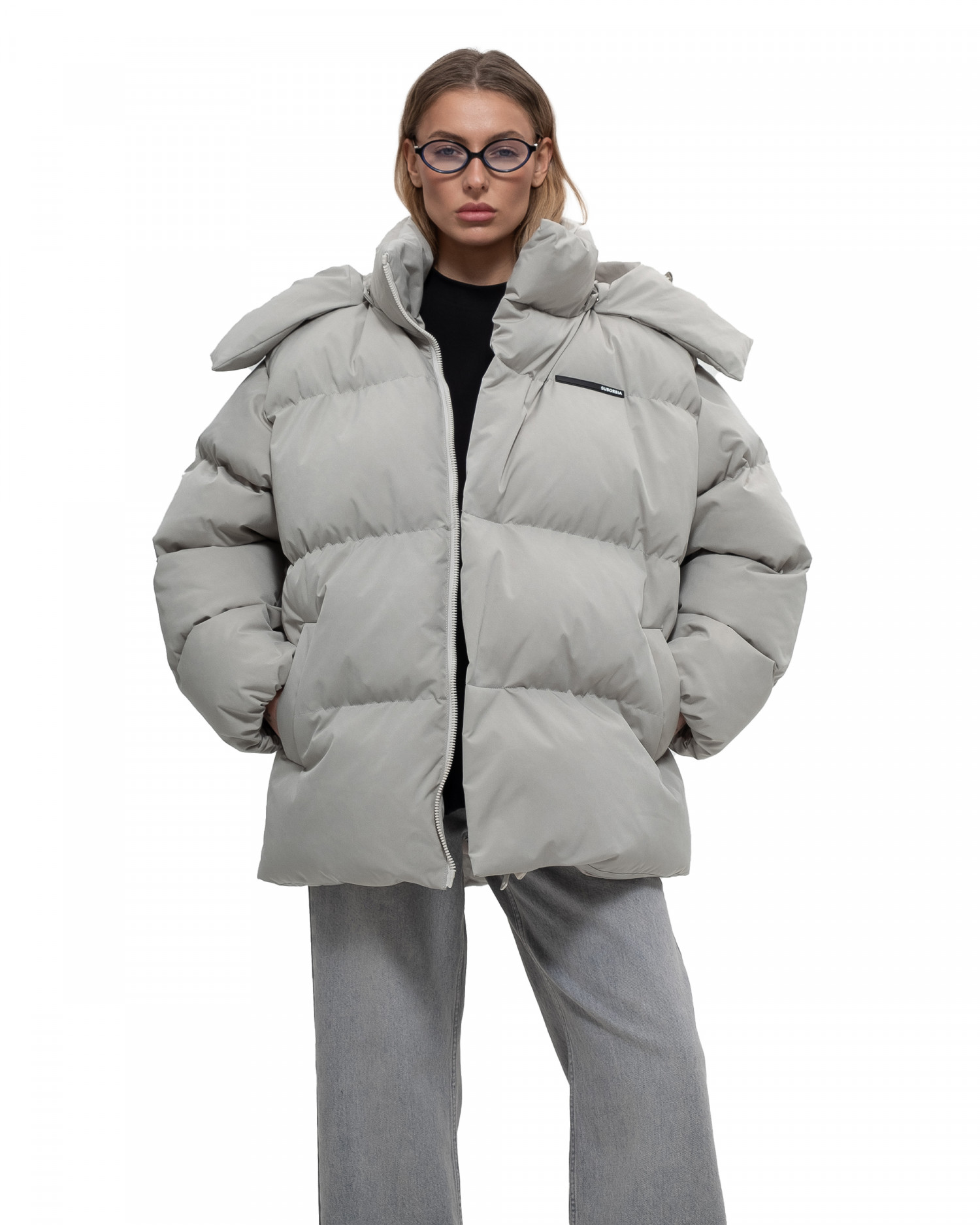 Спущенная линия плеча, кулиска для регулировки по низу изделия, глубокие карманы, брендированная фурнитура, ветрозащитные планки на магнитах.