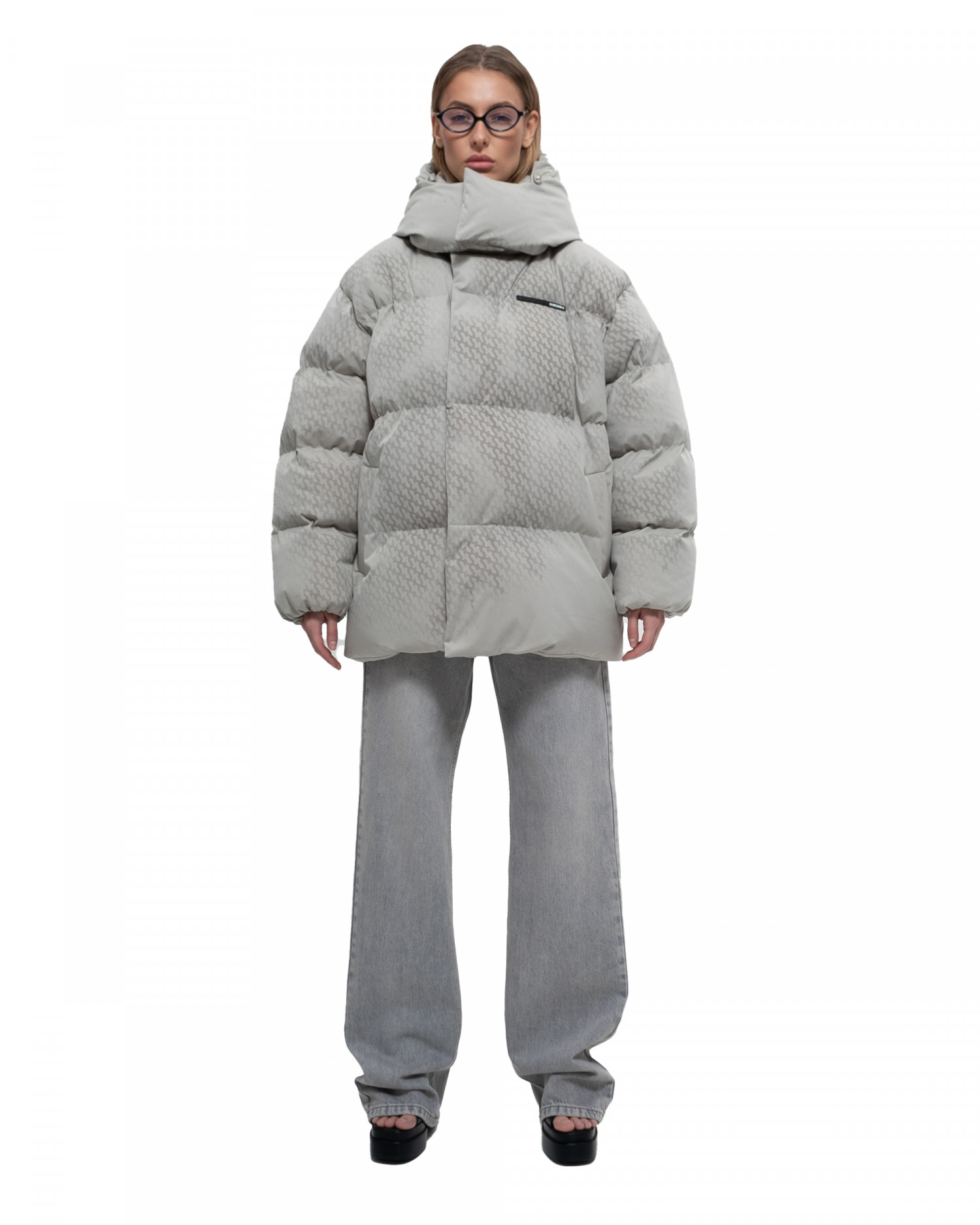 Пуховик средней длины оверсайз кроя из мембраны с оригинальным принтом.