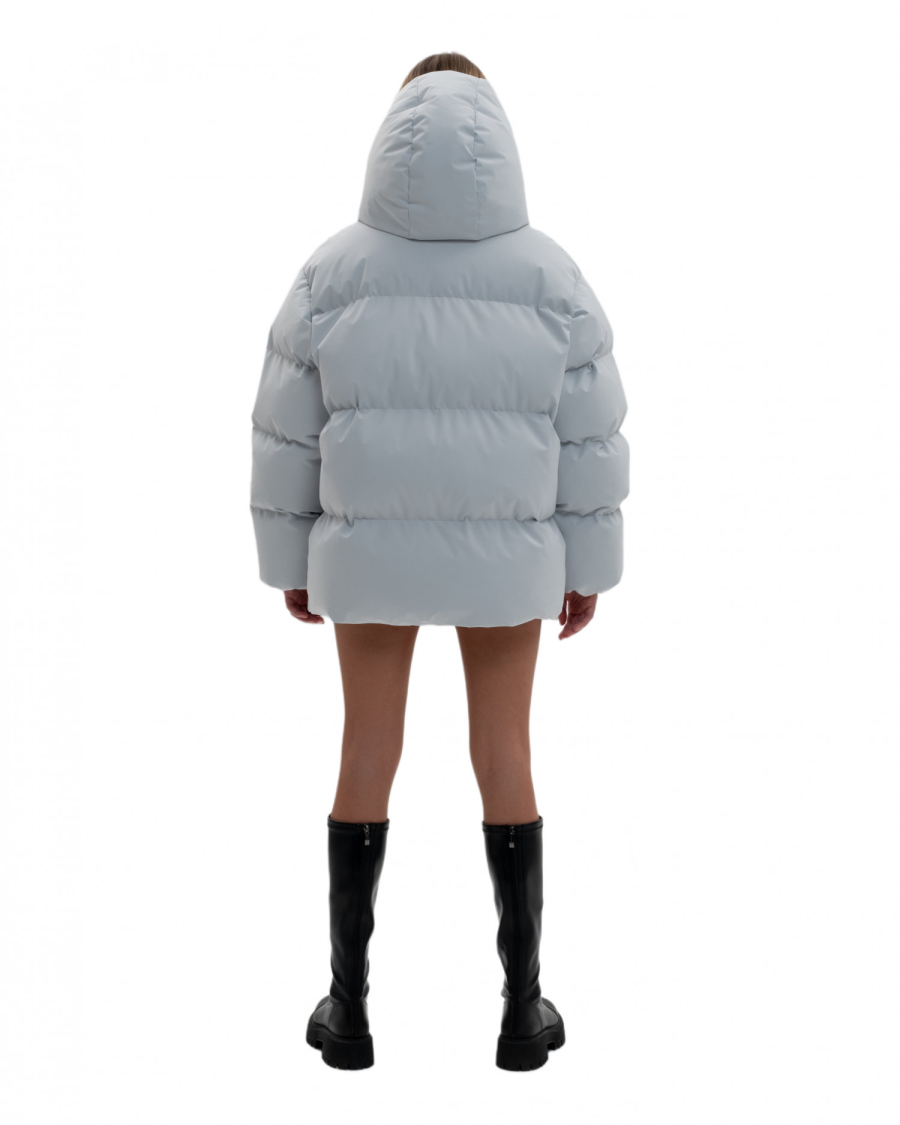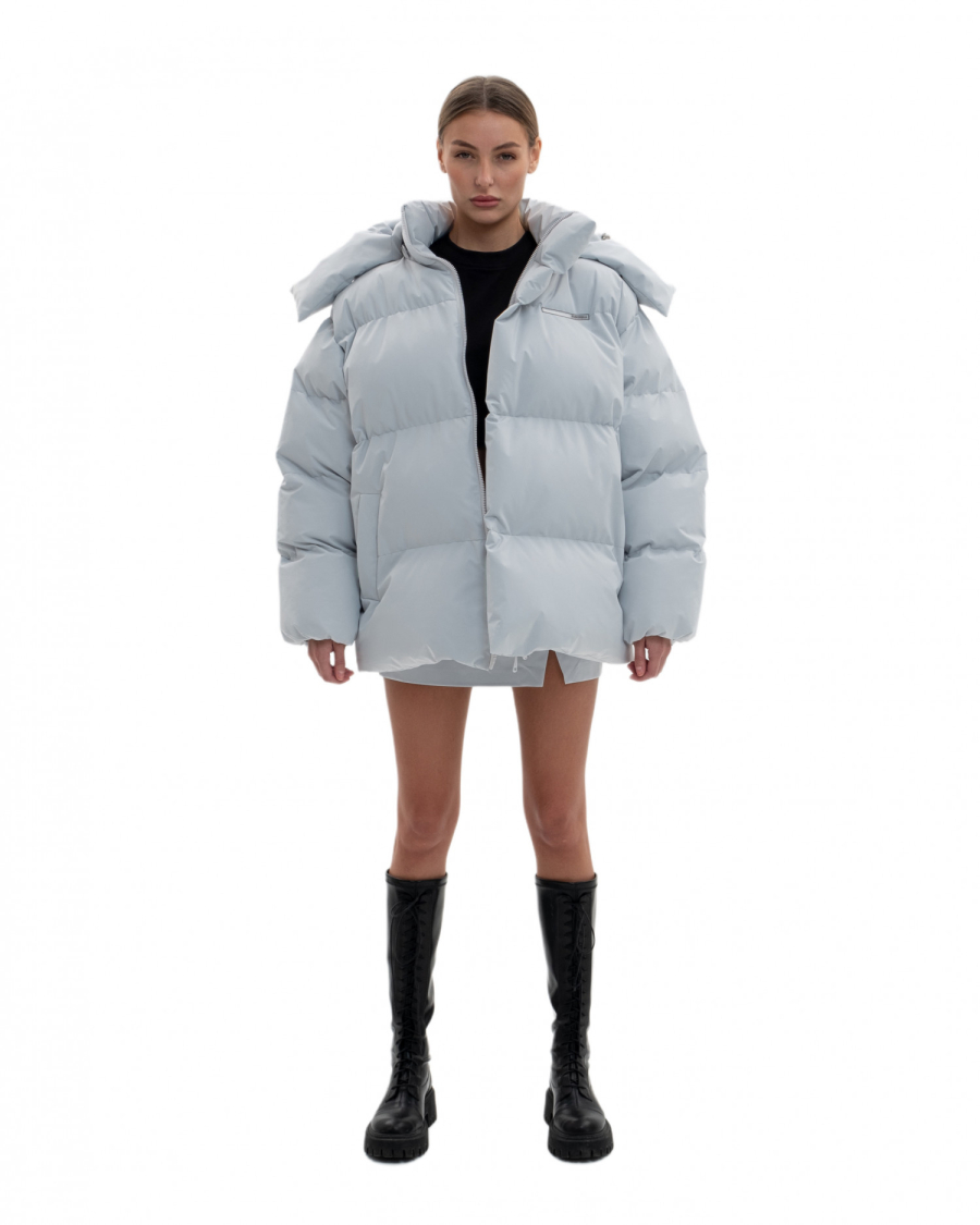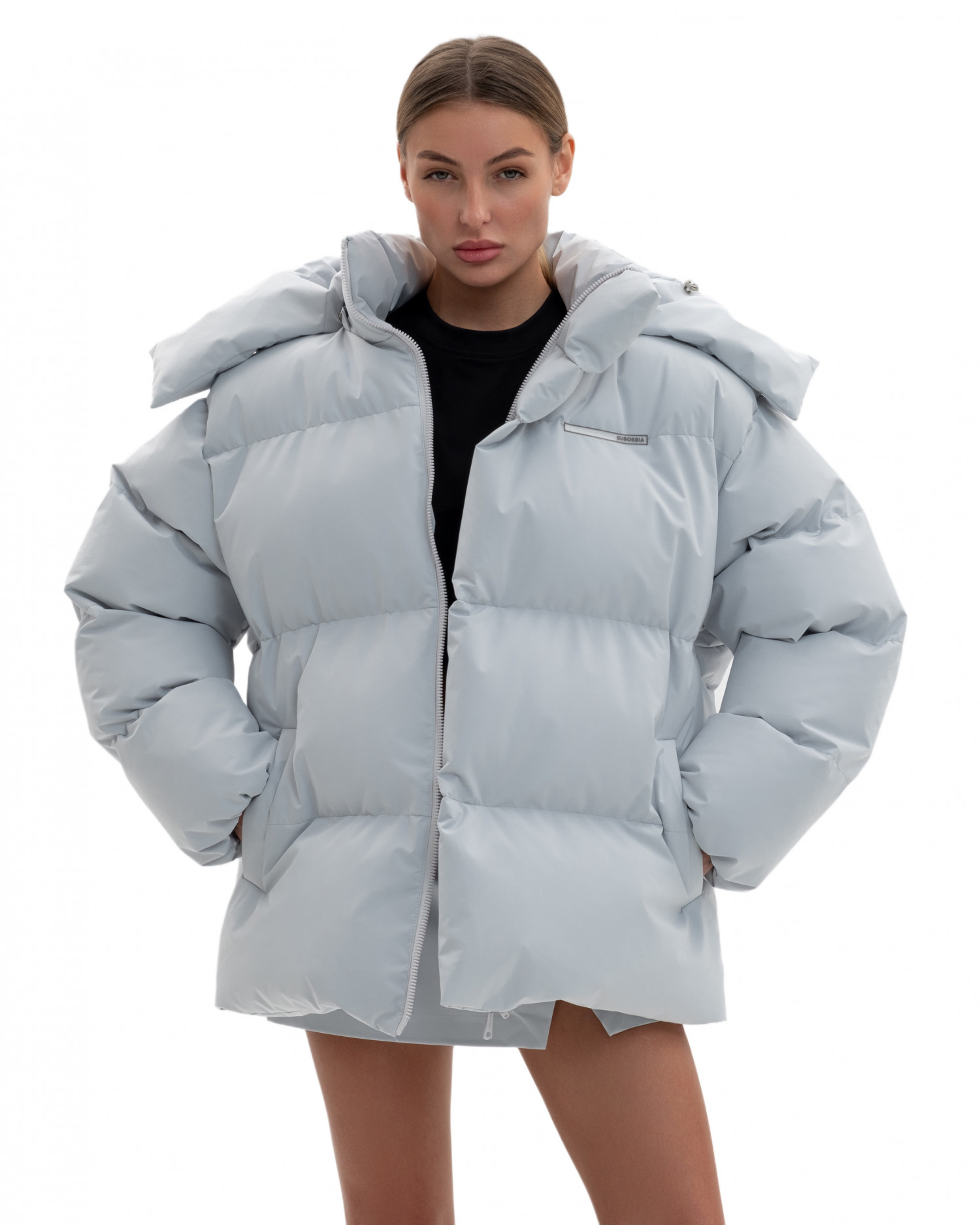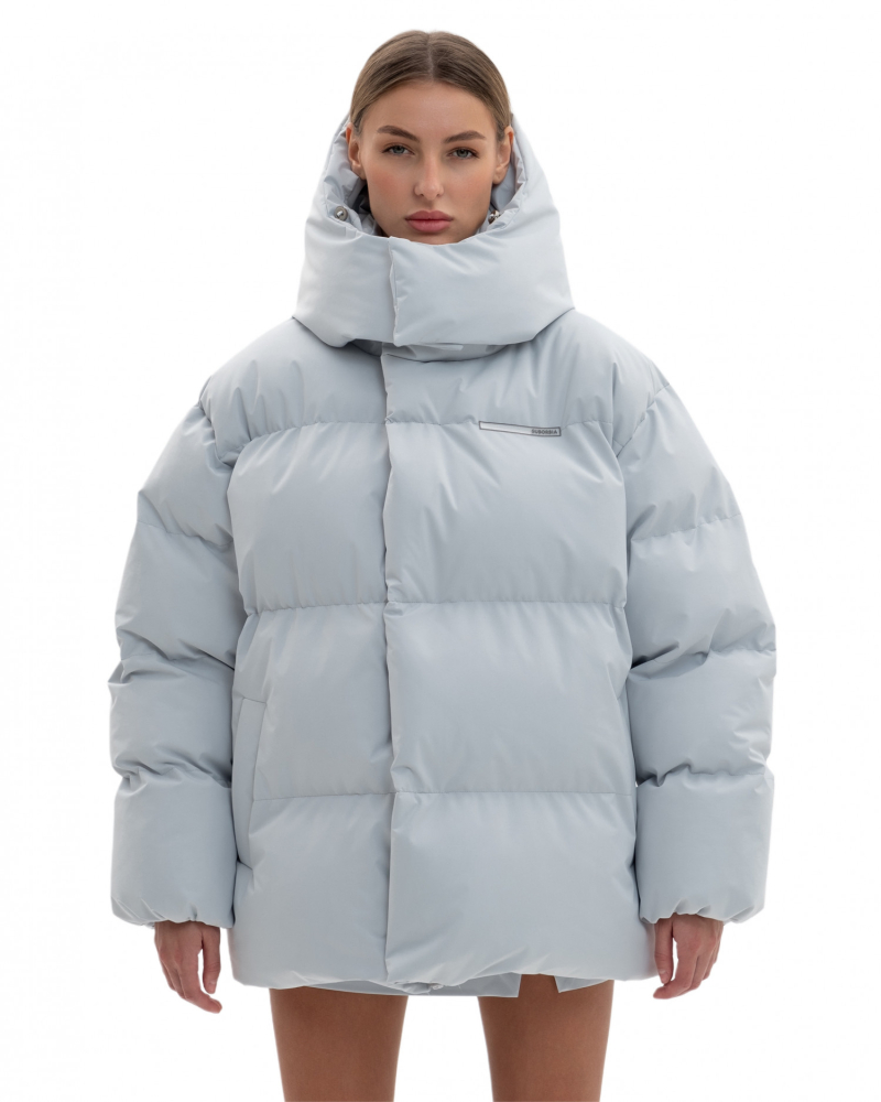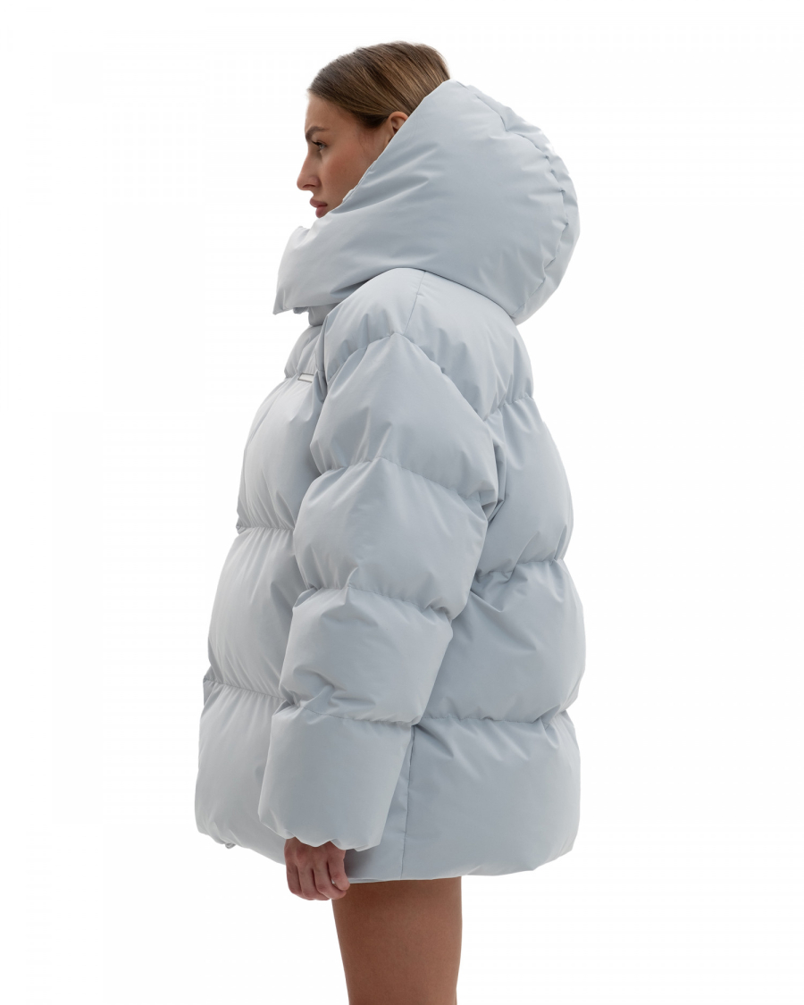 Базовый пуховик средней длины оверсайз кроя из водооталкивающей мембраны с защитой от ветра.