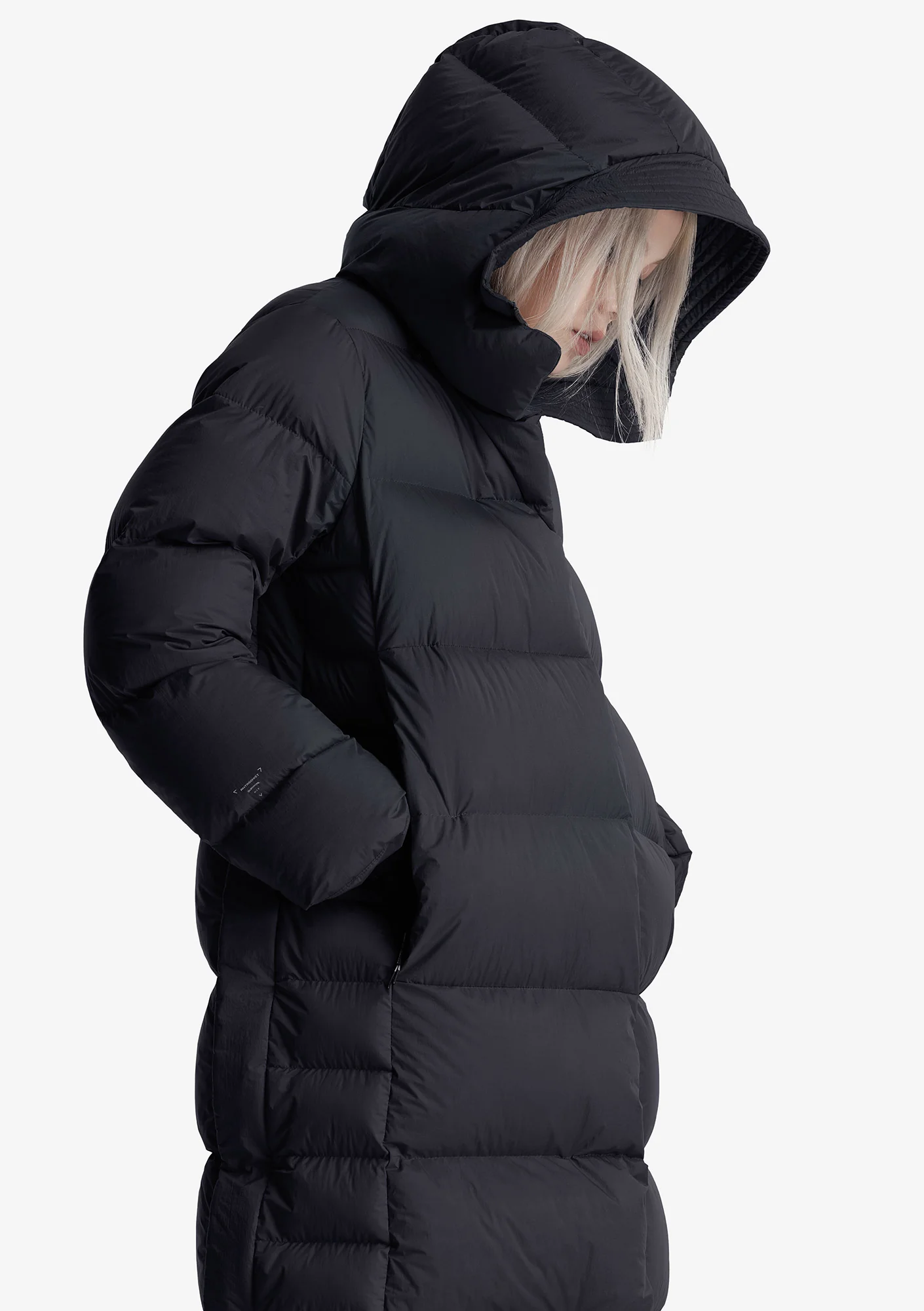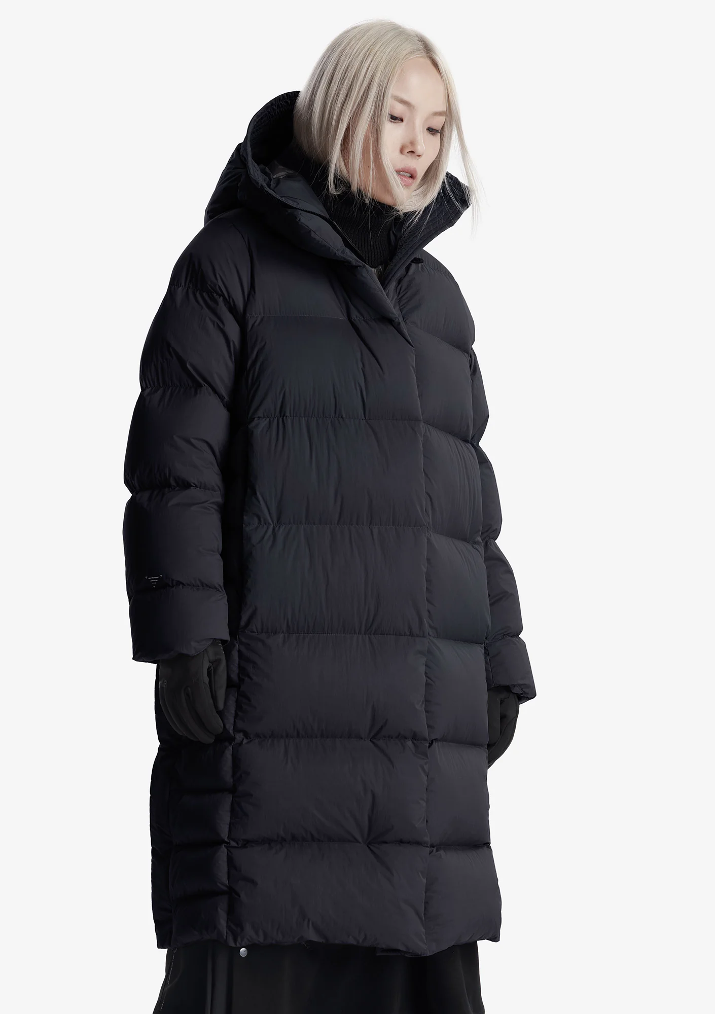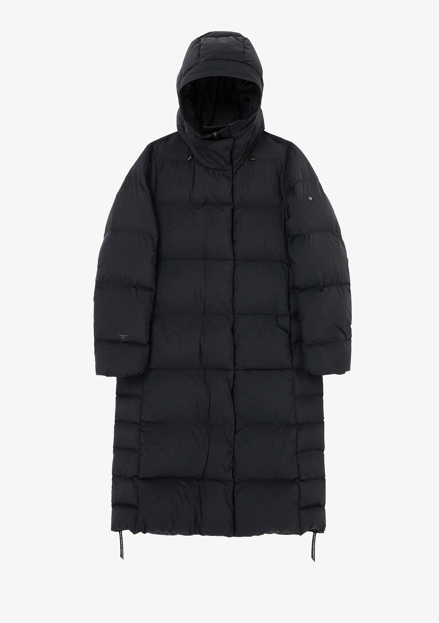 Длинный пуховик AITKEN из водостойкой ткани и натурального пуха с добавлением эко волокон из переработанного пластика.