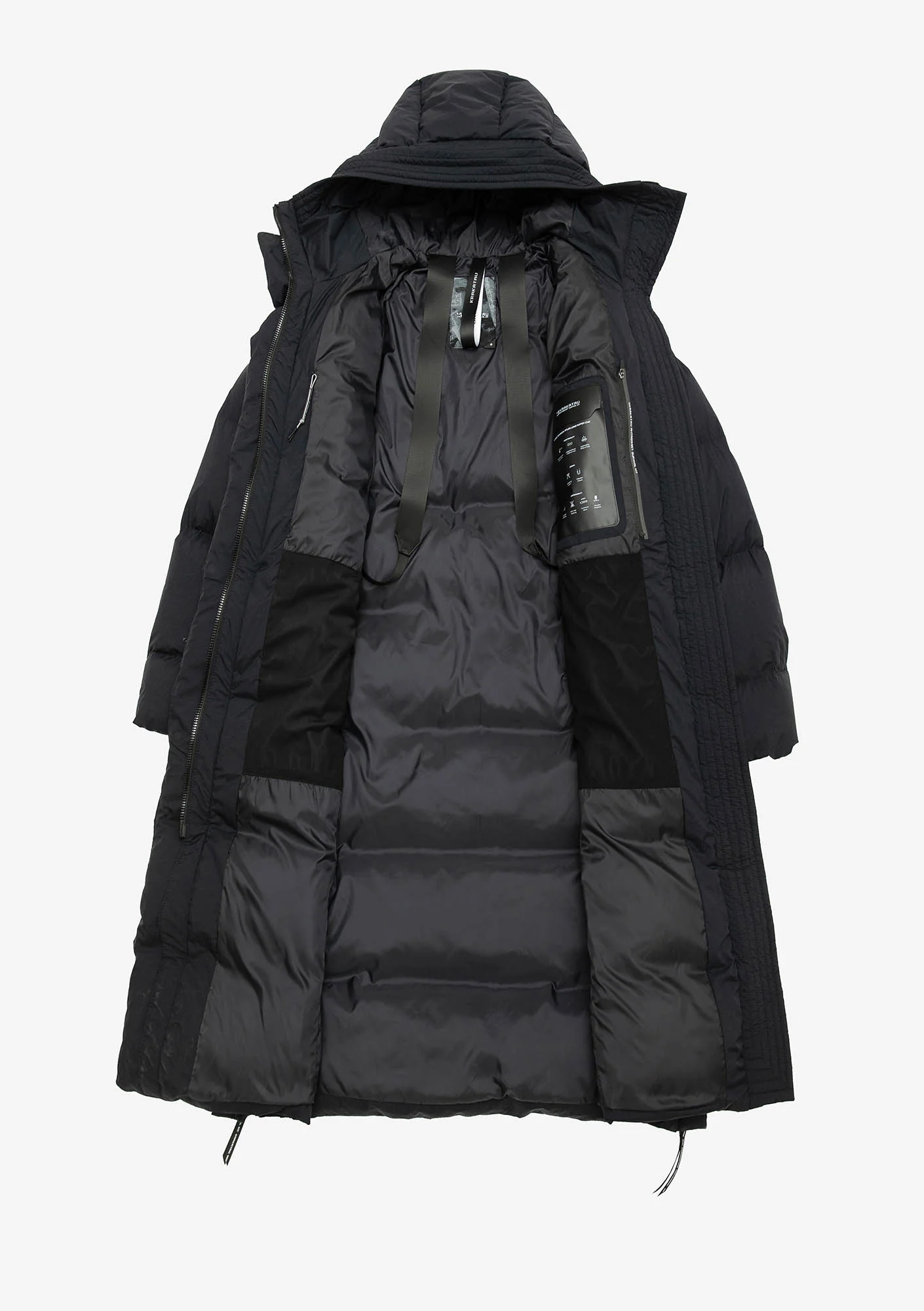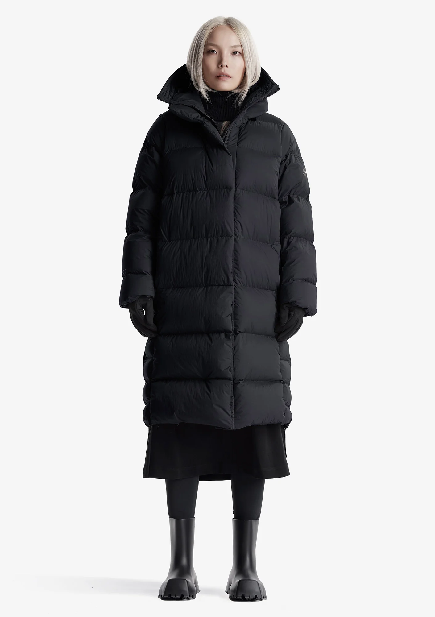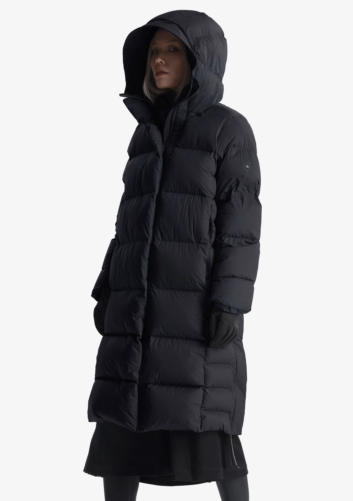 Длинный пуховик AITKEN из водостойкой ткани и натурального пуха с добавлением эко волокон из переработанного пластика.