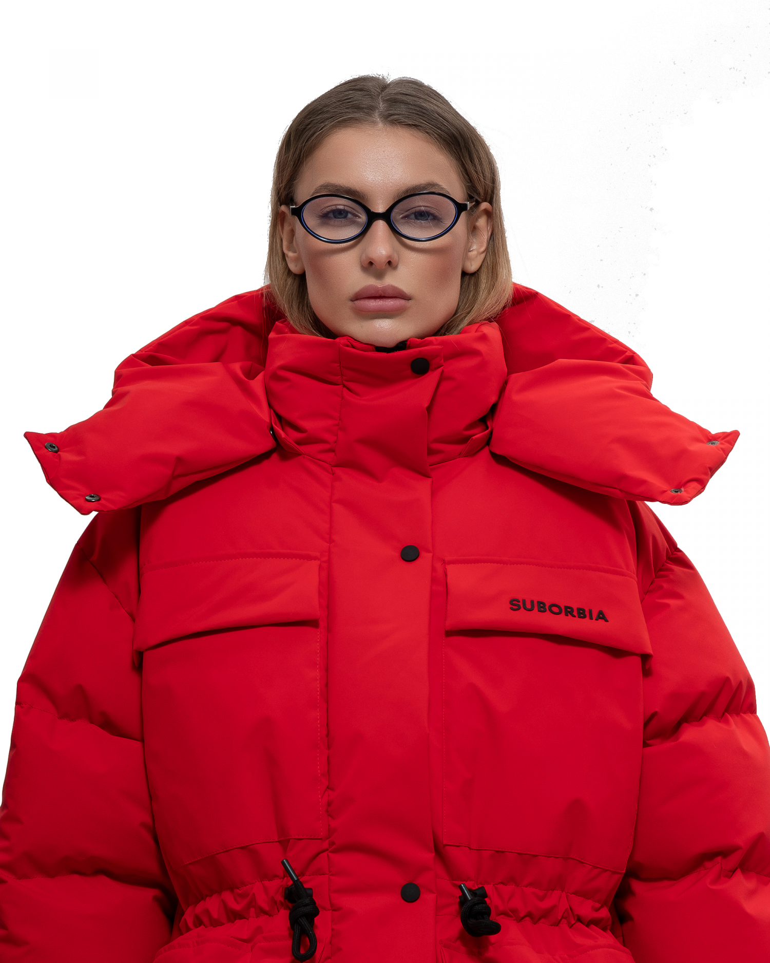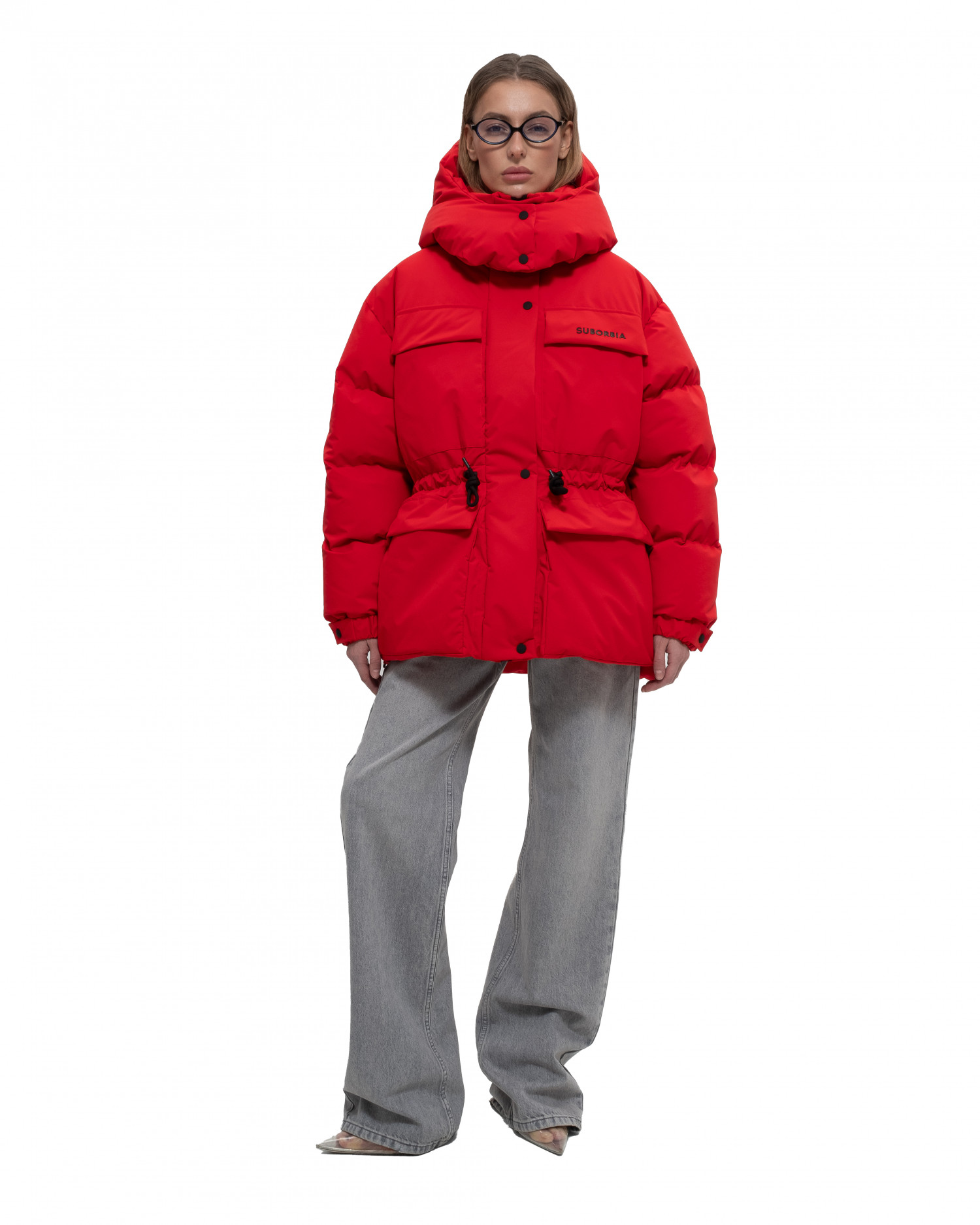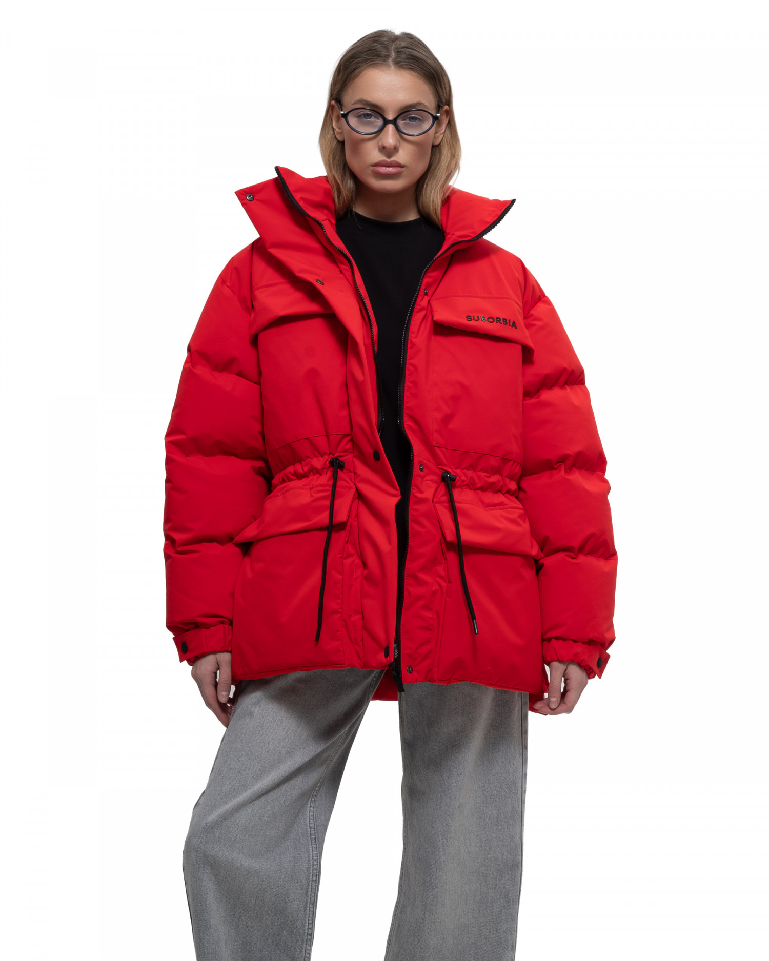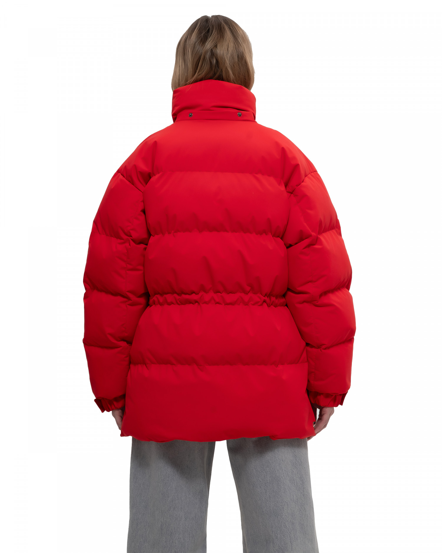 Пуховик оверсайз кроя с регулируемой кулиской на талии и капюшоном из высокотехнологичной мембраны.