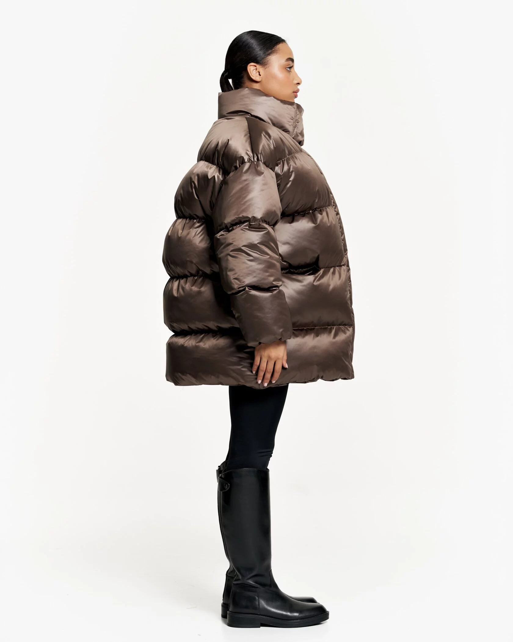 Высокий воротник-стойка, который защищает от ветра и создает лаконичный силуэт.