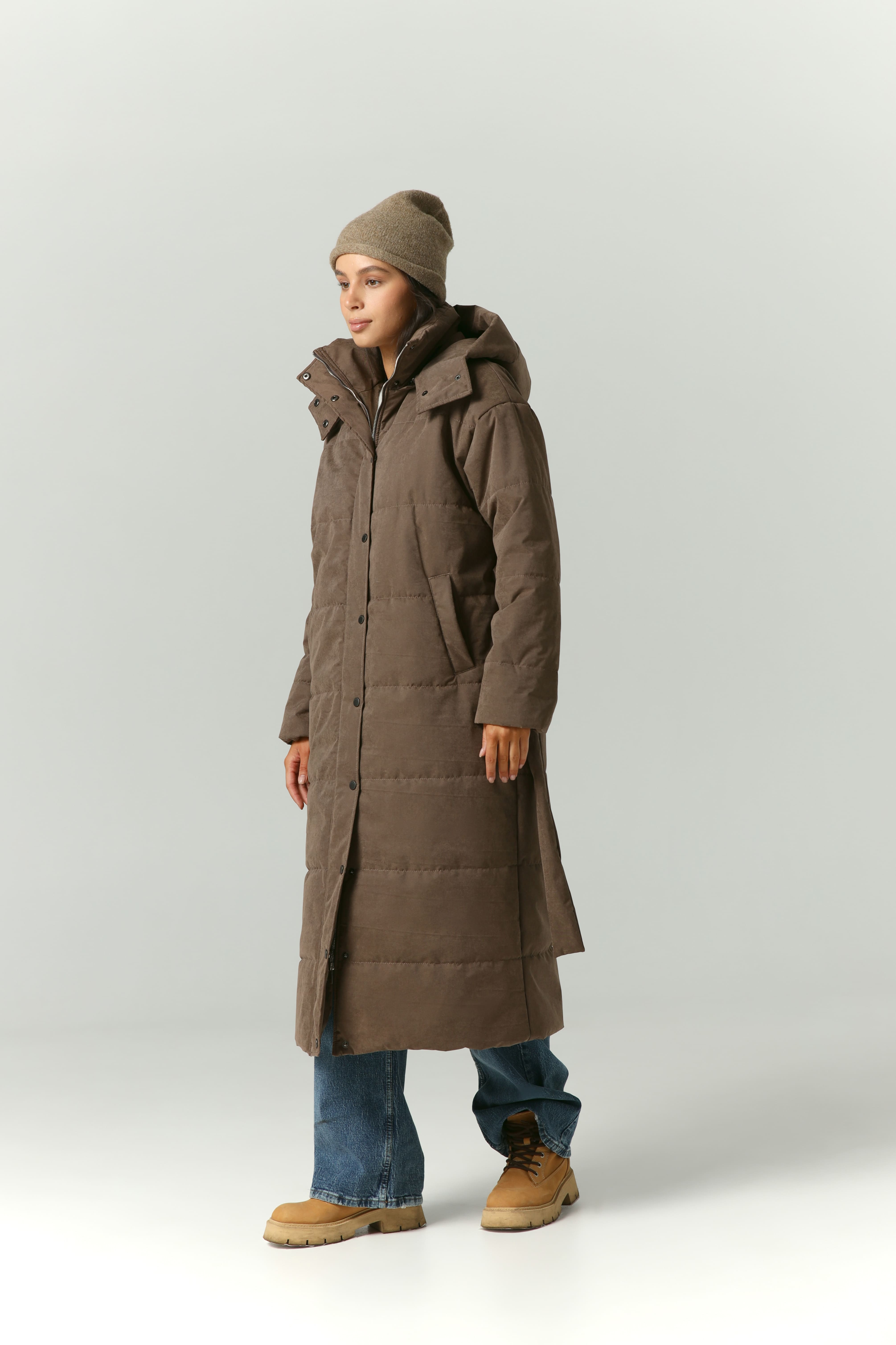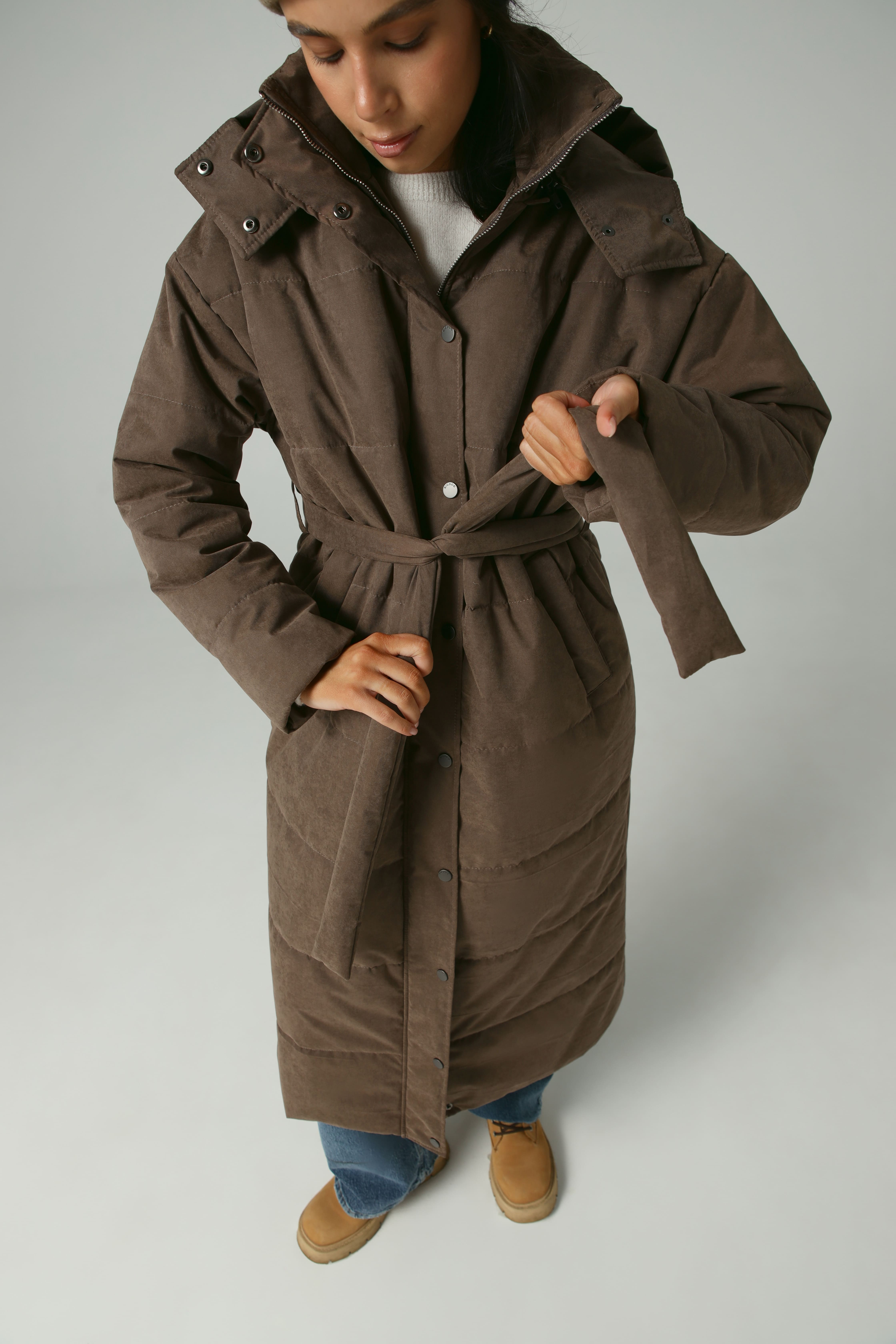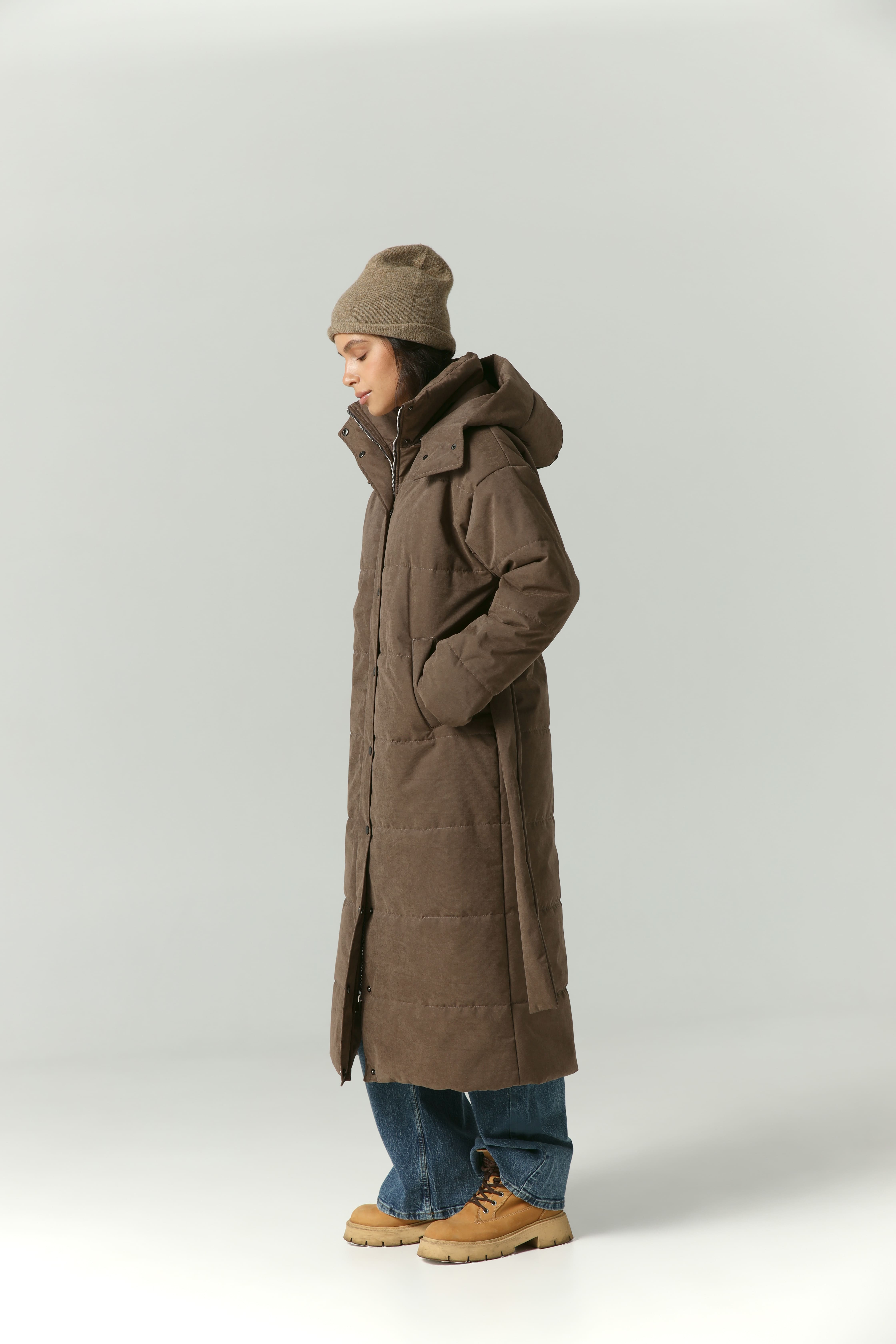 Пуховик удлиненный из мембраны с велюровым эффектом