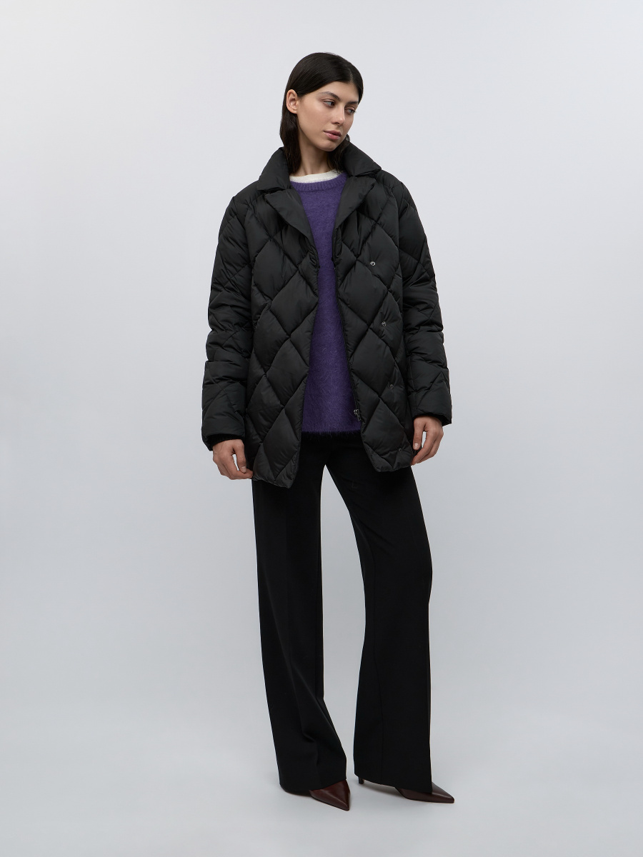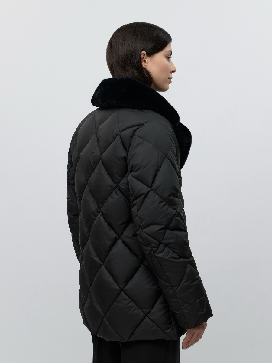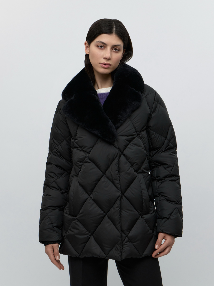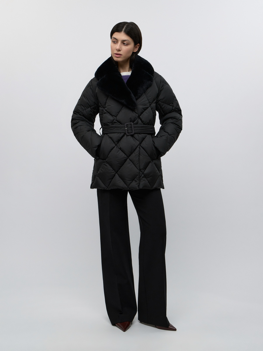 Классическая пуховая куртка с ромбовидной стежкой и широким английским воротником, декорированным несъемным мехом кролика рекс. За счет втачного плеча, полуприлегающего силуэта и тканевого пояса на шлевках подчеркивает фигуру даже в зимние холода. Манжеты в виде эластичной резинки, двойная застежка на металлическую молнию и ряд кнопок — для дополнительной защиты от холода.