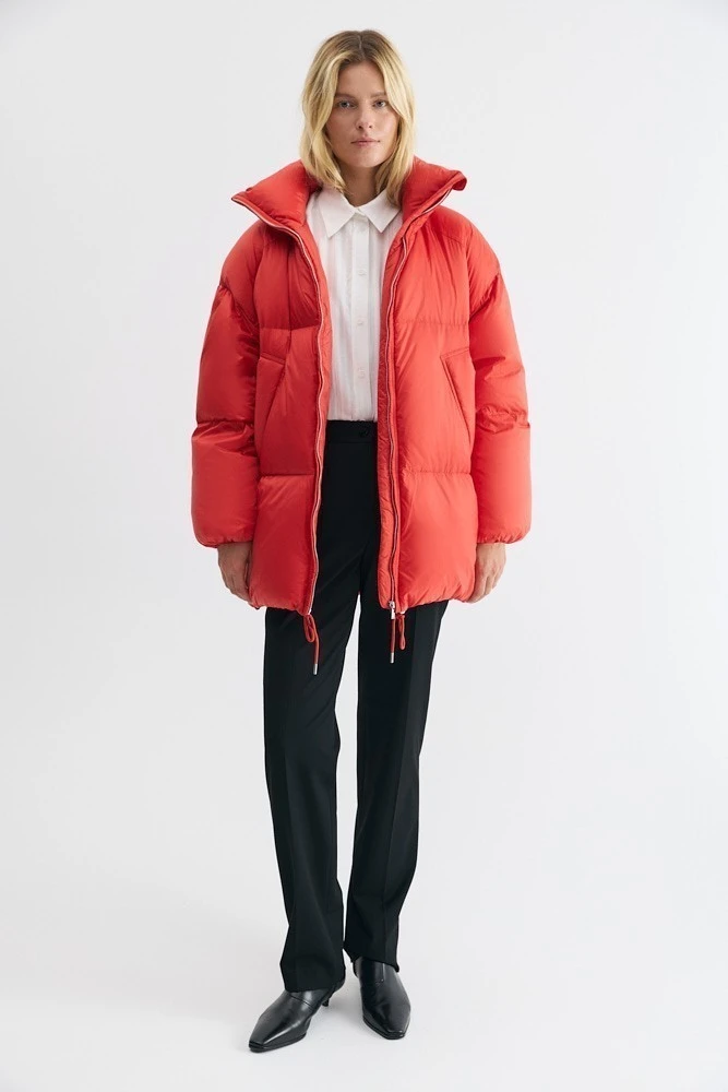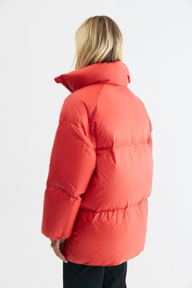 Укороченный пуховик свободного кроя с воротником-стойкой в актуальном цвете. Комфортная модель для стильных утепленных образов.