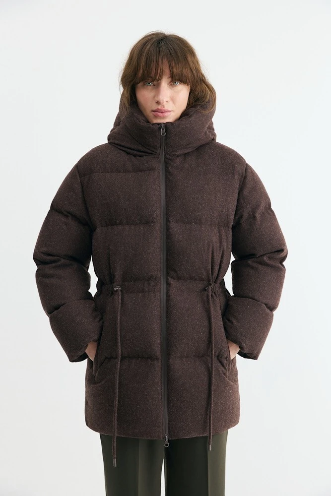 Пуховик на кулиске с теплой верхней ткани из смесовой шерсти. Наполнитель из пуха защищен от намокания мембранной тканью.