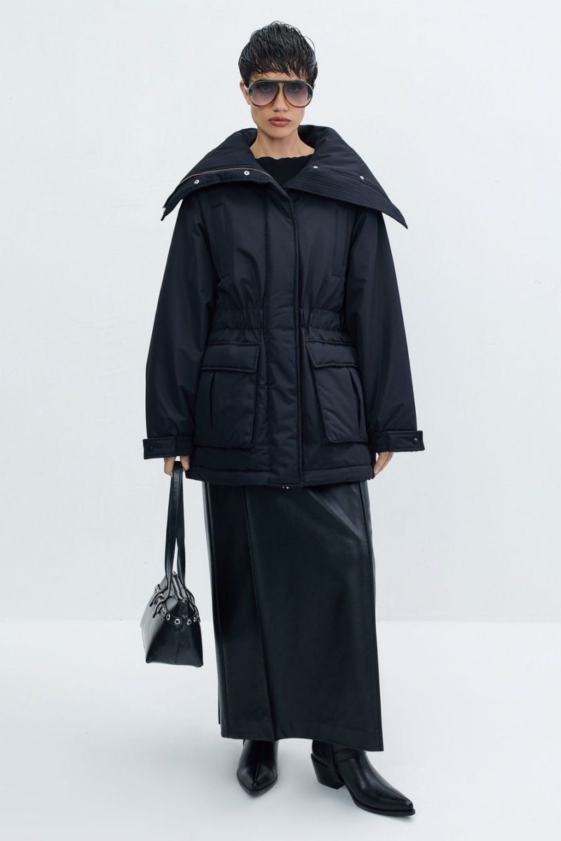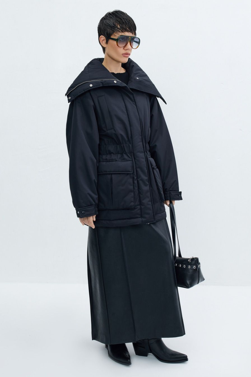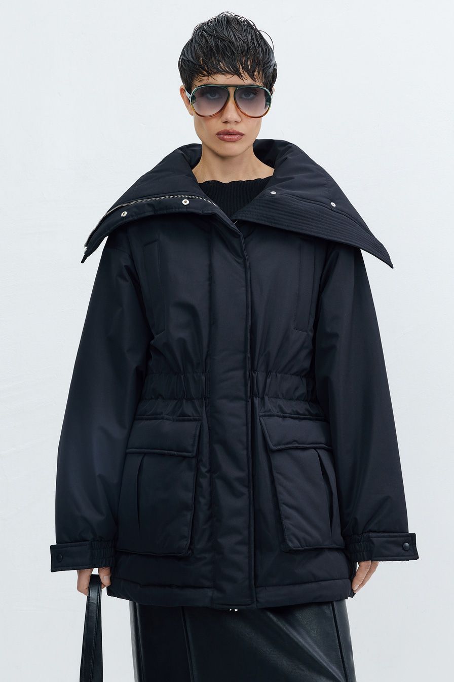 Укороченная куртка-парка с наполнителем из синтепона – модель черного цвета с капюшоном, накладными карманами и резинкой на талии. Парка сделана из мембранной ткани со специальной пропиткой – она защищает от ветра и влаги, и сохраняет тепло.