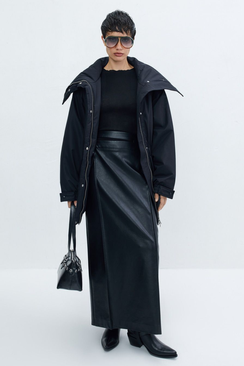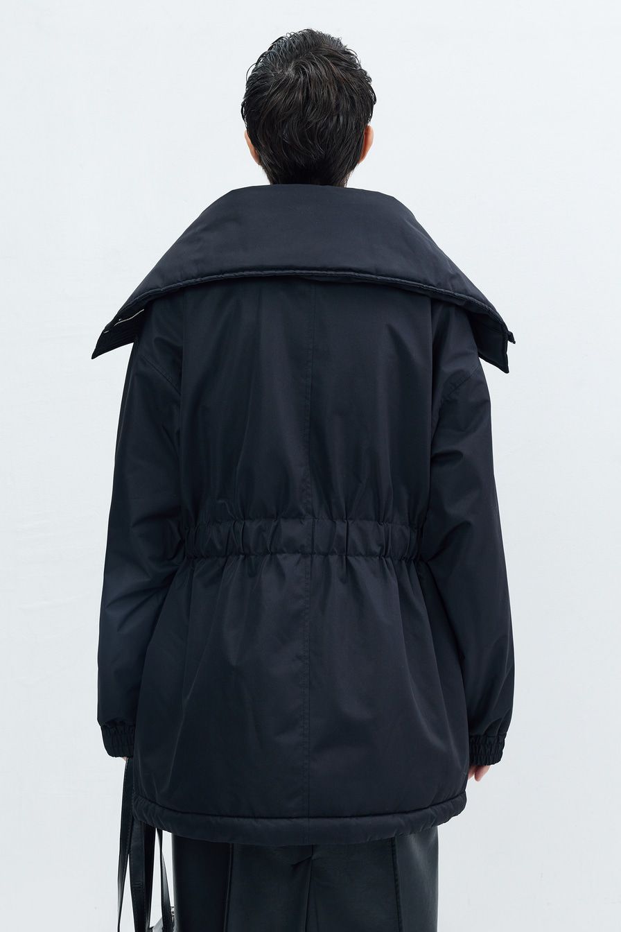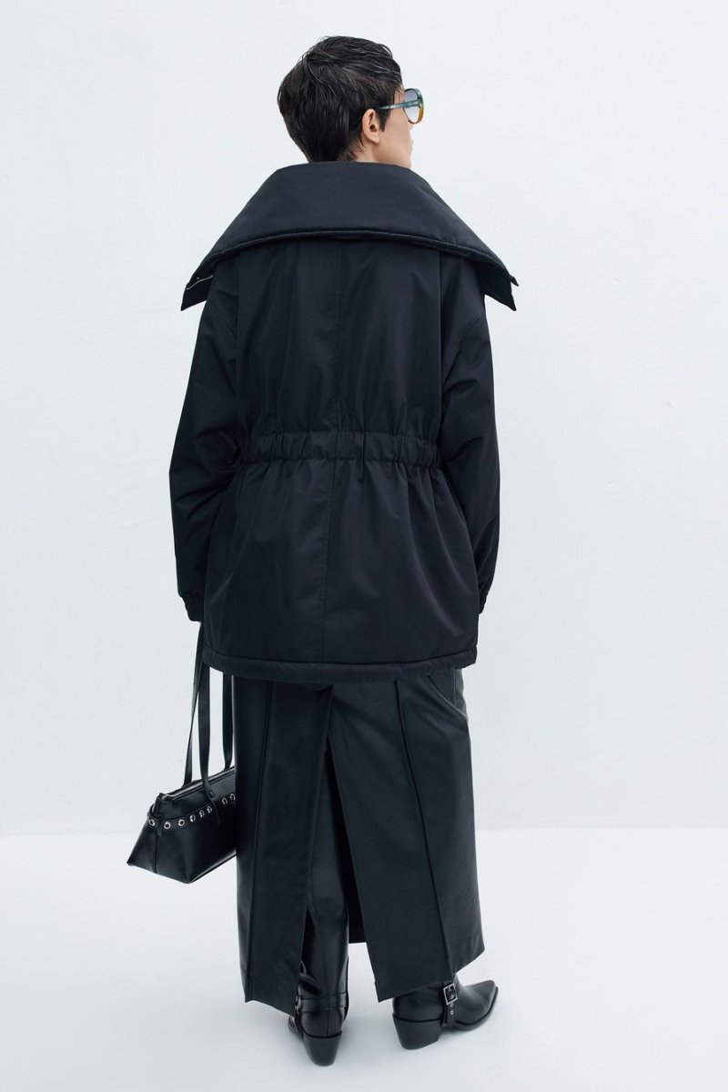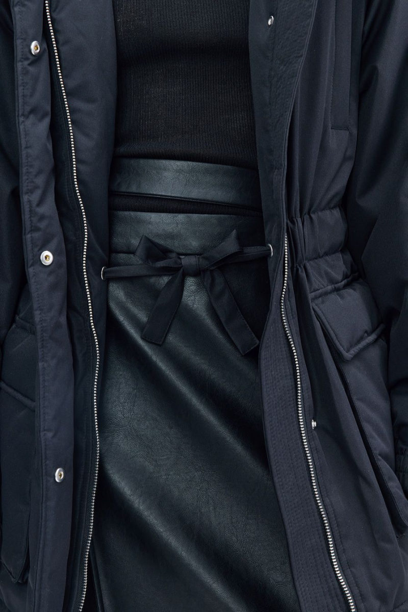 Укороченная куртка-парка с наполнителем из синтепона – модель черного цвета с капюшоном, накладными карманами и резинкой на талии. Парка сделана из мембранной ткани со специальной пропиткой – она защищает от ветра и влаги, и сохраняет тепло.