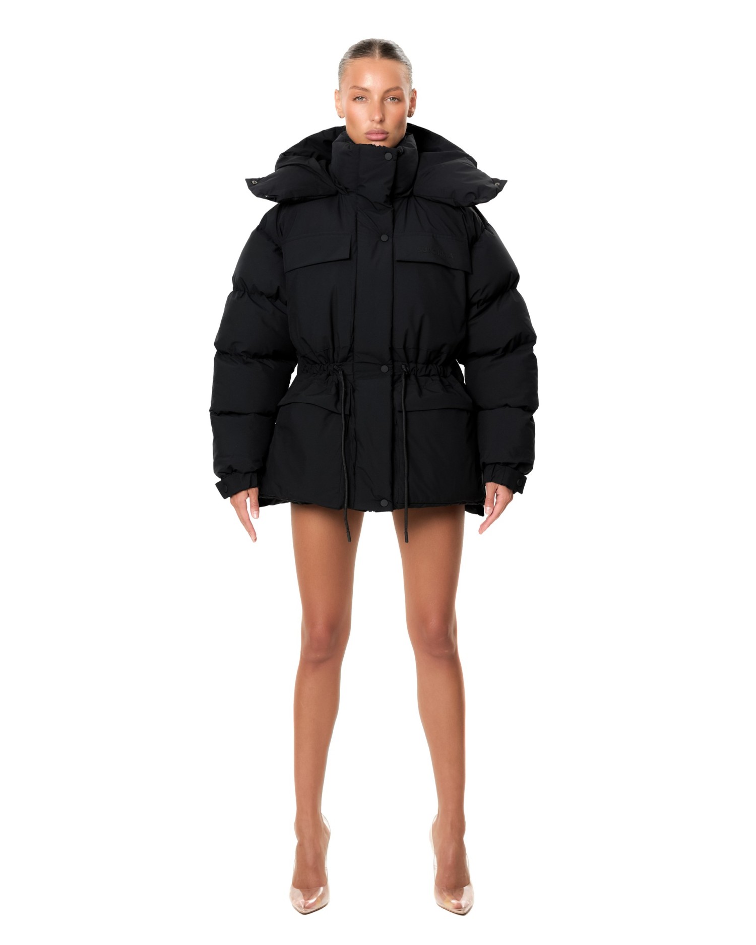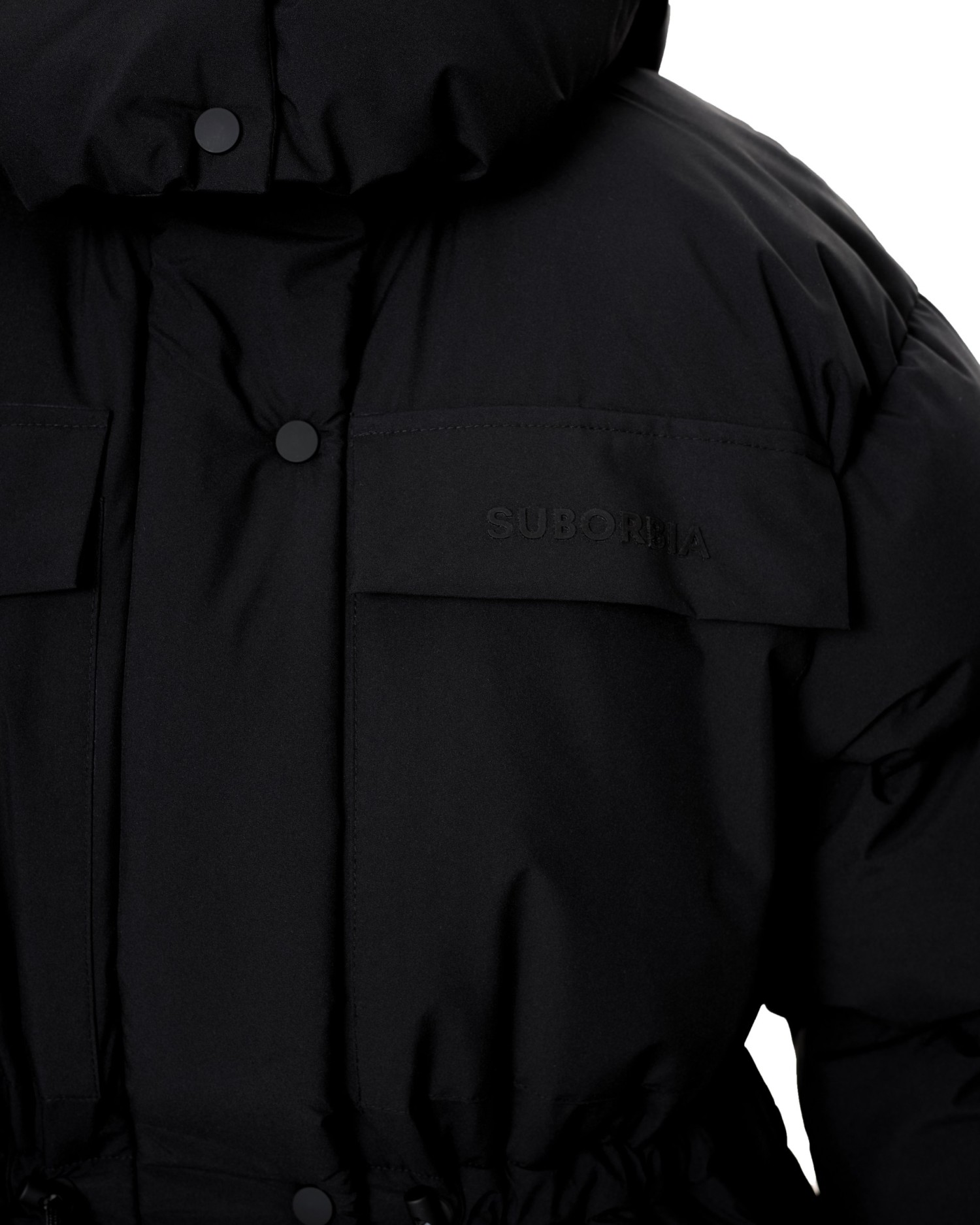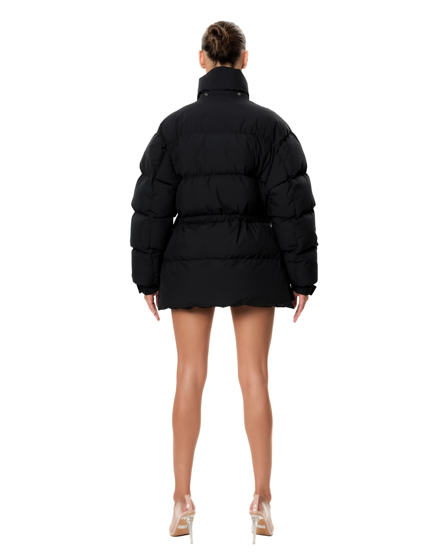 Пуховик оверсайз кроя с регулируемой кулиской на талии и капюшоном из высокотехнологичной мембраны.
