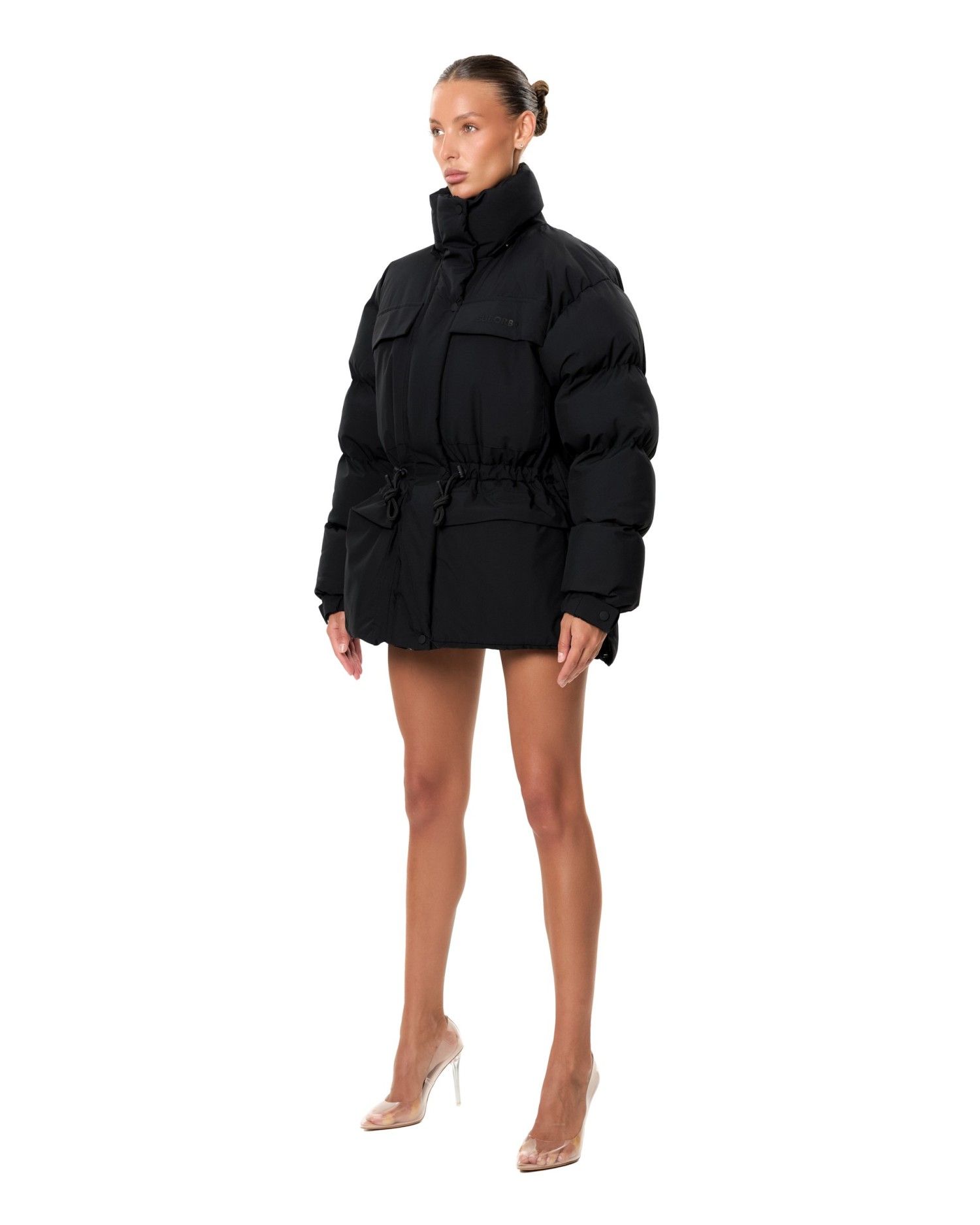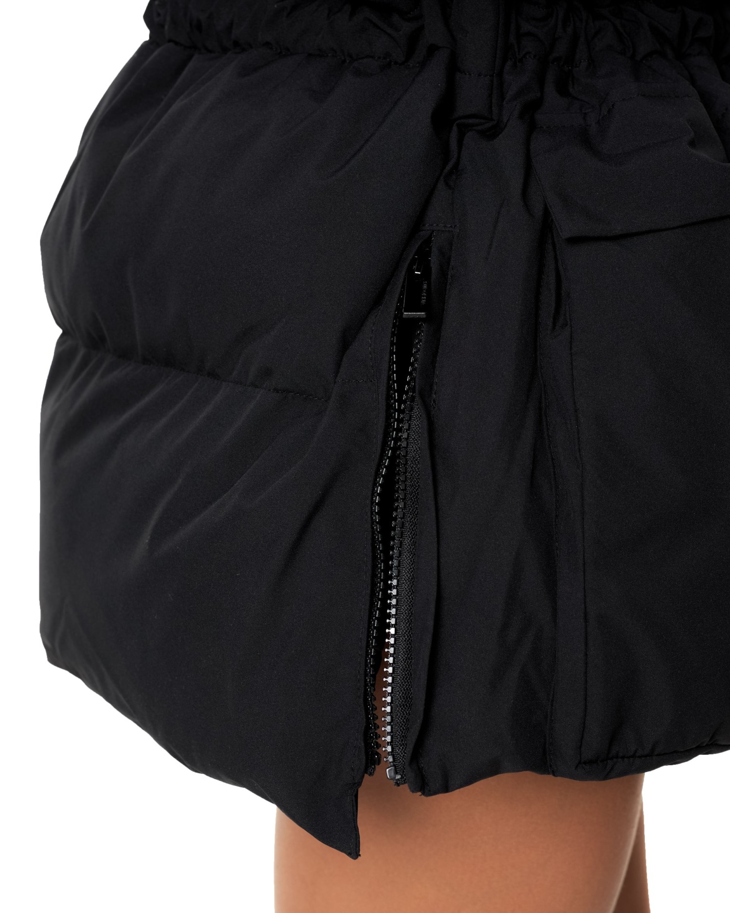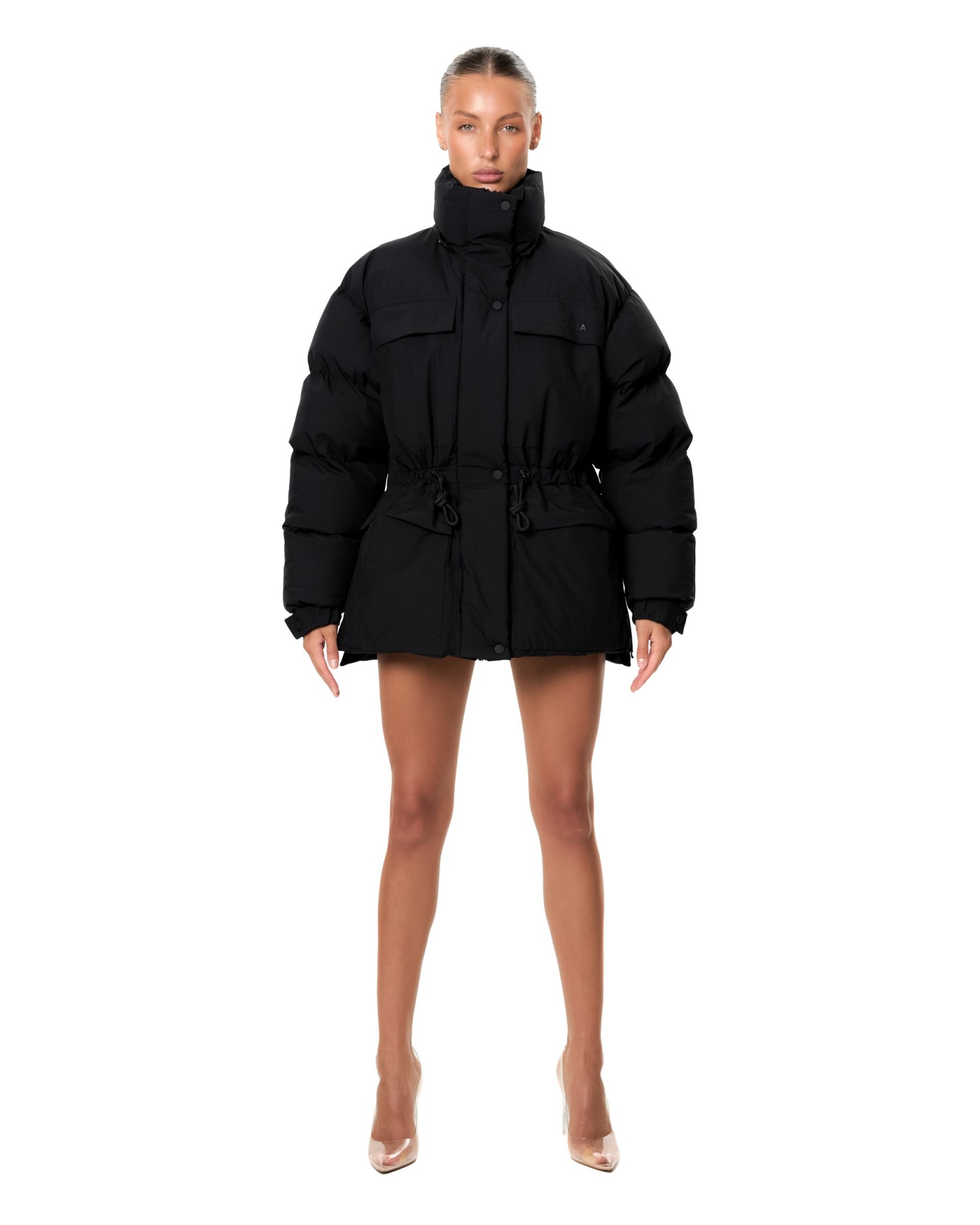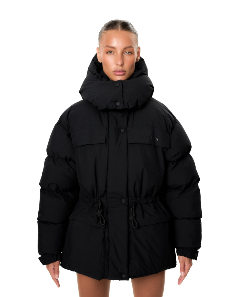 Пуховик оверсайз кроя с регулируемой кулиской на талии и капюшоном из высокотехнологичной мембраны.