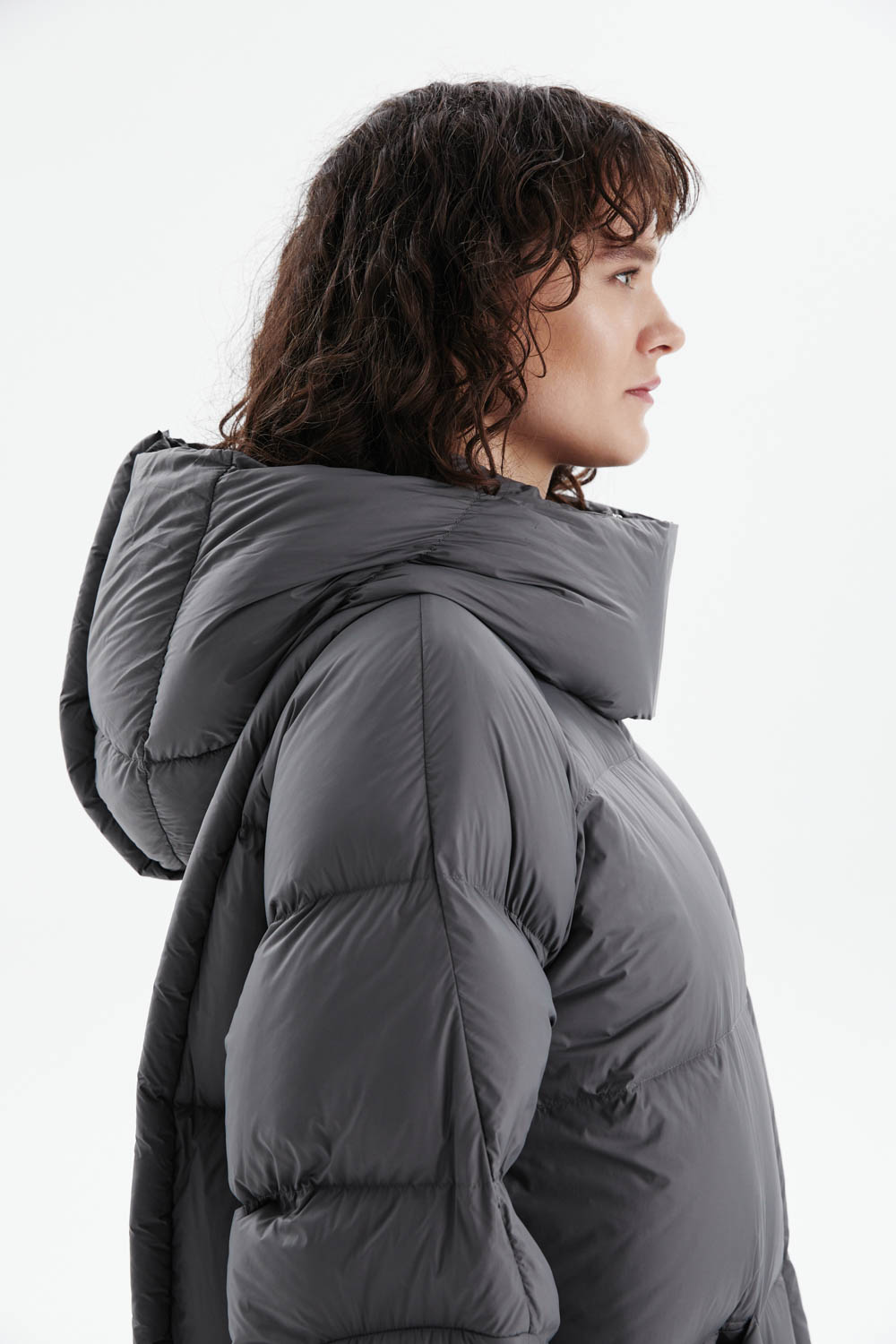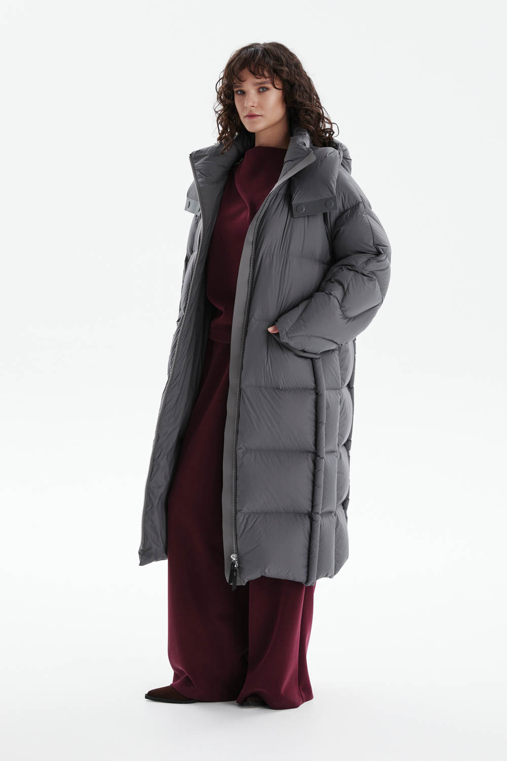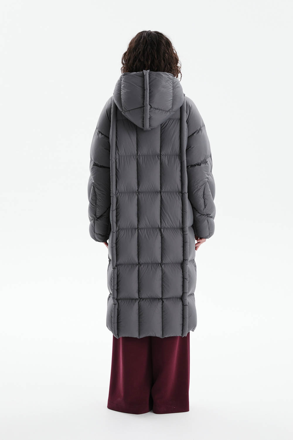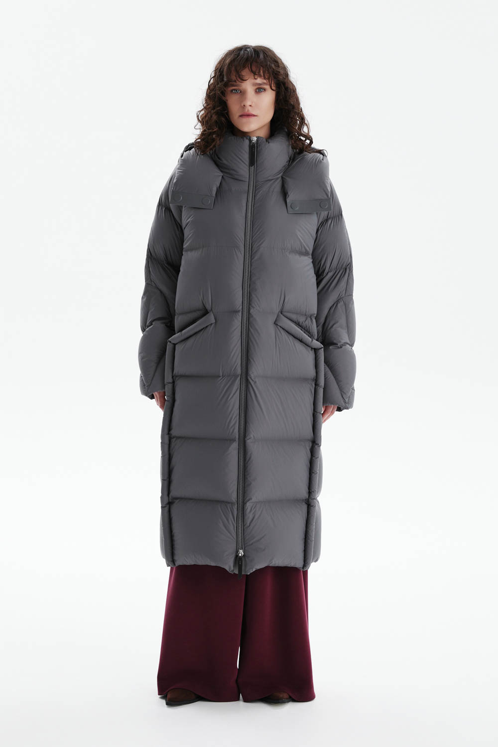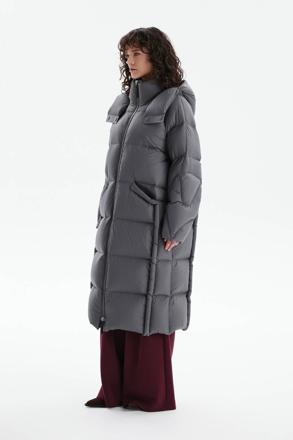 Серый удлинённый пуховик-пальто с капюшоном создан для тех, кто ценит тепло, комфорт и современный стиль. Лаконичный стёганый дизайн с рельефами «рёбра» по переду формирует выразительный силуэт, а универсальный графитовый оттенок легко вписывается в любой зимний образ.