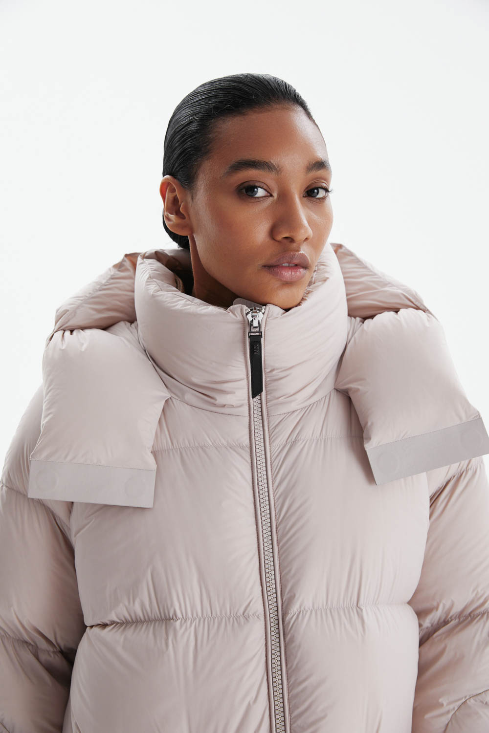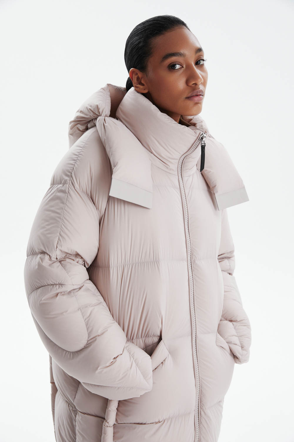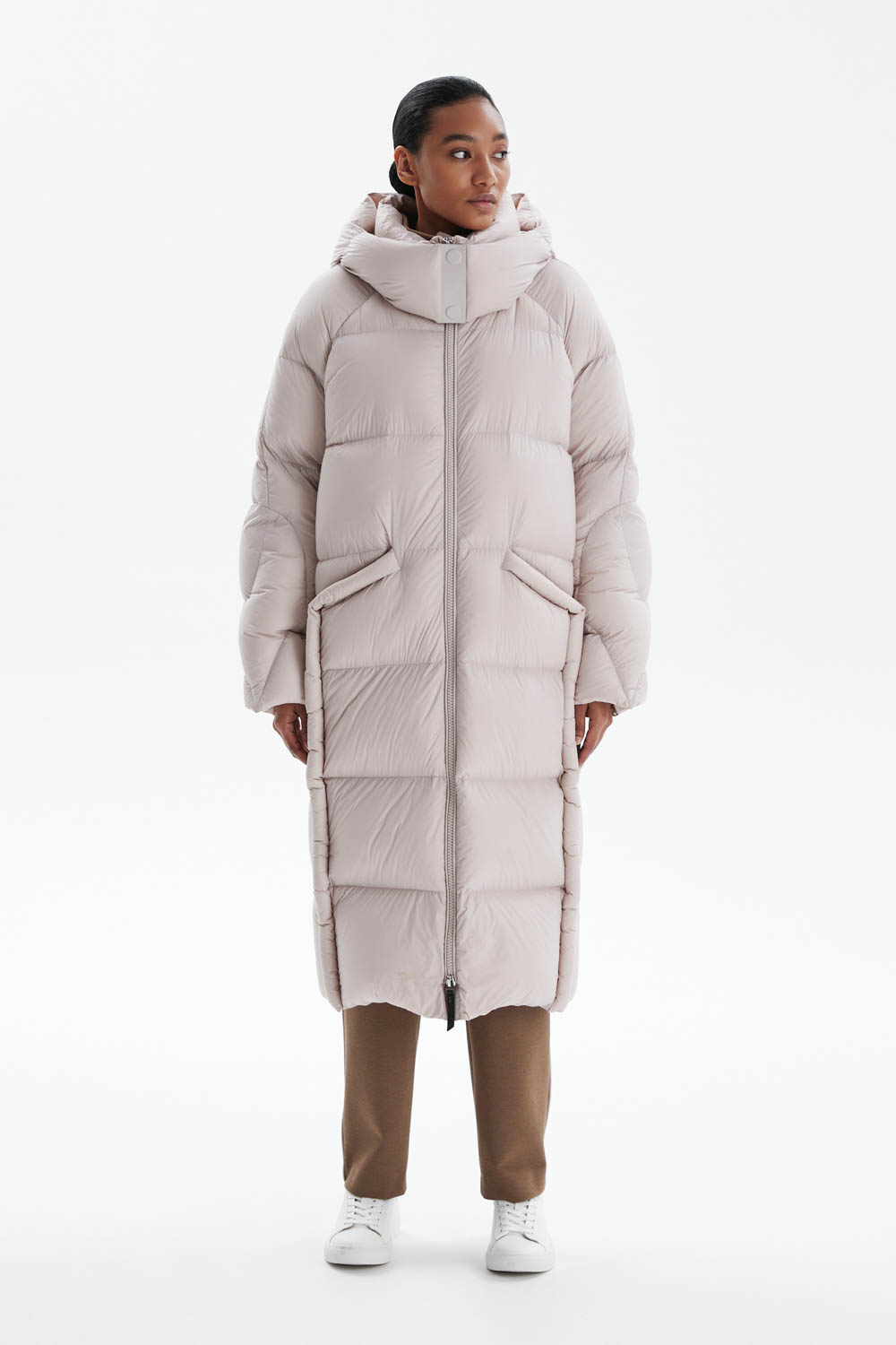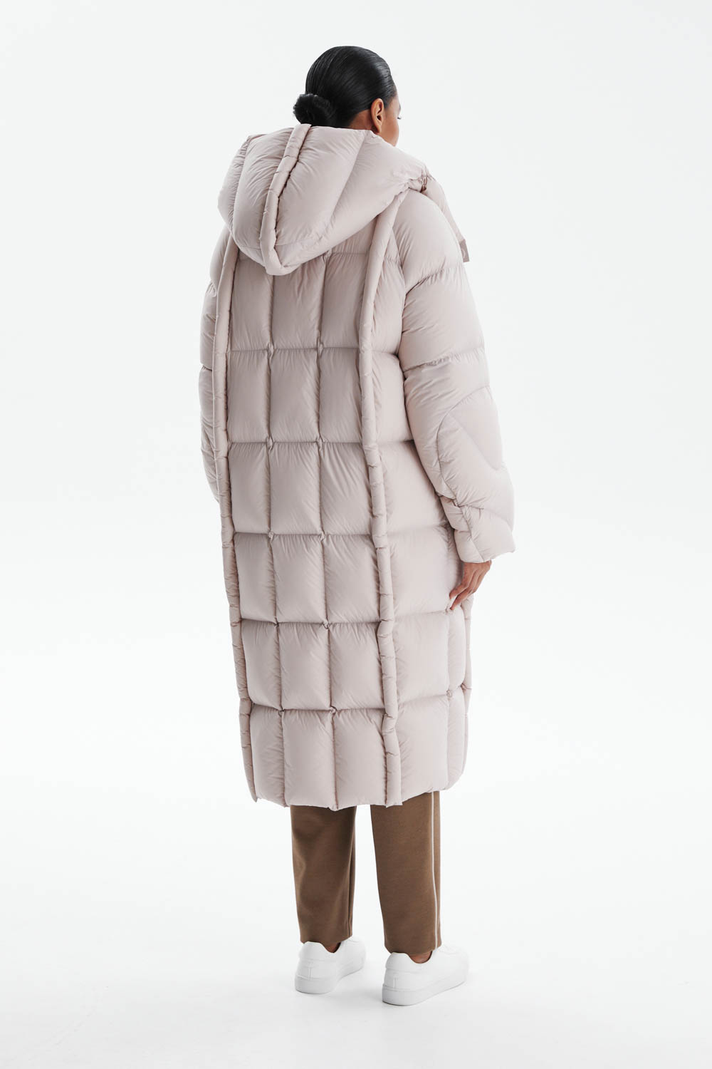 Удлинённый пуховик-пальто в нежном пудрово-молочном оттенке сочетает функциональность и минималистичную элегантность. Современный стёганый дизайн с рельефами «рёбра» по переду визуально вытягивает силуэт, придавая образу лёгкость и утончённость.