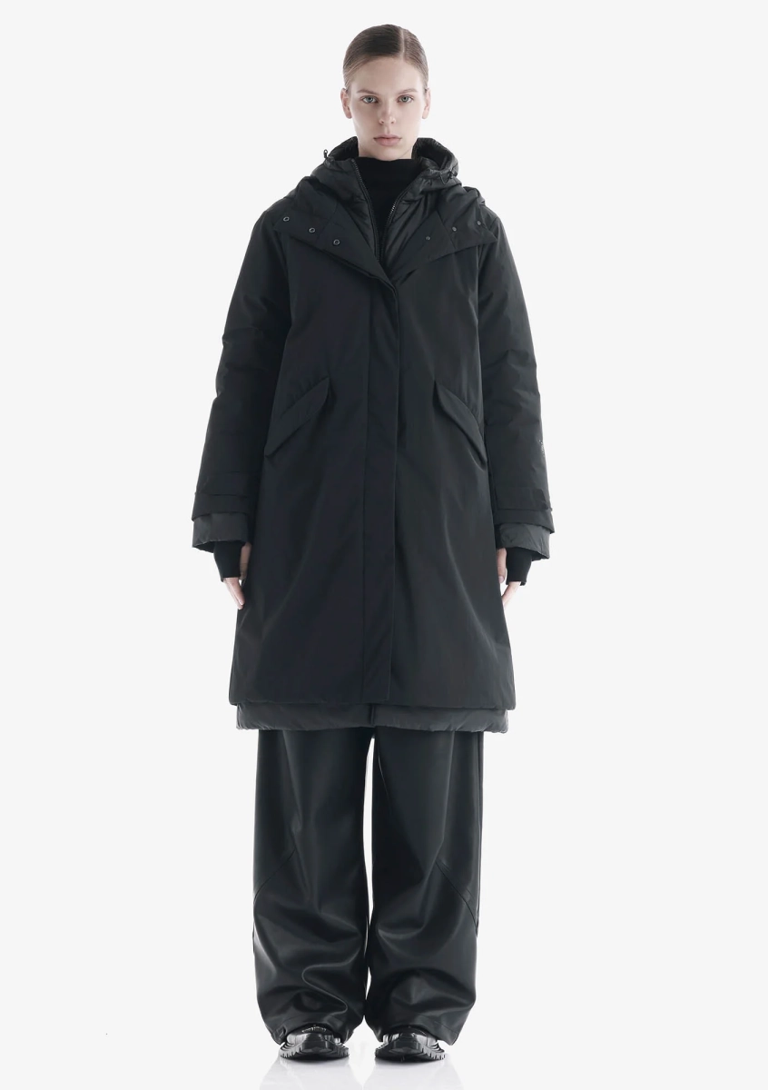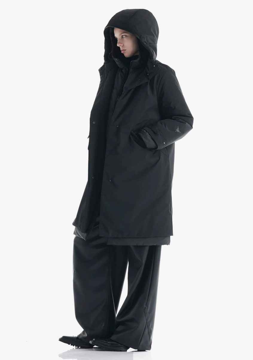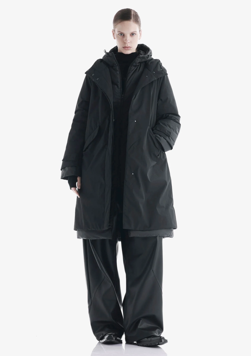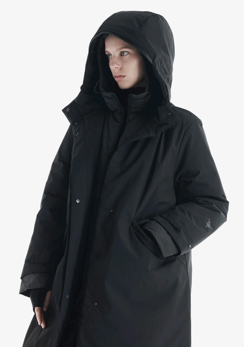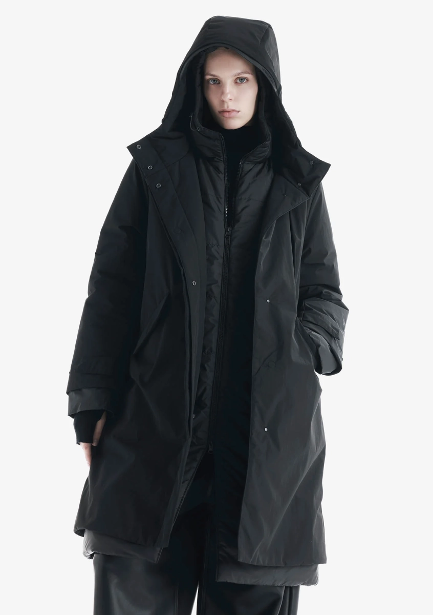 Удлинённая парка VELA с визуальным эффектом многослойности сделана из функциональной водостойкой ткани. Внешний капюшон с жёстким козырьком и внутренний утеплённый капюшон — двойная защита от непогоды. Две застёжки: внешняя — на магнитах и кнопках, внутренняя — на молнии с вентиляцией. Карманы с мягкой подкладкой и скрытые функциональные элементы усиливают комфорт и удобство в динамике.