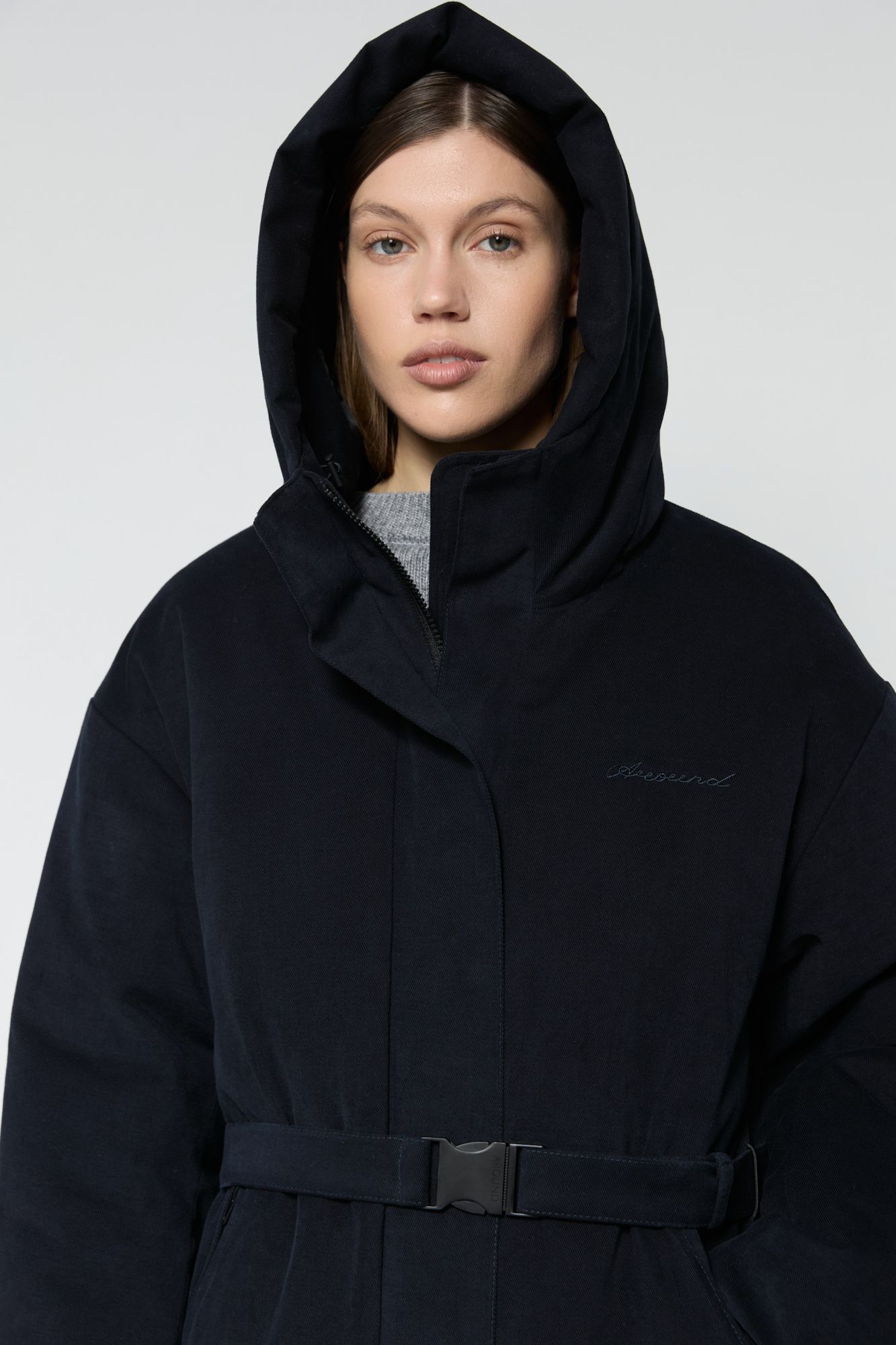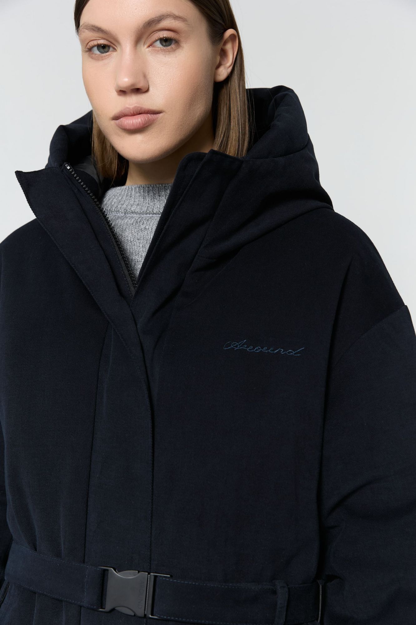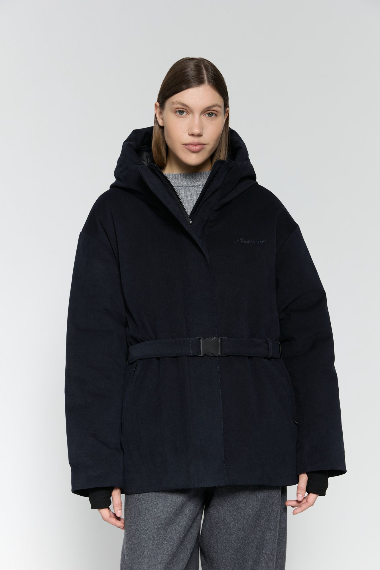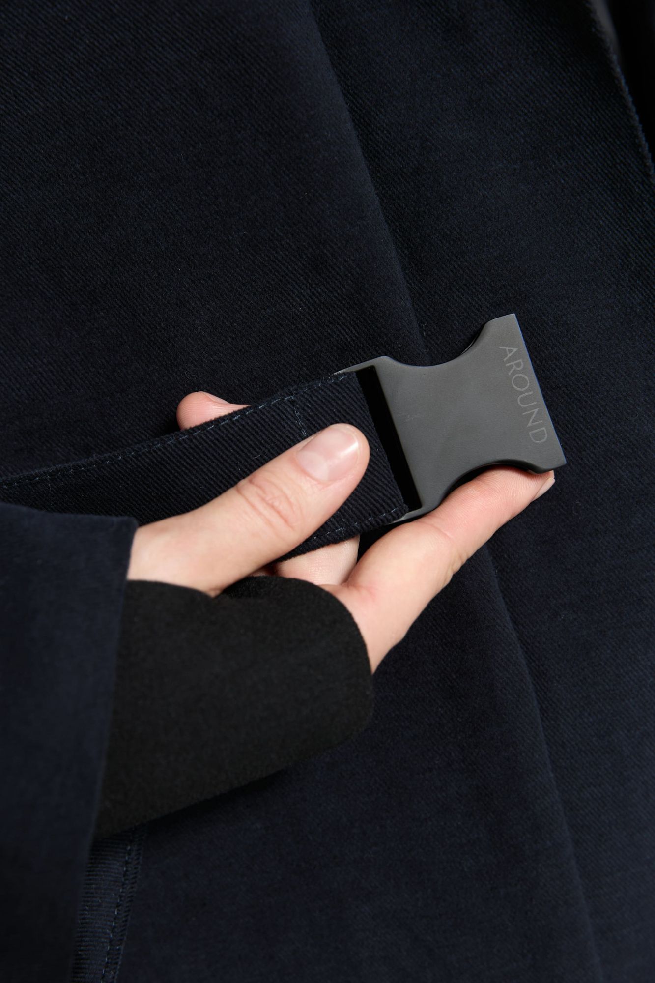 На талии есть шлевки и съемный пояс, при желании можно создать приталенный силуэт. По низу - внутренняя затяжка на резинку с фиксаторами. На груди вышита надпись Around в тон изделию.