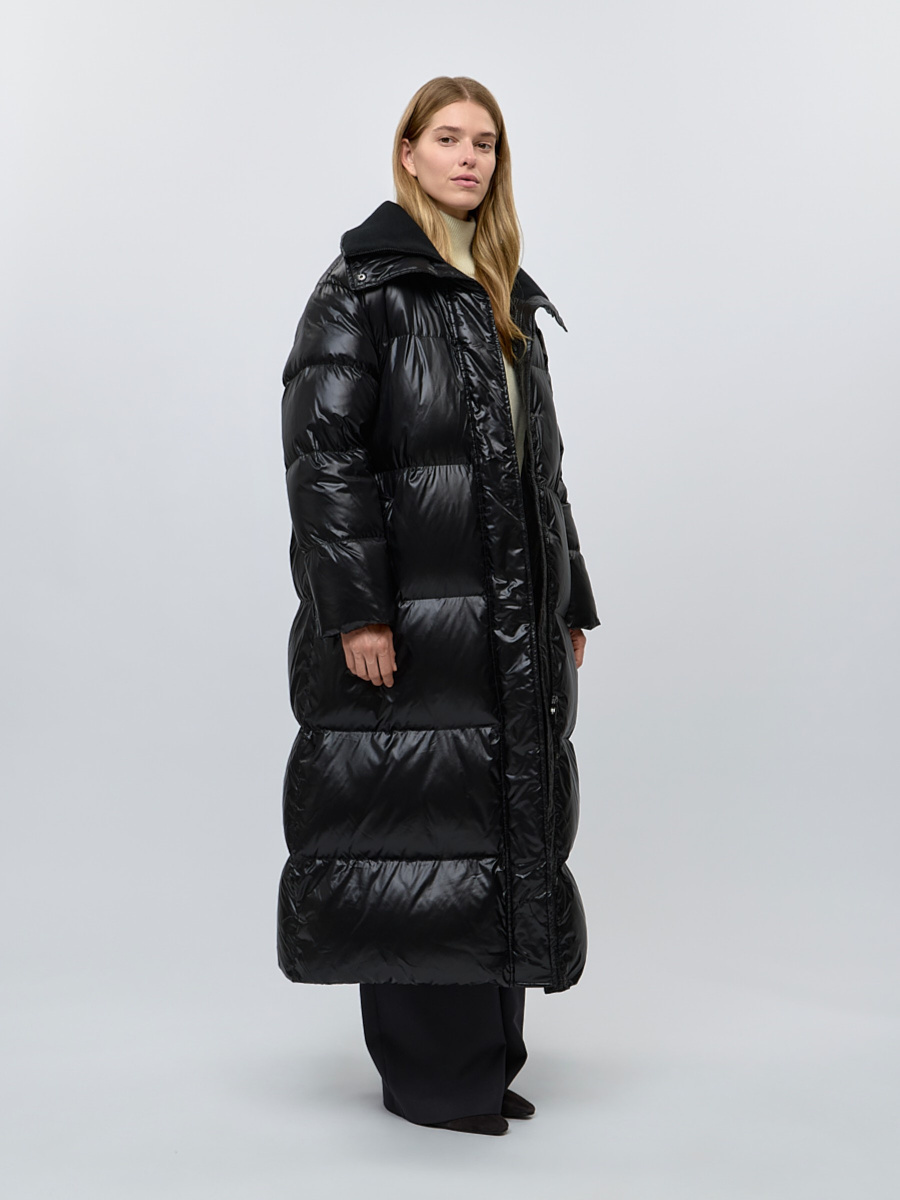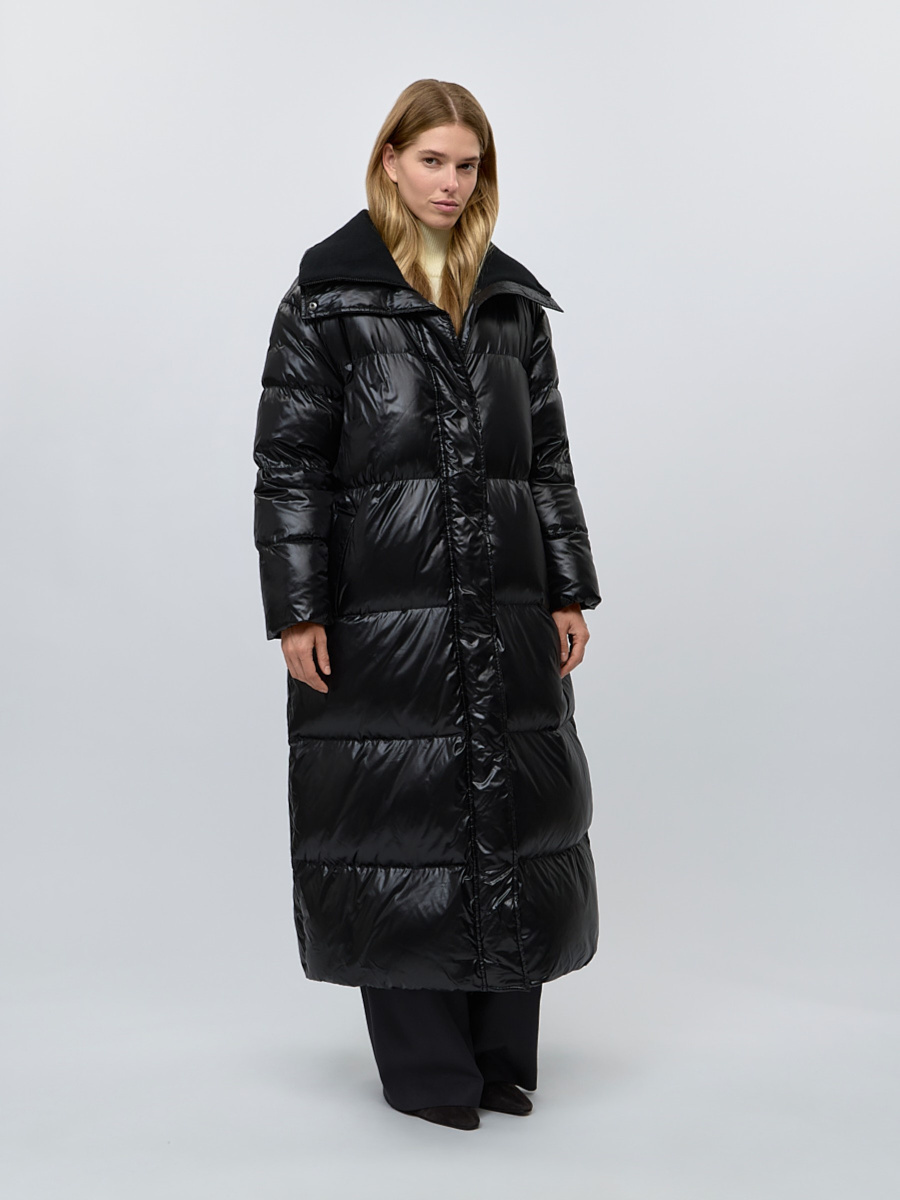 Удлиненное пуховое пальто для последнего месяца осени и зимы. Сшито из плотной ткани с полуглянцевым блеском, наполнитель — гусиный пух-перо с высоким индексом упругости. Воротник-стойка под горло с мягкой трикотажной изнанкой защищает шею от ветра. Застежка на металлическую молнию и кнопки закрыта планкой, чтобы не пропустить холодный воздух. Боковые карманы защелкиваются на кнопки, а тканевый пояс на шлевках не меняет положения.
