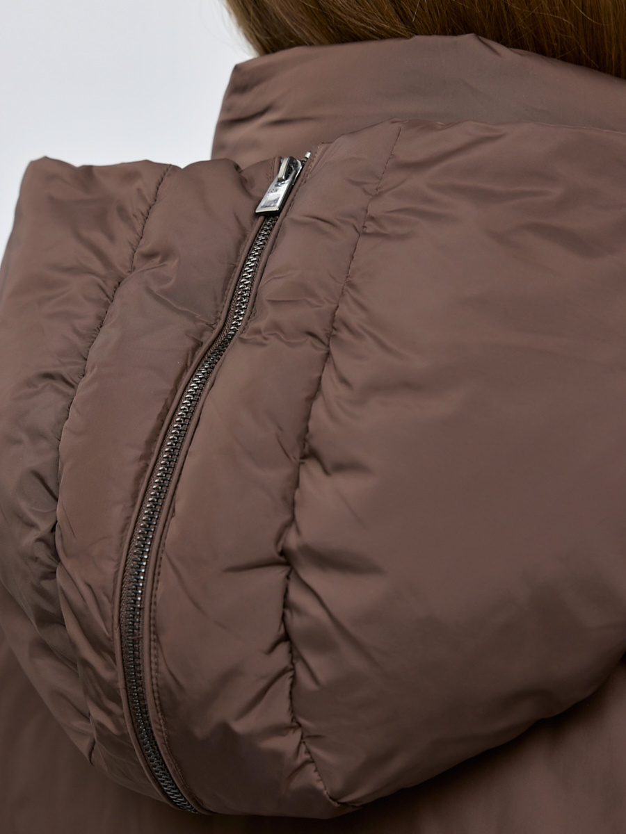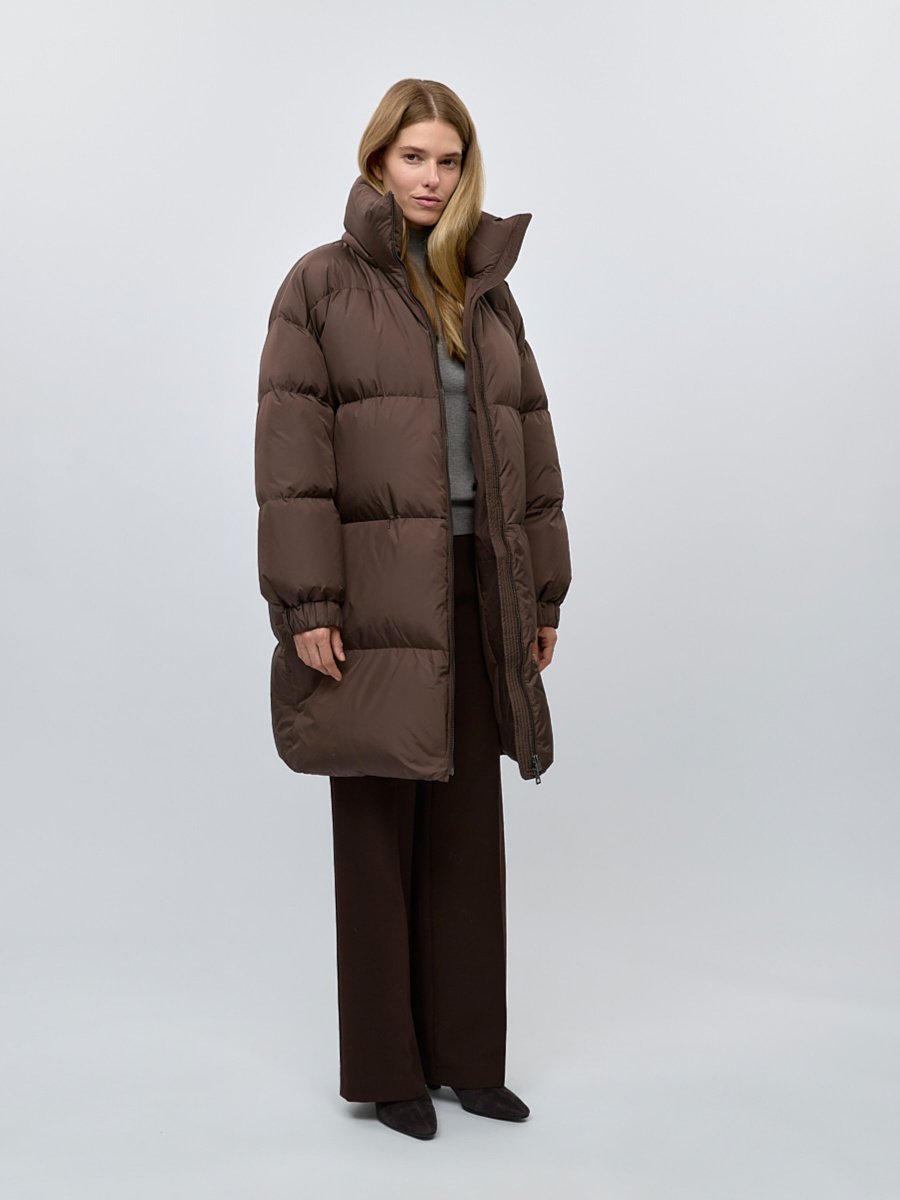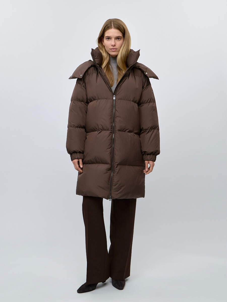 Стеганая пуховая куртка со съемным анатомическим капюшоном, утепленным воротником-стойкой на молнии и эластичными манжетами. Эти решения, а также наполнитель из гусиного пуха и пера отвечают за тепло даже в зимние морозы. Для изделия выбрана плотная ткань с легким металлическим сиянием и застежка на металлическую молнию, устойчивая к влаге. Горизонтальные карманы на потайной молнии спрятаны в швах изделия.