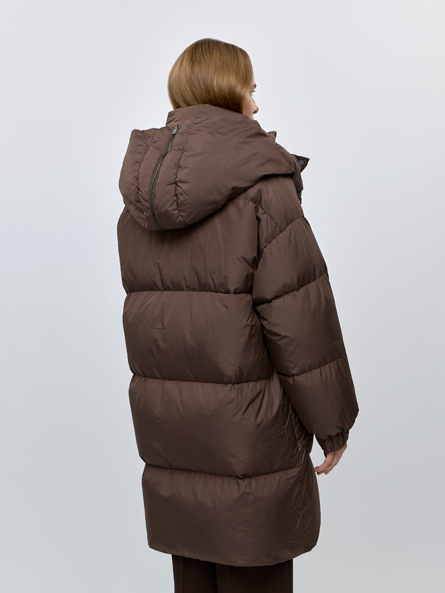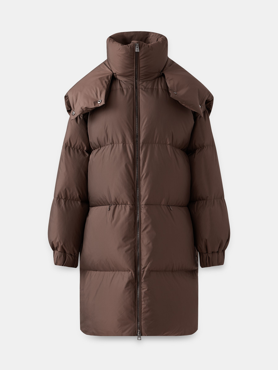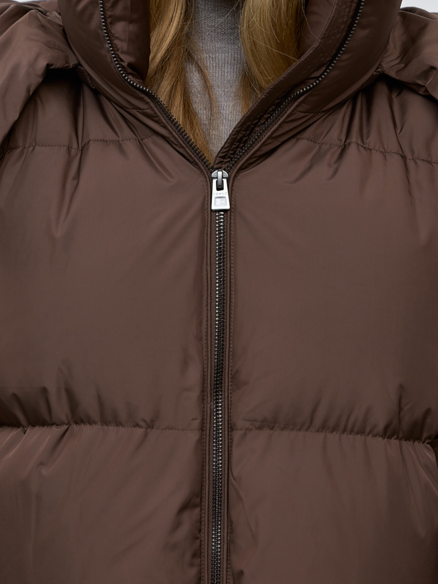 Стеганая пуховая куртка со съемным анатомическим капюшоном, утепленным воротником-стойкой на молнии и эластичными манжетами. Эти решения, а также наполнитель из гусиного пуха и пера отвечают за тепло даже в зимние морозы. Для изделия выбрана плотная ткань с легким металлическим сиянием и застежка на металлическую молнию, устойчивая к влаге. Горизонтальные карманы на потайной молнии спрятаны в швах изделия.