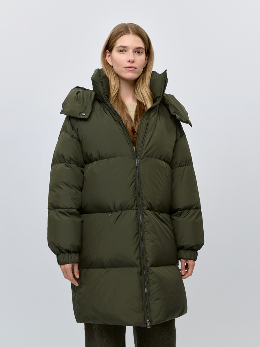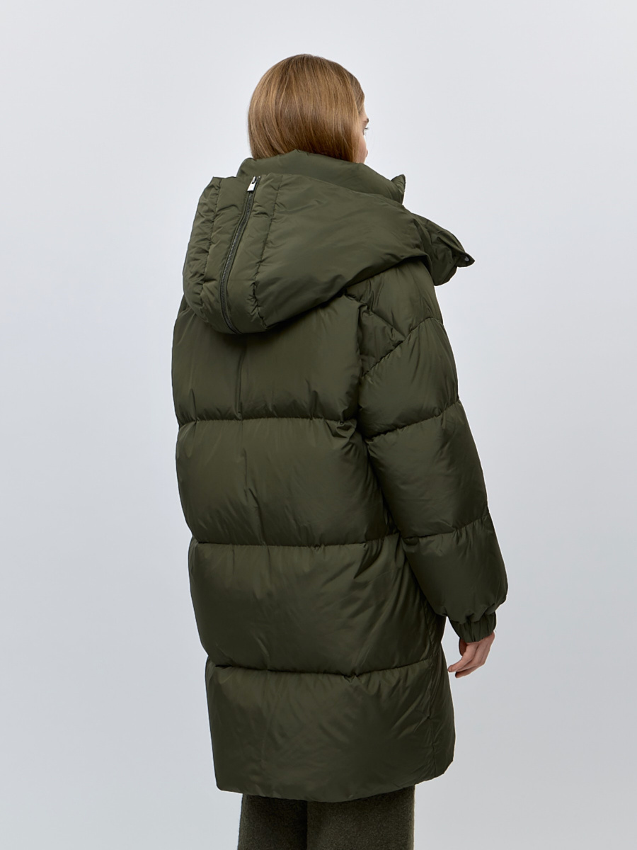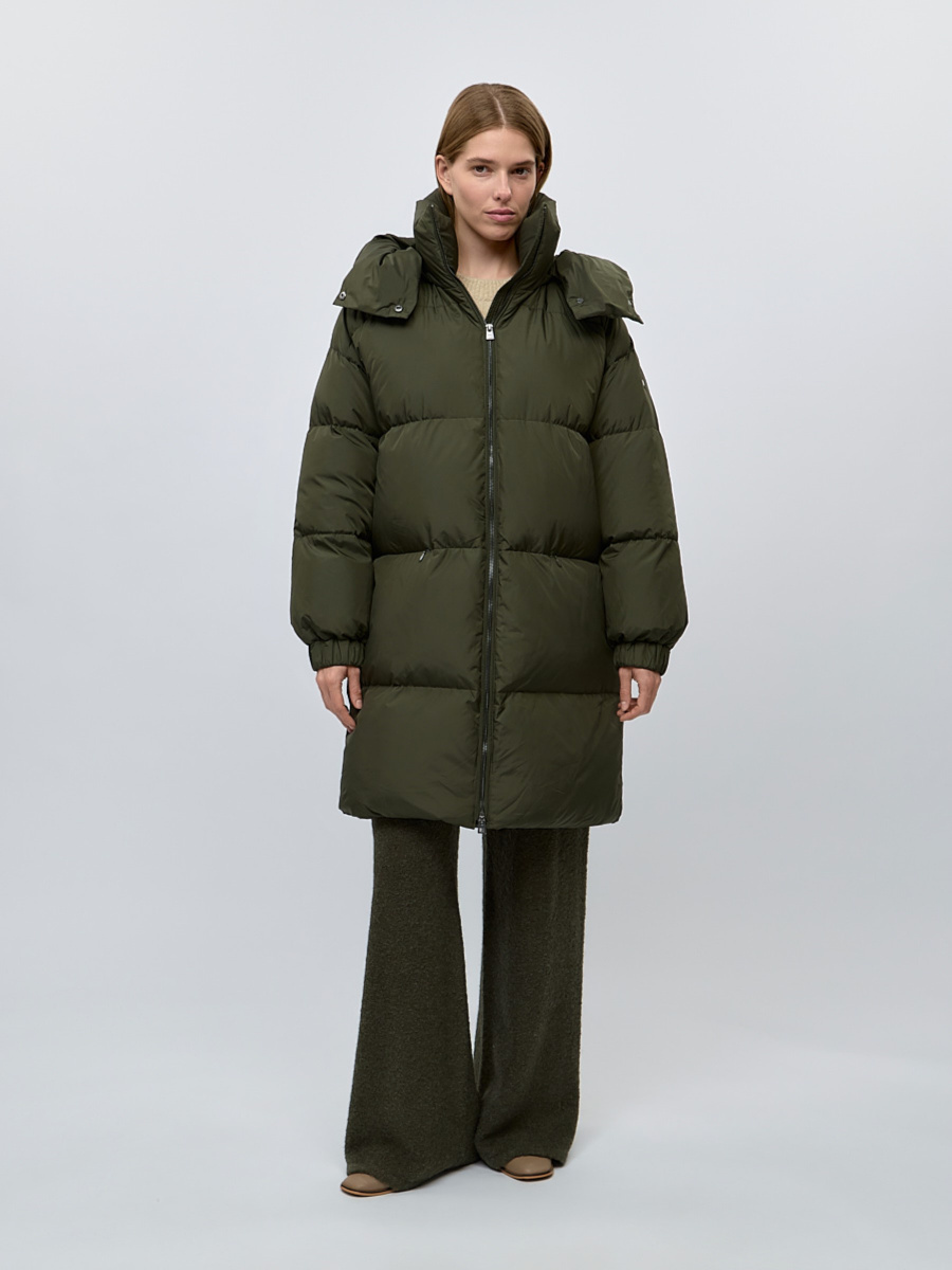 Стеганая пуховая куртка со съемным анатомическим капюшоном, утепленным воротником-стойкой на молнии и эластичными манжетами. Эти решения, а также наполнитель из гусиного пуха и пера отвечают за тепло даже в зимние морозы. Для изделия выбрана плотная ткань с легким металлическим сиянием и застежка на металлическую молнию, устойчивая к влаге. Горизонтальные карманы на потайной молнии спрятаны в швах изделия.