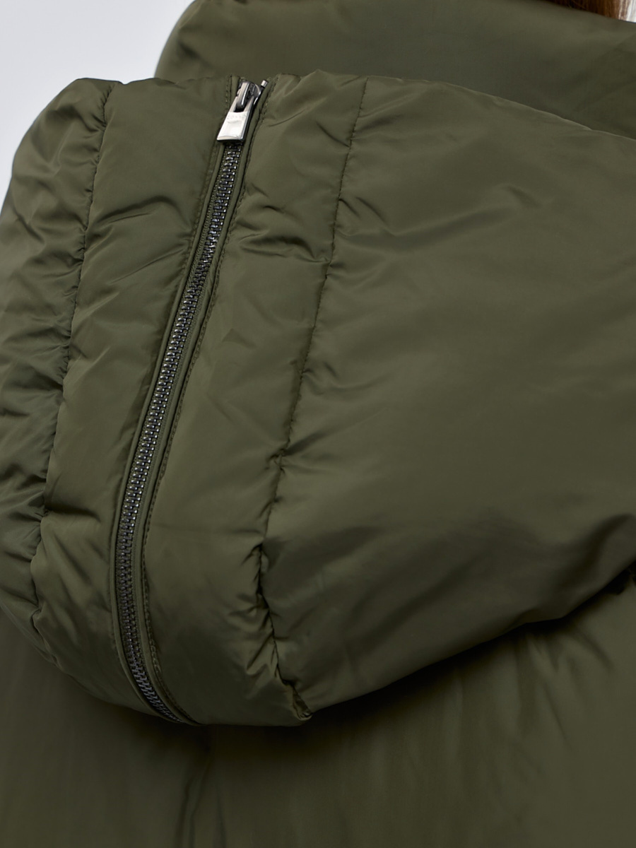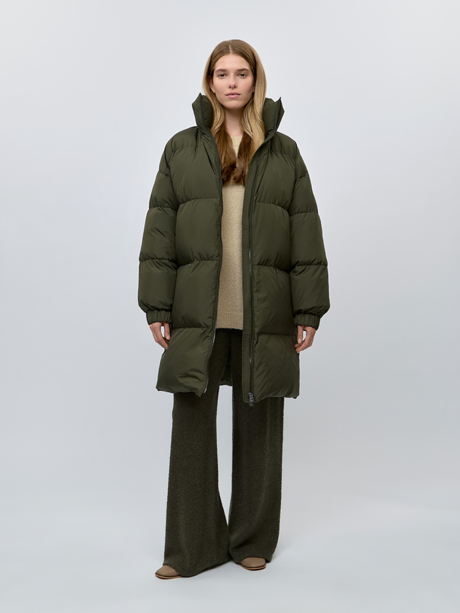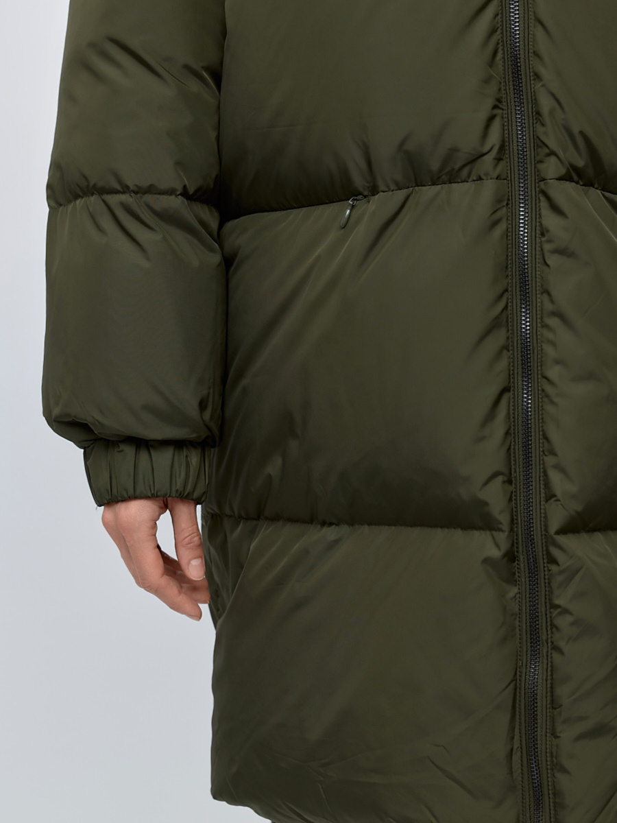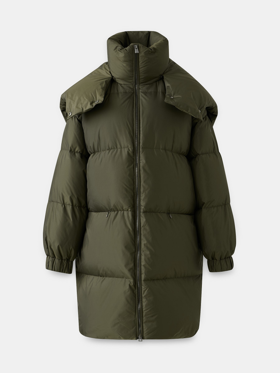 Стеганая пуховая куртка со съемным анатомическим капюшоном, утепленным воротником-стойкой на молнии и эластичными манжетами. Эти решения, а также наполнитель из гусиного пуха и пера отвечают за тепло даже в зимние морозы. Для изделия выбрана плотная ткань с легким металлическим сиянием и застежка на металлическую молнию, устойчивая к влаге. Горизонтальные карманы на потайной молнии спрятаны в швах изделия.