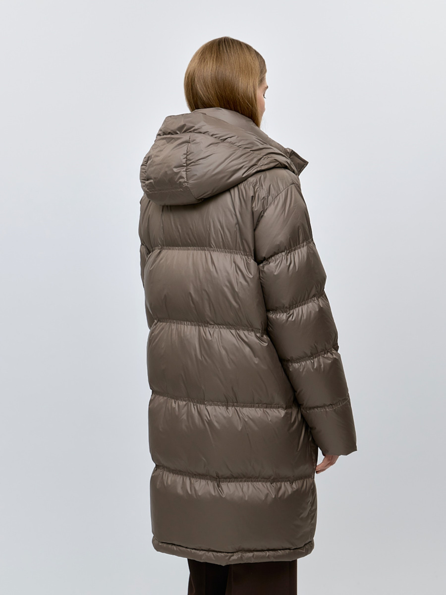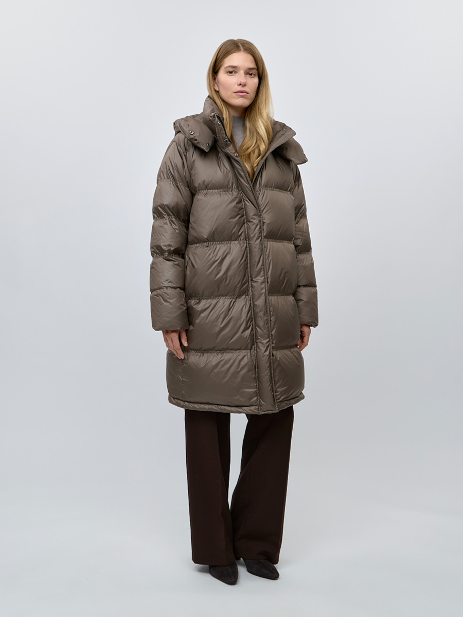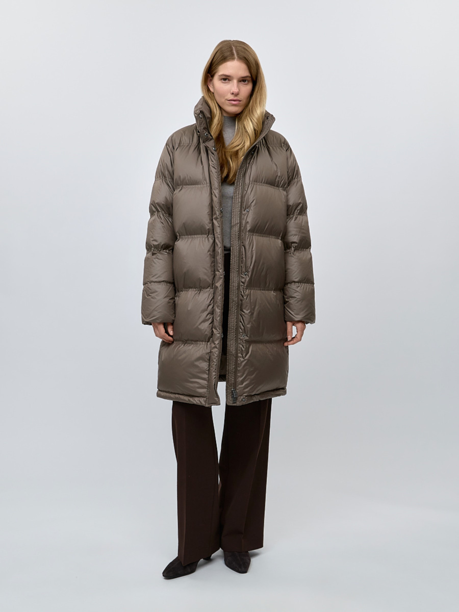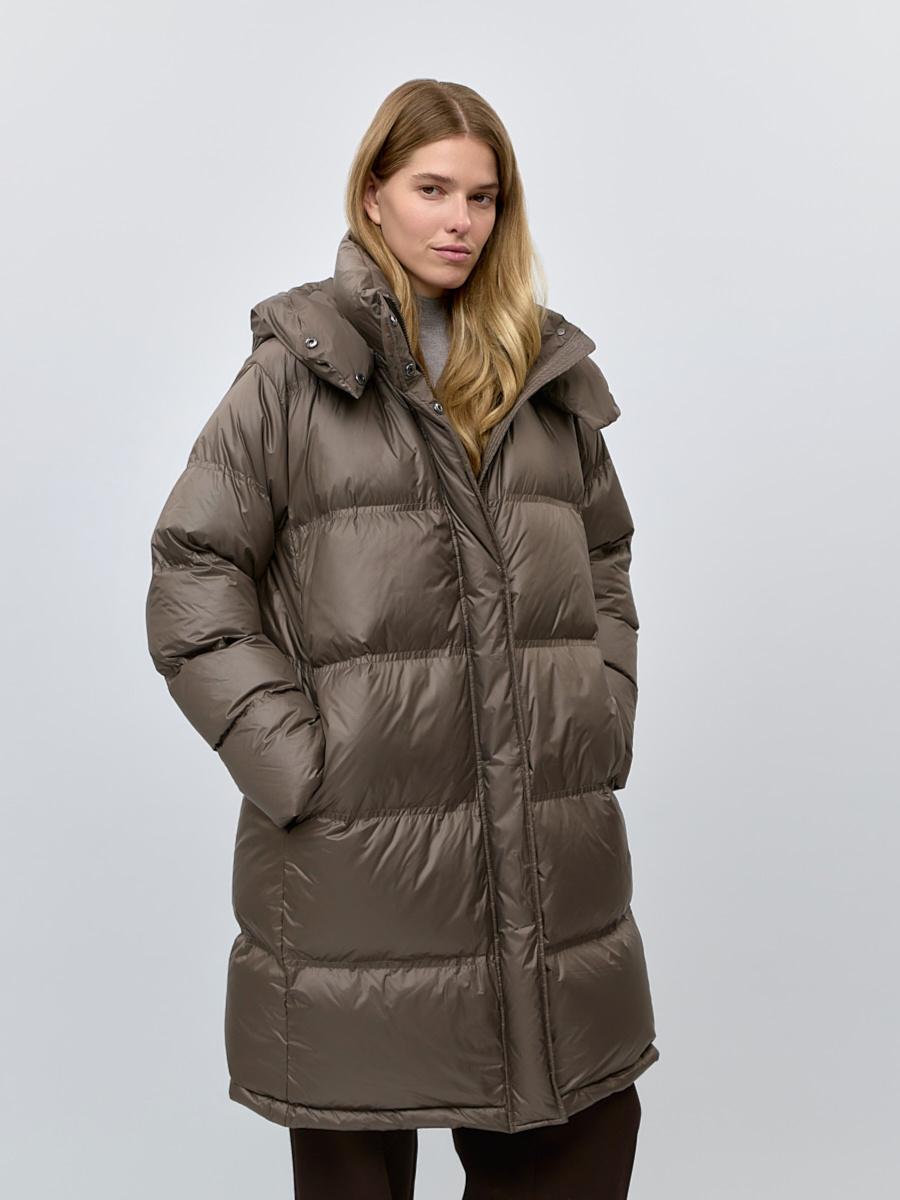 Универсальная куртка со съемным капюшоном на кулисе и высоким воротником-стойкой не даст замерзнуть в мороз. Сшита из плотной ткани с деликатным блеском, набита гусиным пухом и пером. Рукава собраны на широкие трикотажные манжеты. Скрытая кулиса по низу позволяет регулировать объем и дополнительно утеплиться. Застежка на пластиковую молнию и металлические кнопки, закрытые ветрозащитной планкой. Незаметные боковые карманы на молнии.