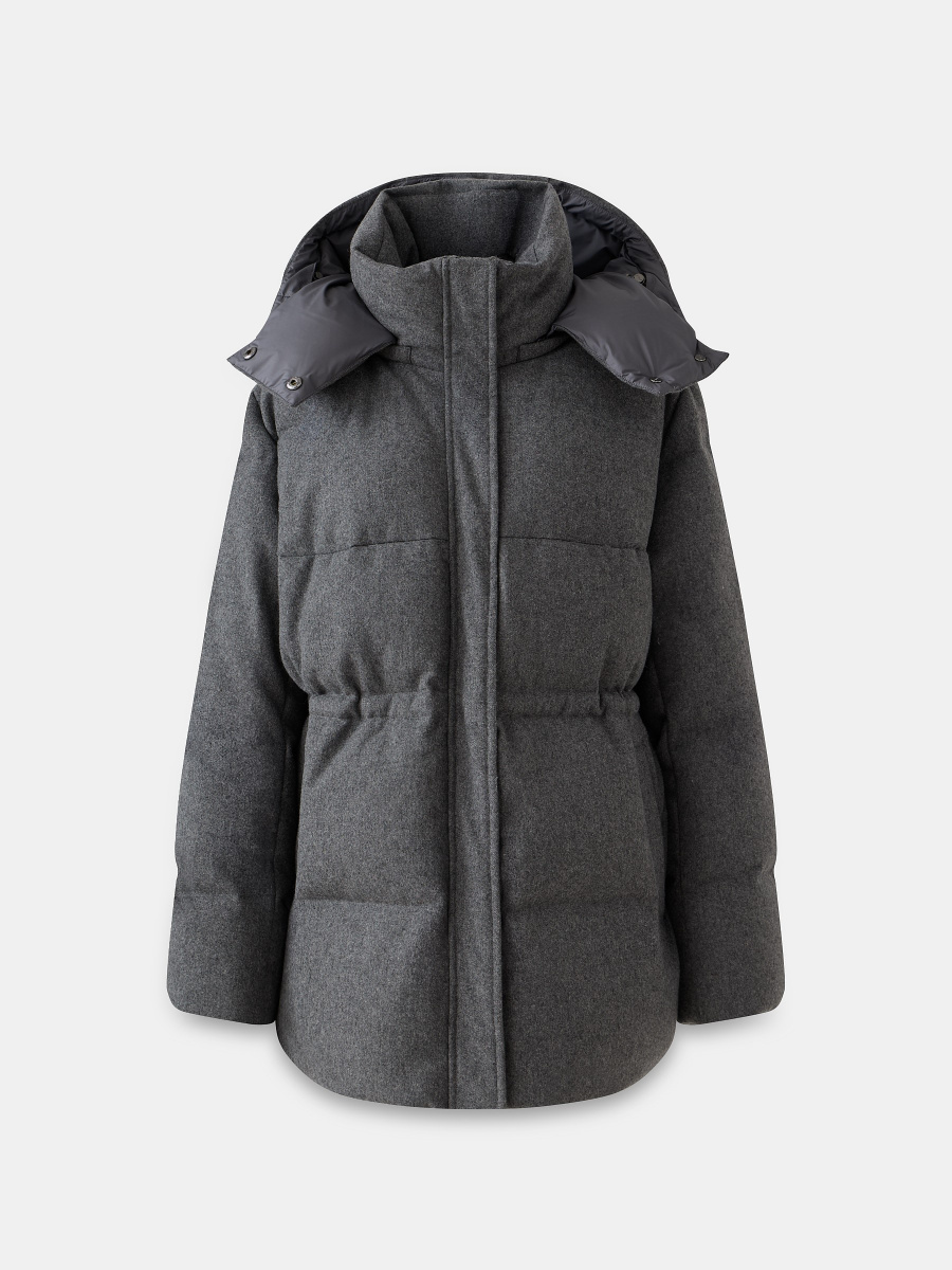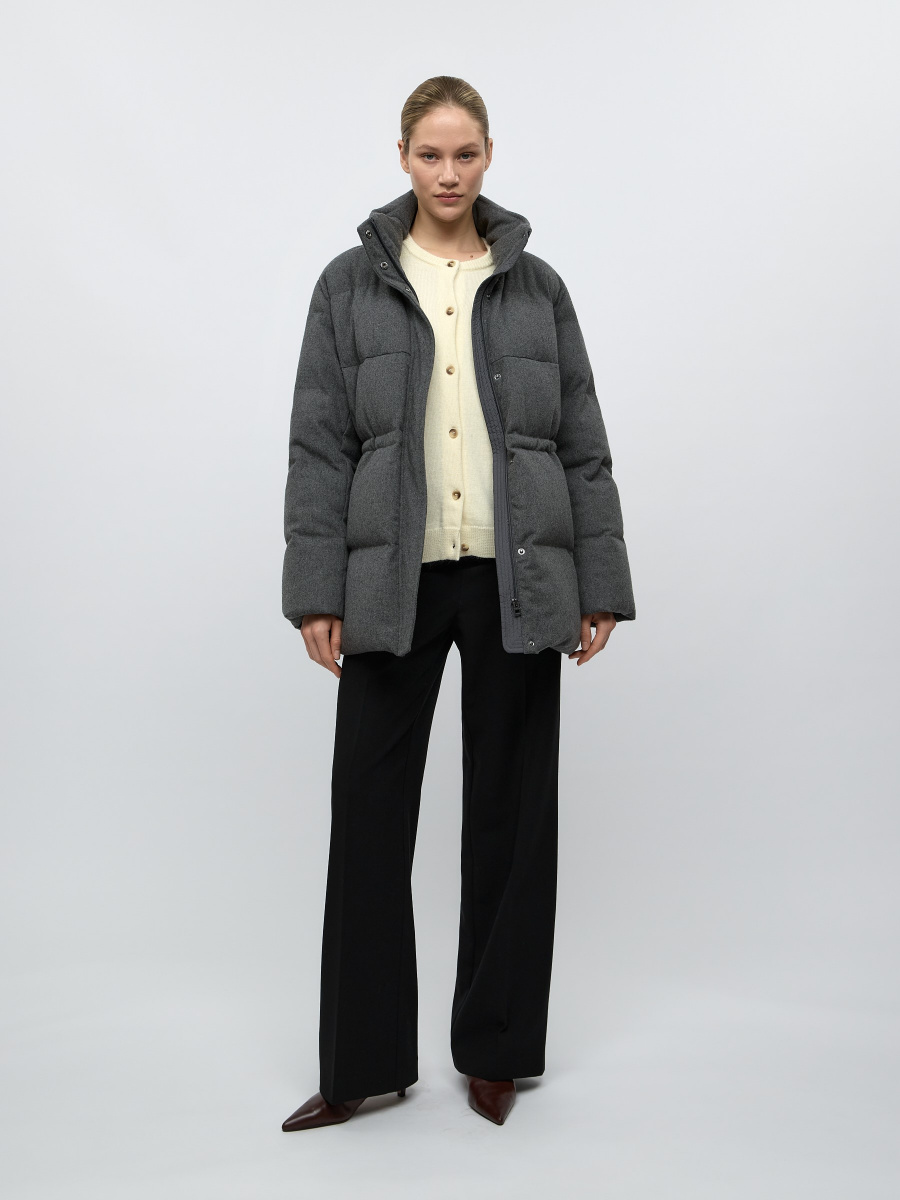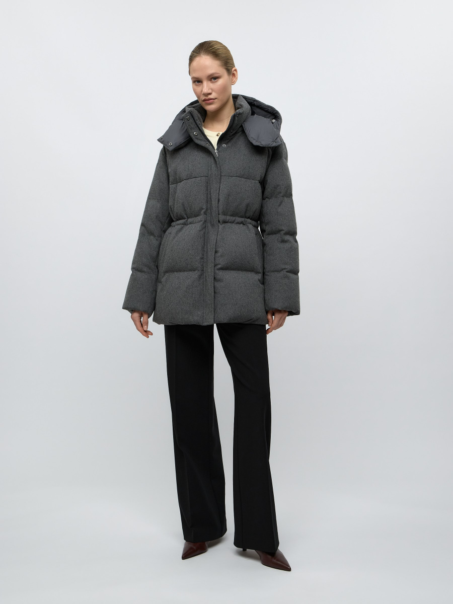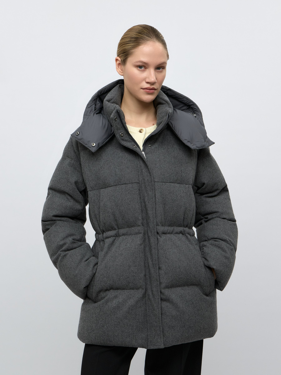 Универсальная пуховая куртка как новое прочтение классики. Создана в комбинированной архитектуре: полушерстяная меланжевая ткань с мягким ворсом отсылает к пальто, а матовая непродуваемая ткань на спинке добавляет практичности. Внутренняя кулиса позволяет добиться нужного объема. Застежка на металлическую молнию и ряд кнопок. Съемный анатомический капюшон, высокий воротник-стойка на кнопках, боковые карманы и наполнитель из гусиного пуха и пера отвечают за тепло в зимние холода.