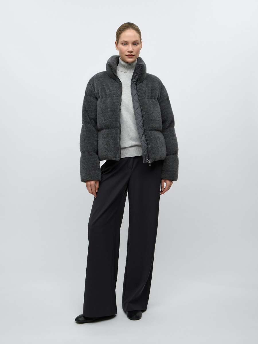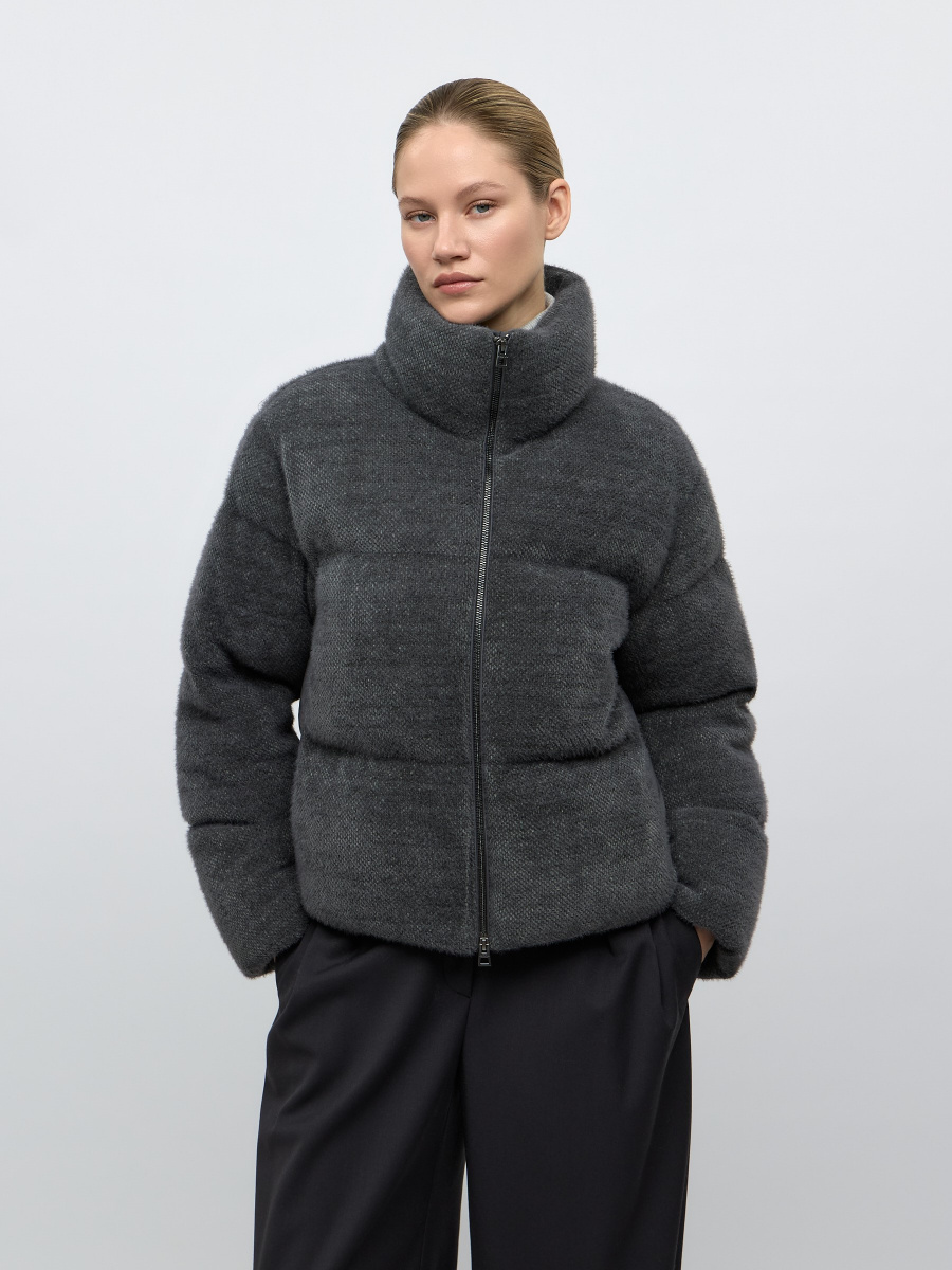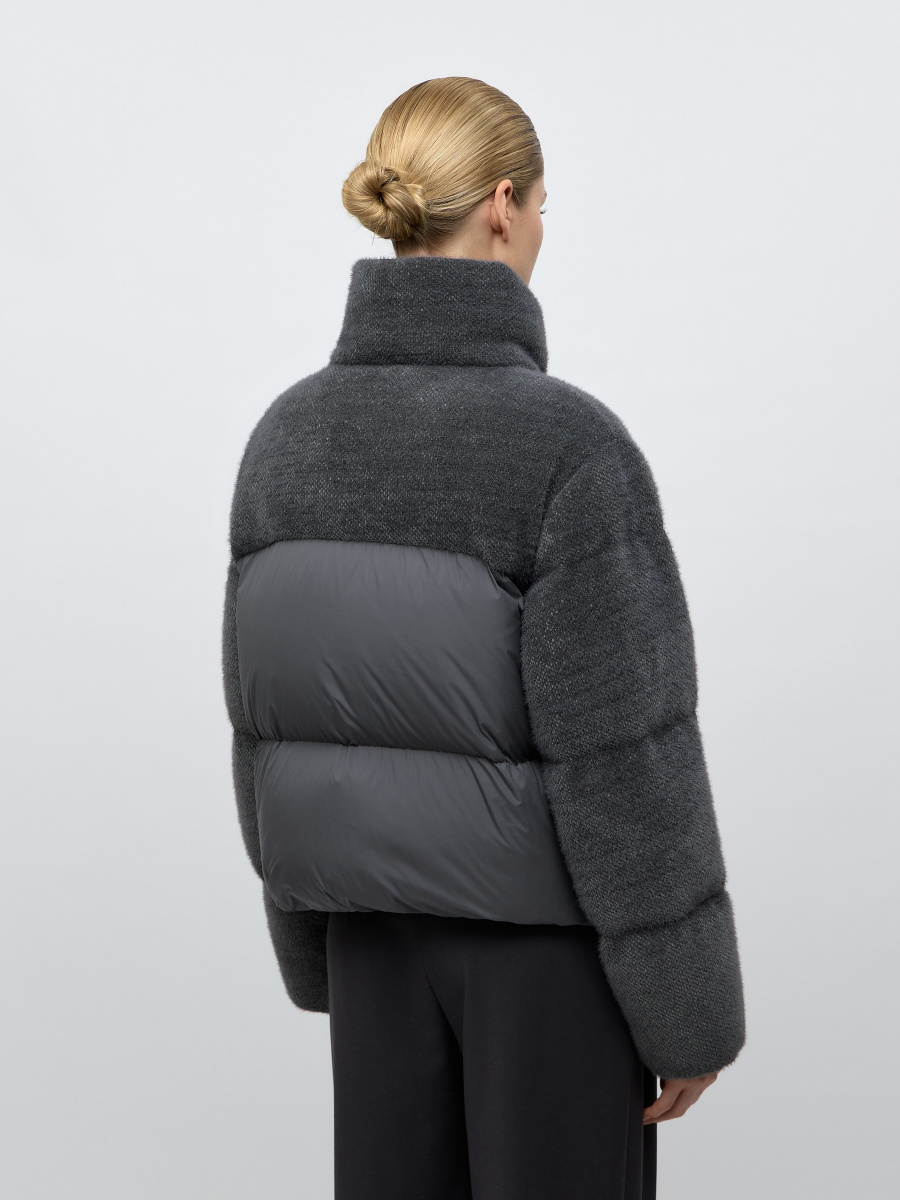 Укороченная пуховая куртка в комбинированной технике. Ворсистая ткань спереди напоминает вязаное трикотажное полотно, нижняя часть спинки выполнена из матового непродуваемого материала. Внутренняя резинка по низу собирает изделие и удерживает его объем. Застежка на двухзамковую металлическую молнию под горло, чтобы укрыться от холода и не носить шарф.