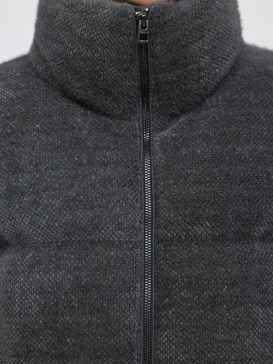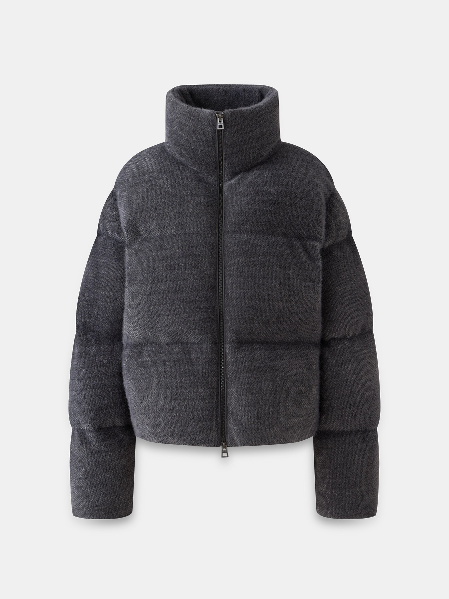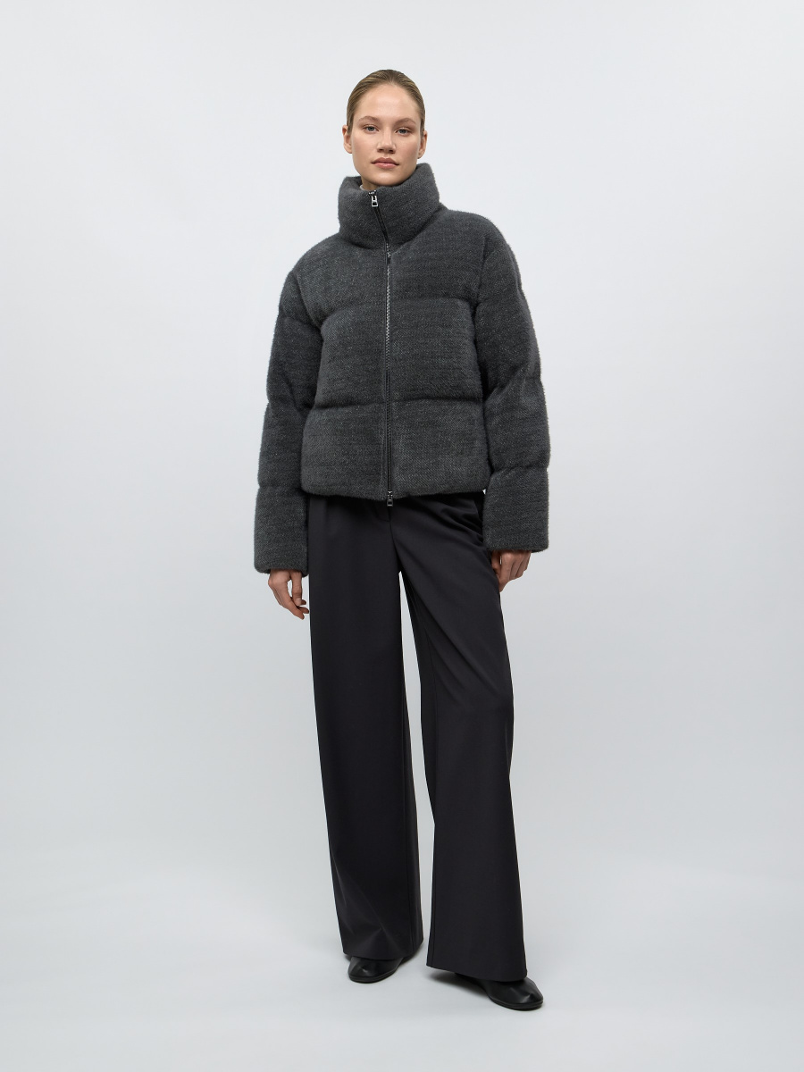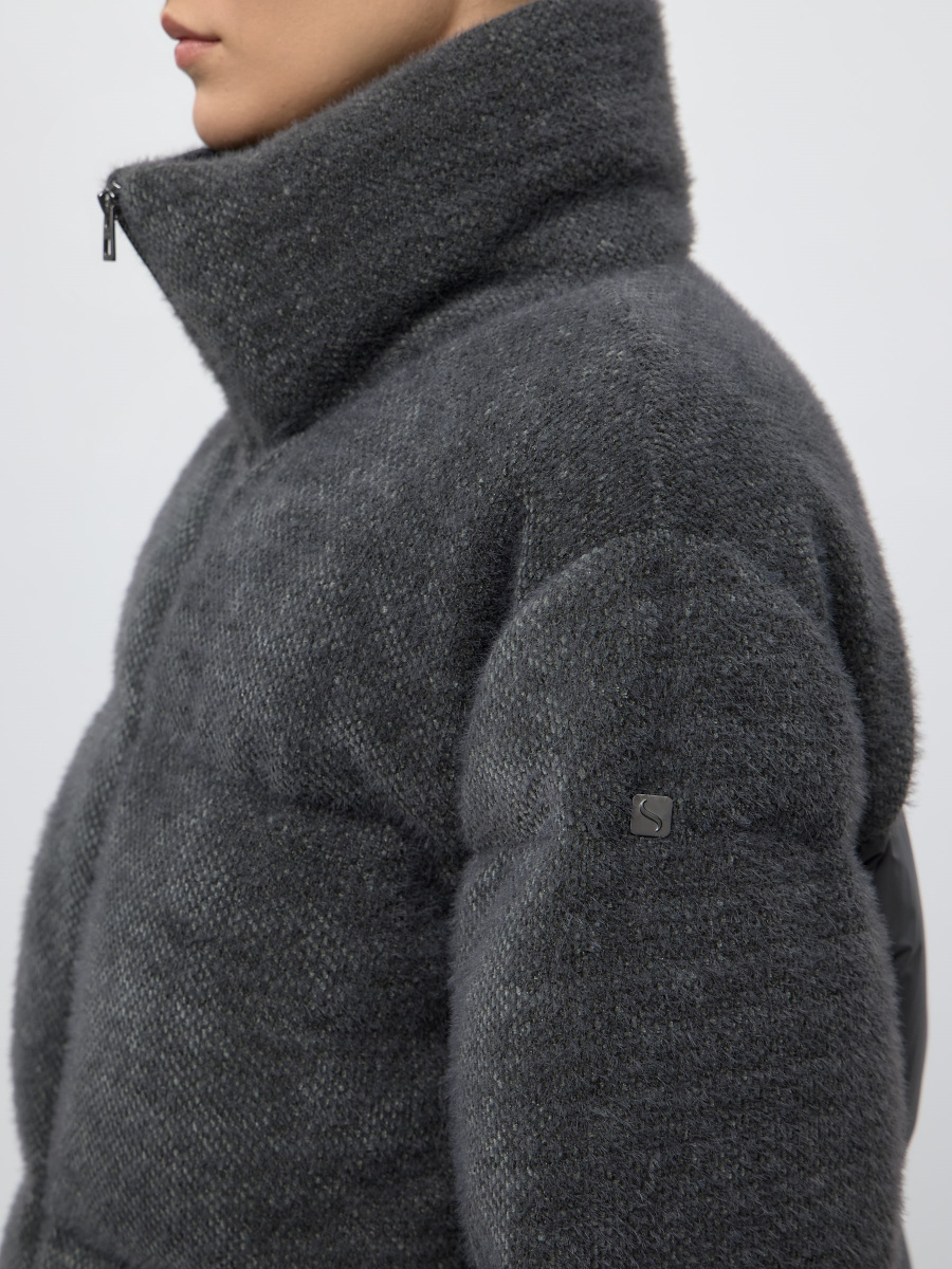 Укороченная пуховая куртка в комбинированной технике. Ворсистая ткань спереди напоминает вязаное трикотажное полотно, нижняя часть спинки выполнена из матового непродуваемого материала. Внутренняя резинка по низу собирает изделие и удерживает его объем. Застежка на двухзамковую металлическую молнию под горло, чтобы укрыться от холода и не носить шарф.