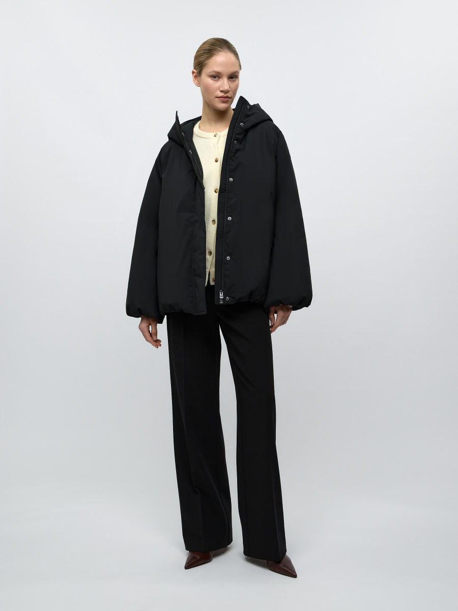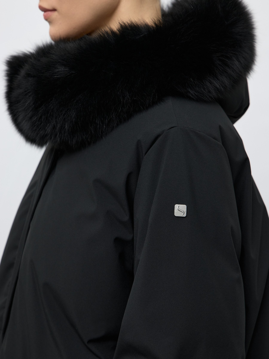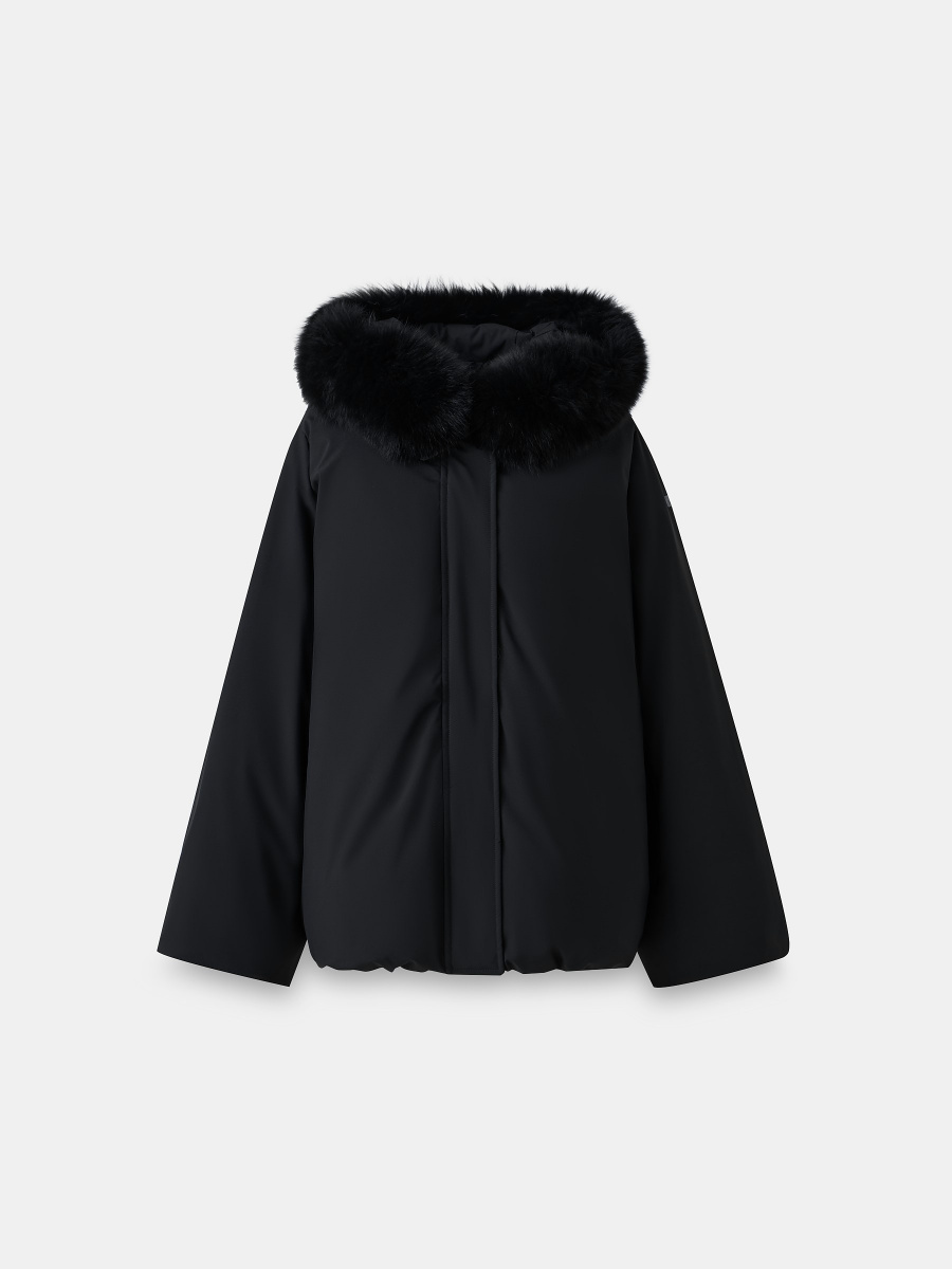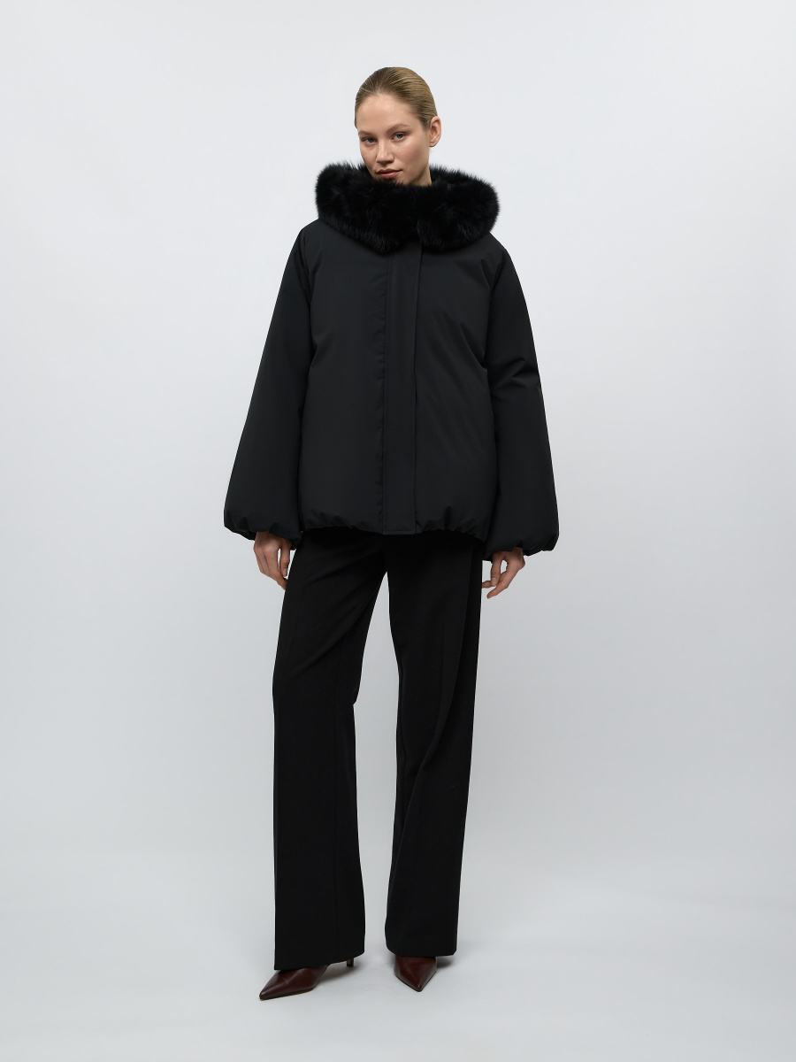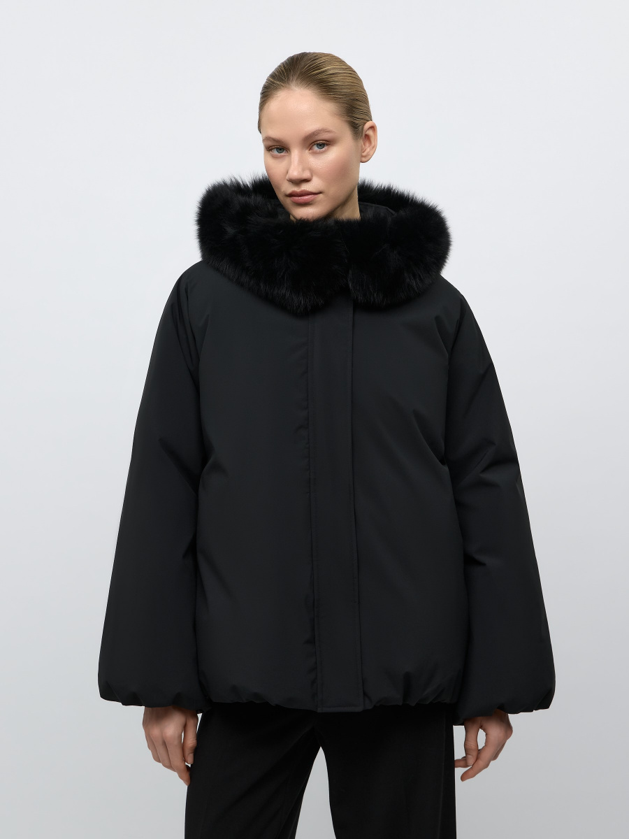 Укороченная, но теплая и женственная зимняя модель — из плотной матовой ткани, наполнителем пух-перо и съемным пушистым мехом лисы. Утепленный капюшон можно всю зиму носить вместо шапки. Объемные рукава-клеш и низ собраны на широкую резинку — так изделие сохраняет объем и не допускает поддувания. Застежка на нейлоновую молнию, ряд металлических кнопок и ветрозащитную планку.