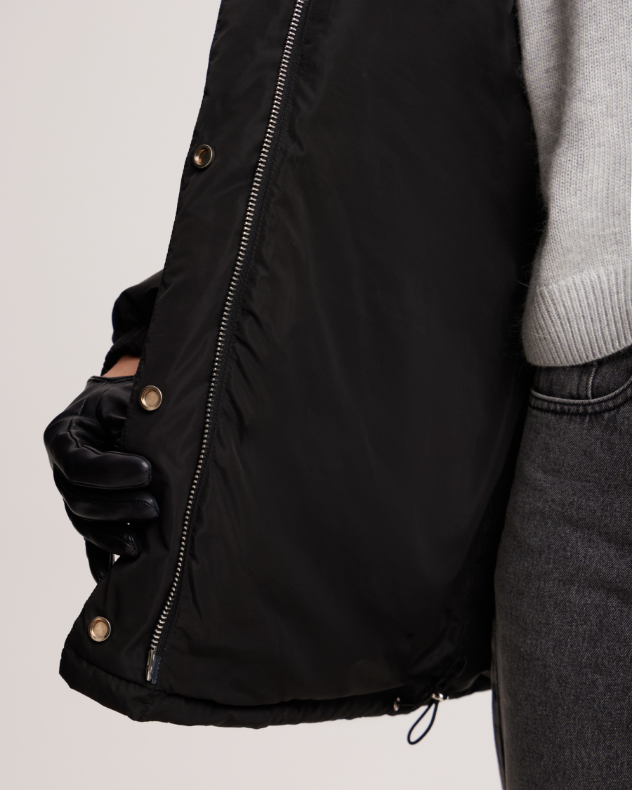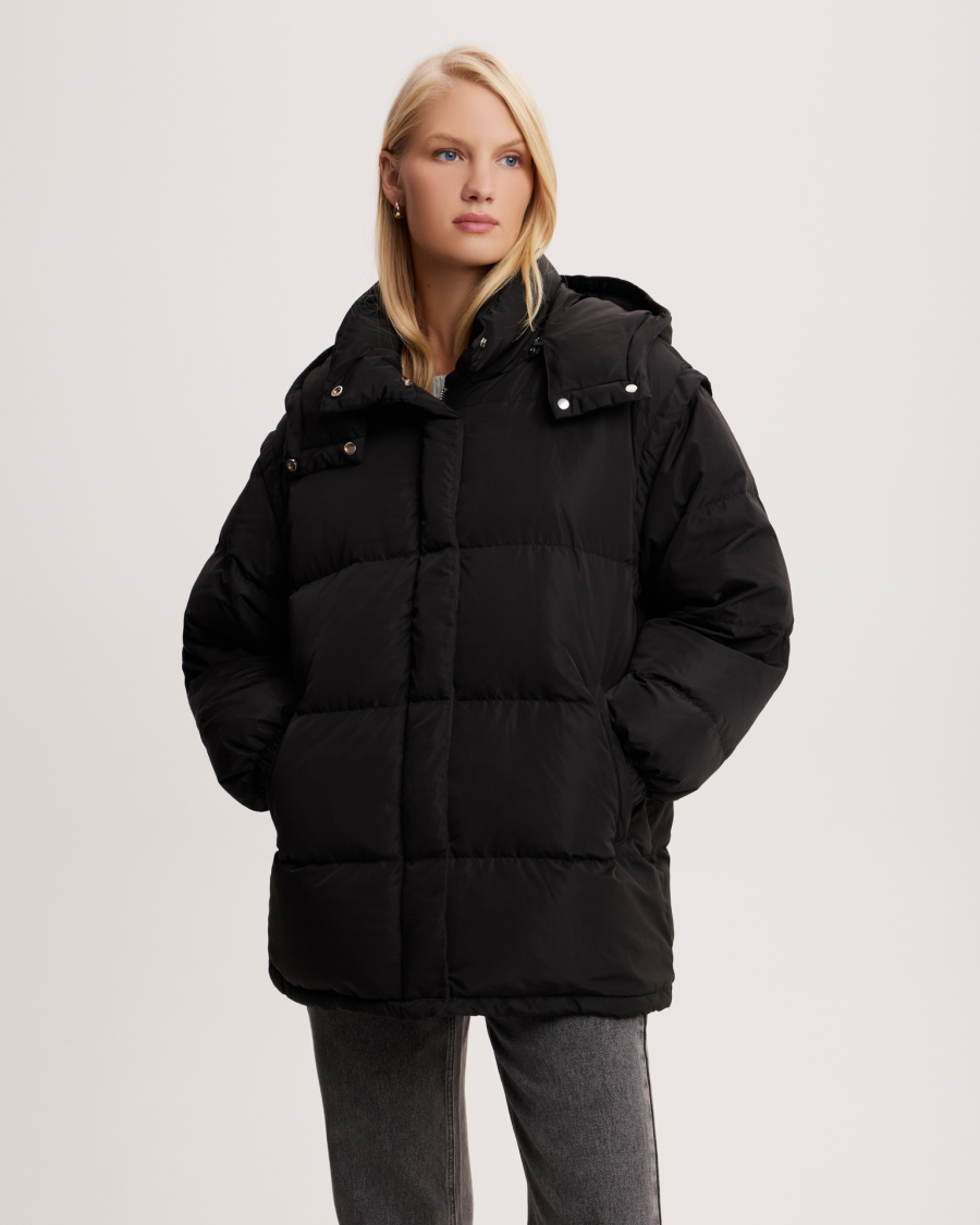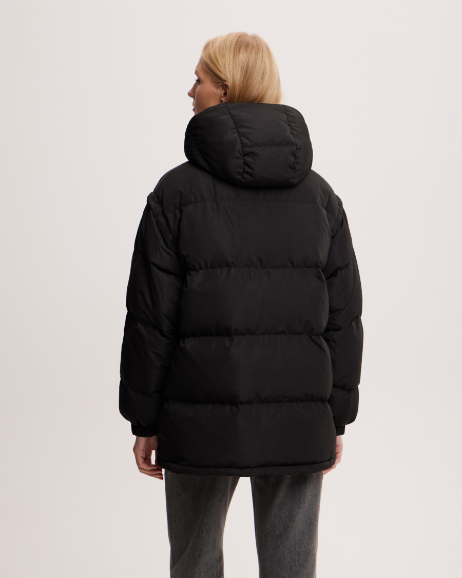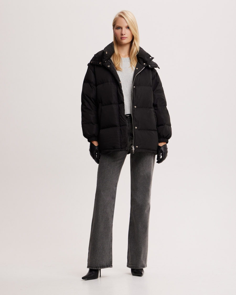Стеганая удлиненная куртка с воротником-стойкой и капюшоном. Застежка на молнии с дополнительными заклепками. Универсальная куртка на пуху для создания стильных образов. Носите ее с трикотажными брюками или вязаными костюмами из нашей коллекции.