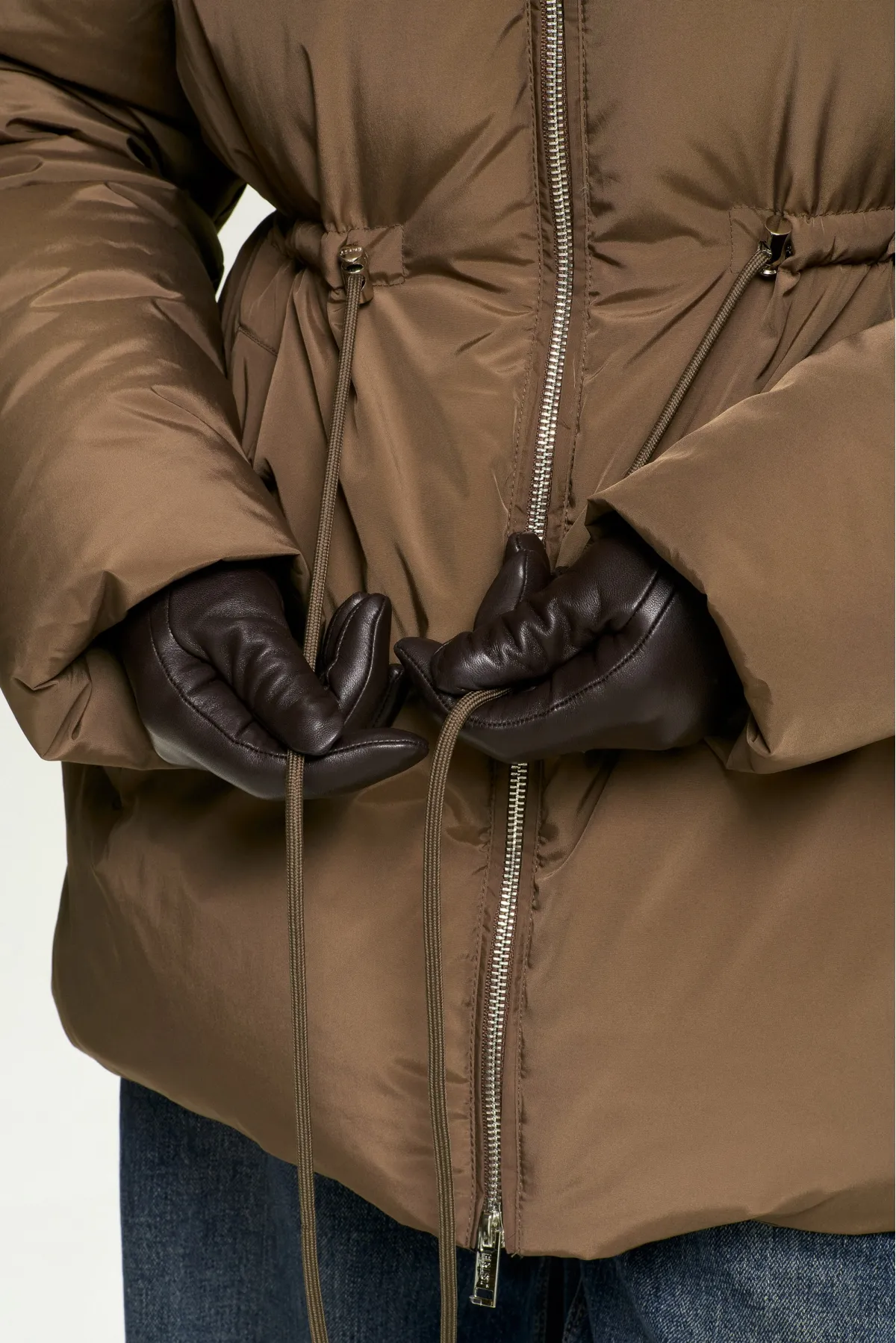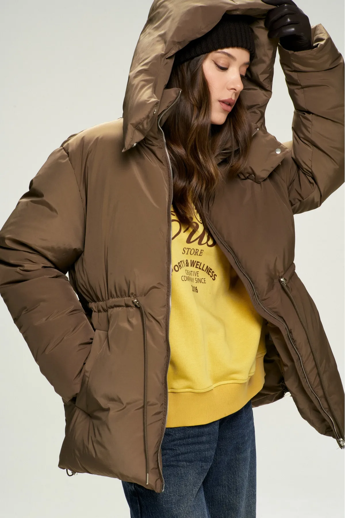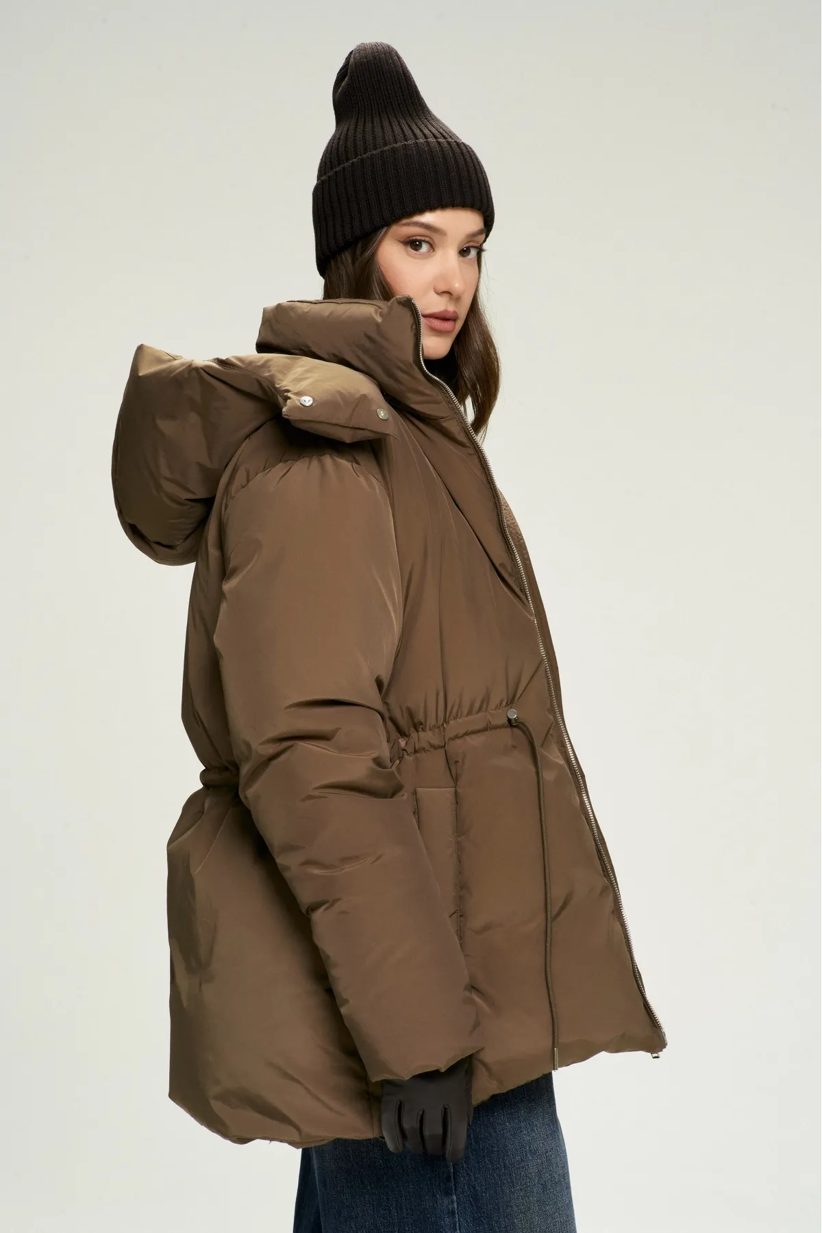 Средняя длина и продуманная конструкция, которые вместе обеспечивают тепло до −25°C. Высокий ворот и отстёгивающийся капюшон защищают от ветра, а кулиски на поясе и по низу позволяют менять силуэт: стяните для более аккуратной посадки или оставьте свободным.