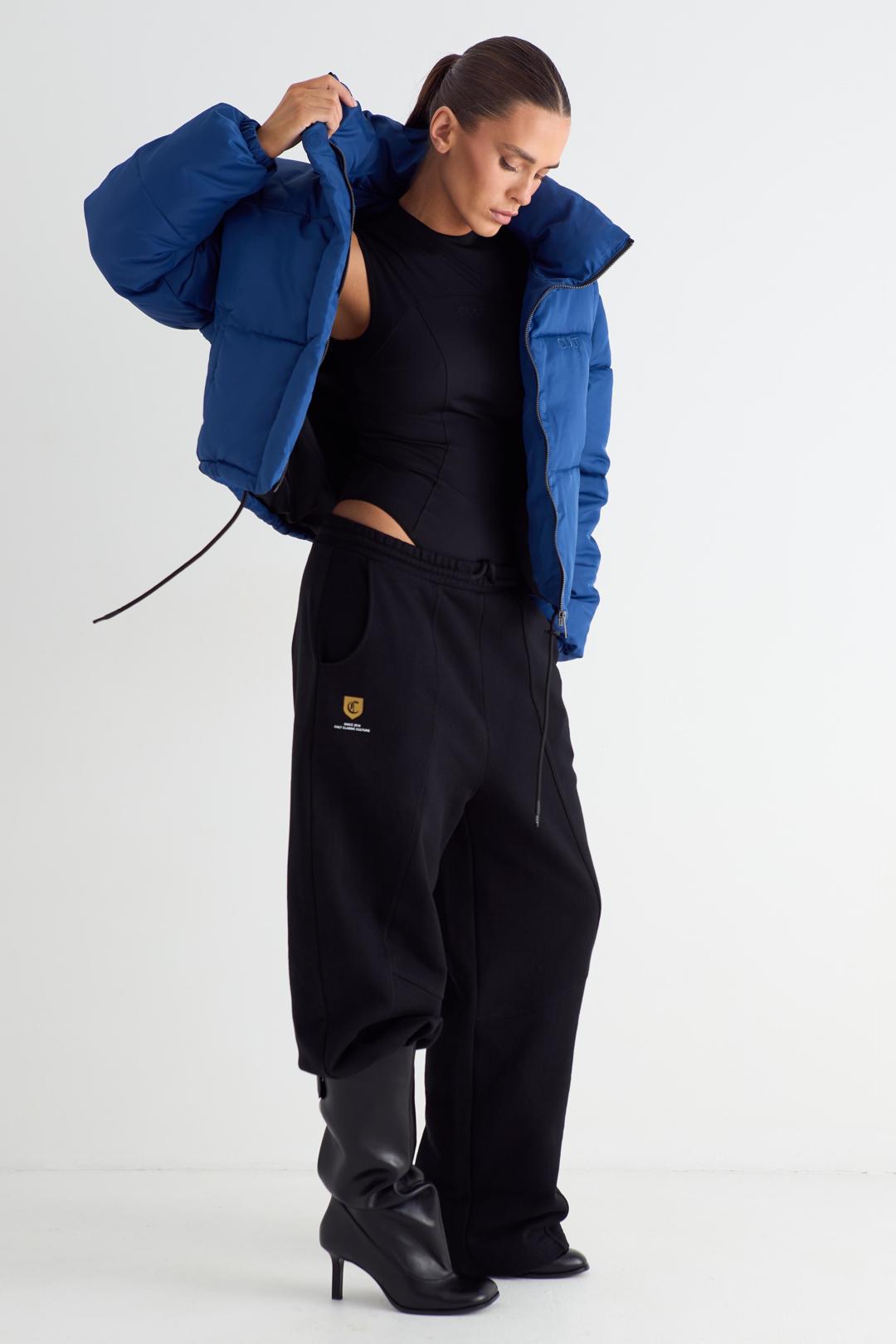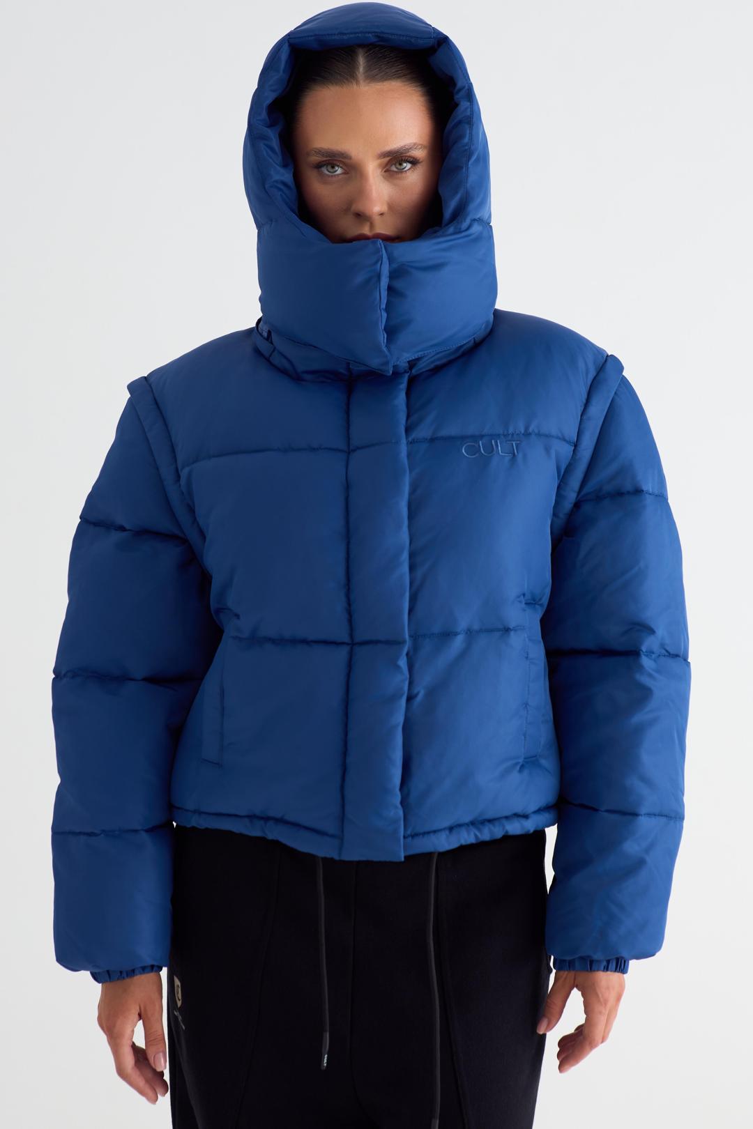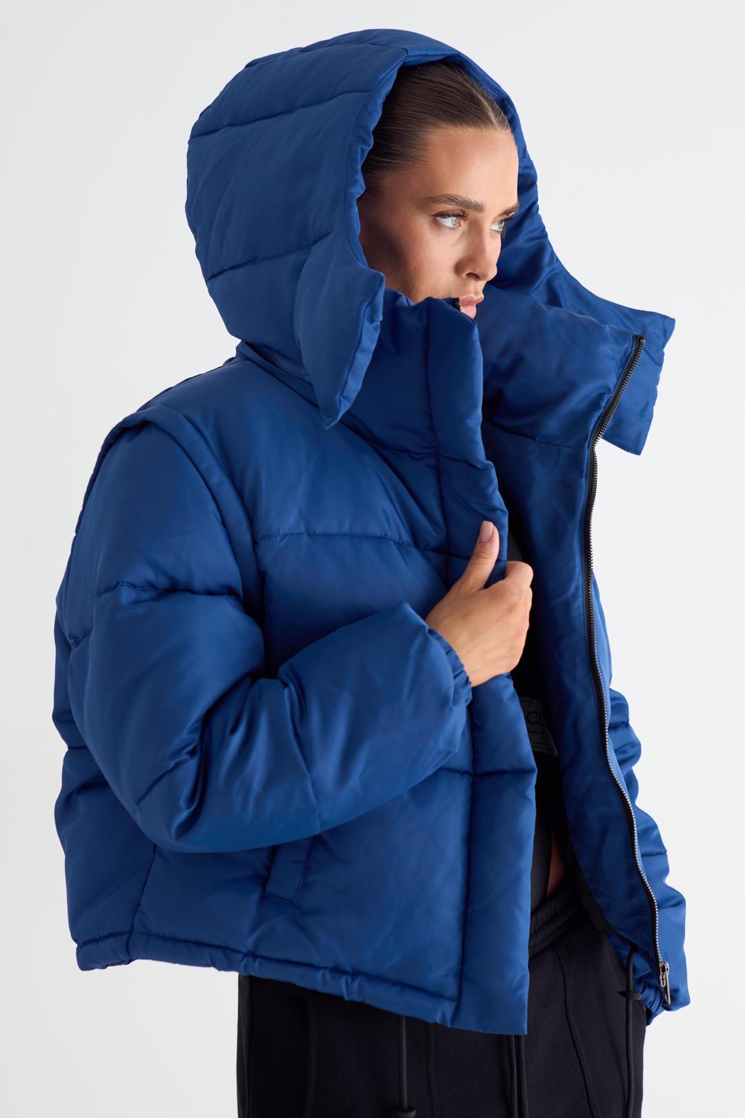 Пуховик женский укороченный с отстёгивающимся капюшоном. Застежка на молнию и планку с магнитными кнопками. Изделие с внутренним и боковыми карманами. По низу изделия шнурок для регулировки объема. Манжеты на эластичной тесьме. Слева на полочке и по центру спинки брендированные принты.