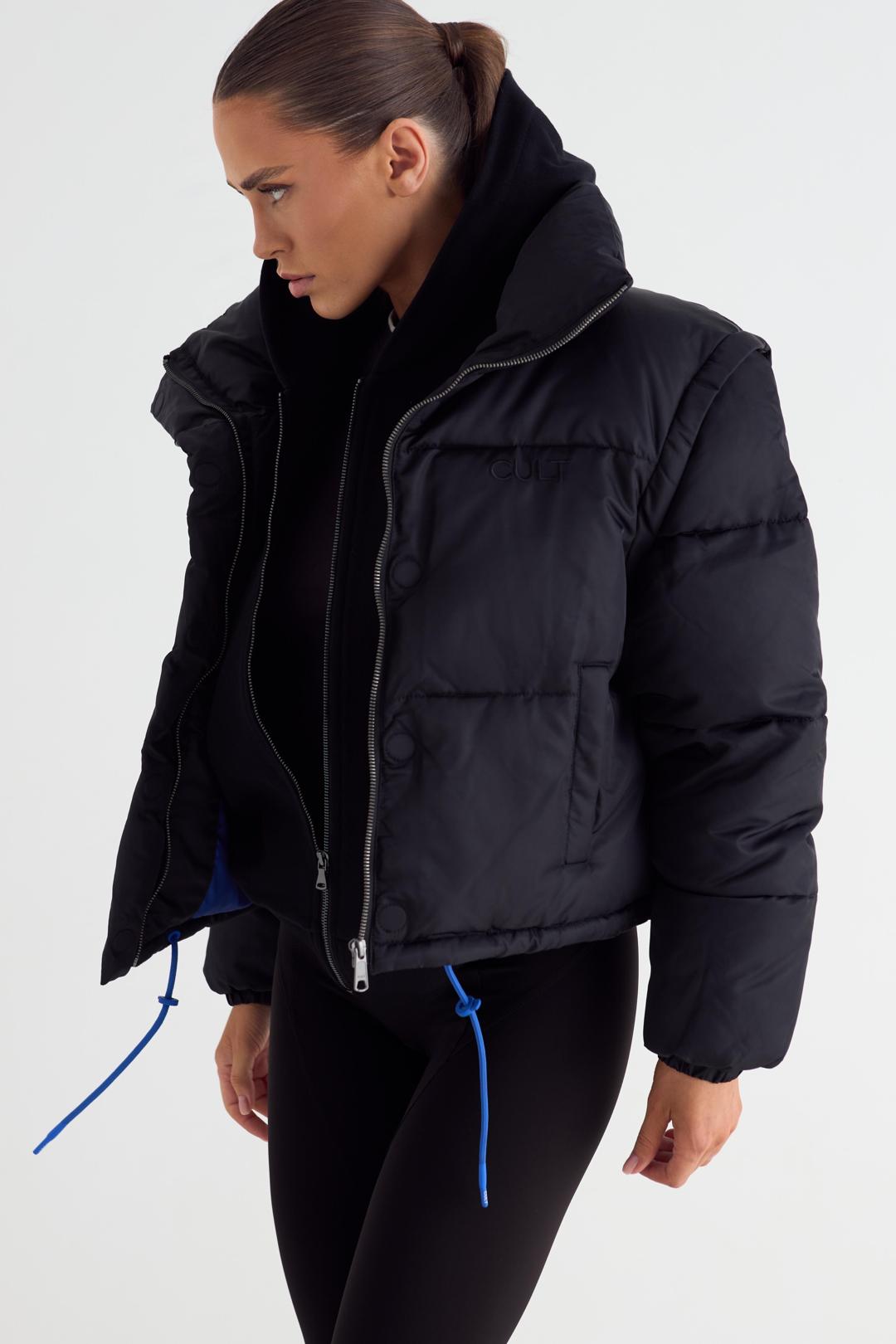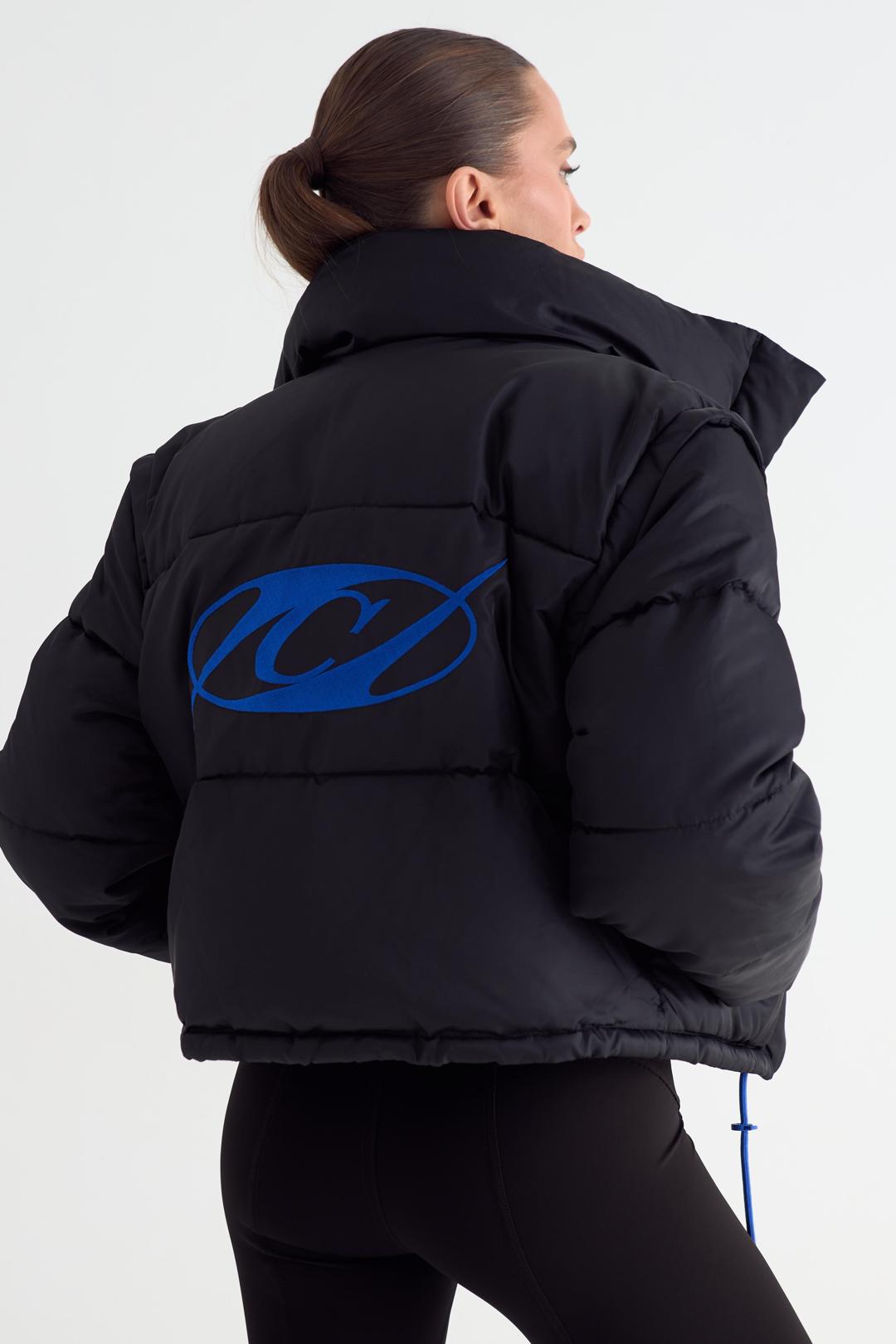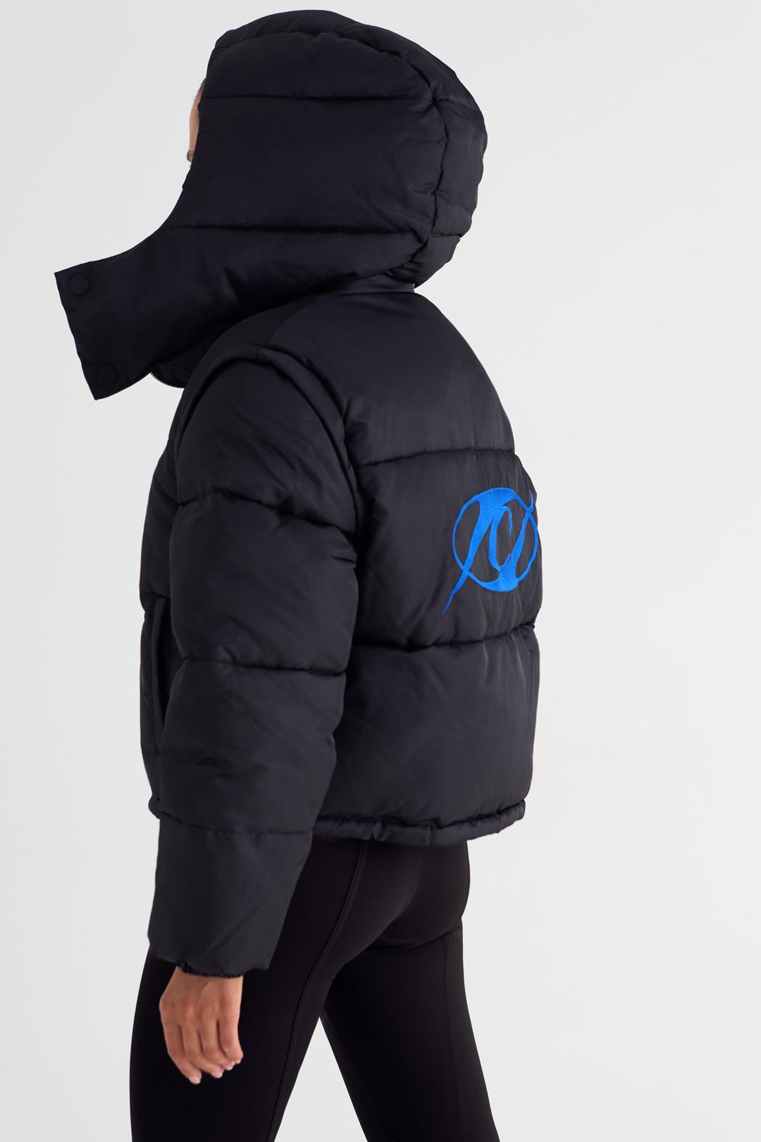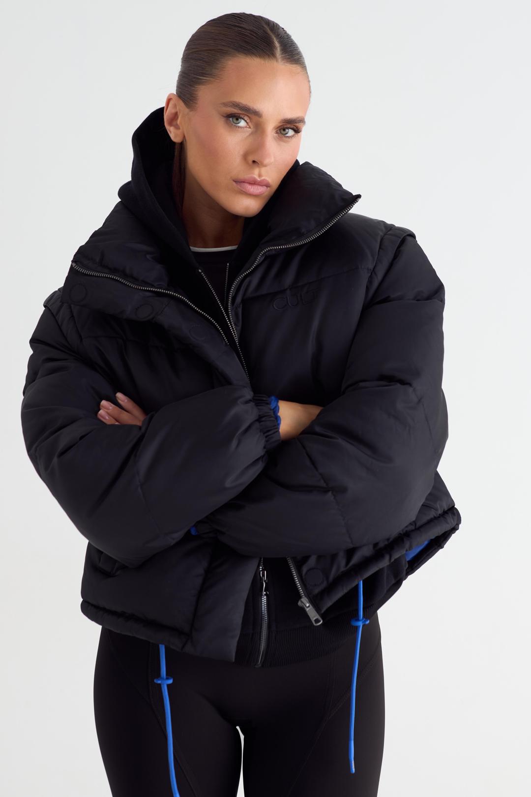 Пуховик женский укороченный с отстёгивающимся капюшоном. Застежка на молнию и планку с магнитными кнопками. Изделие с внутренним и боковыми карманами. По низу изделия шнурок для регулировки объема. Манжеты на эластичной тесьме. Слева на полочке и по центру спинки брендированные принты.