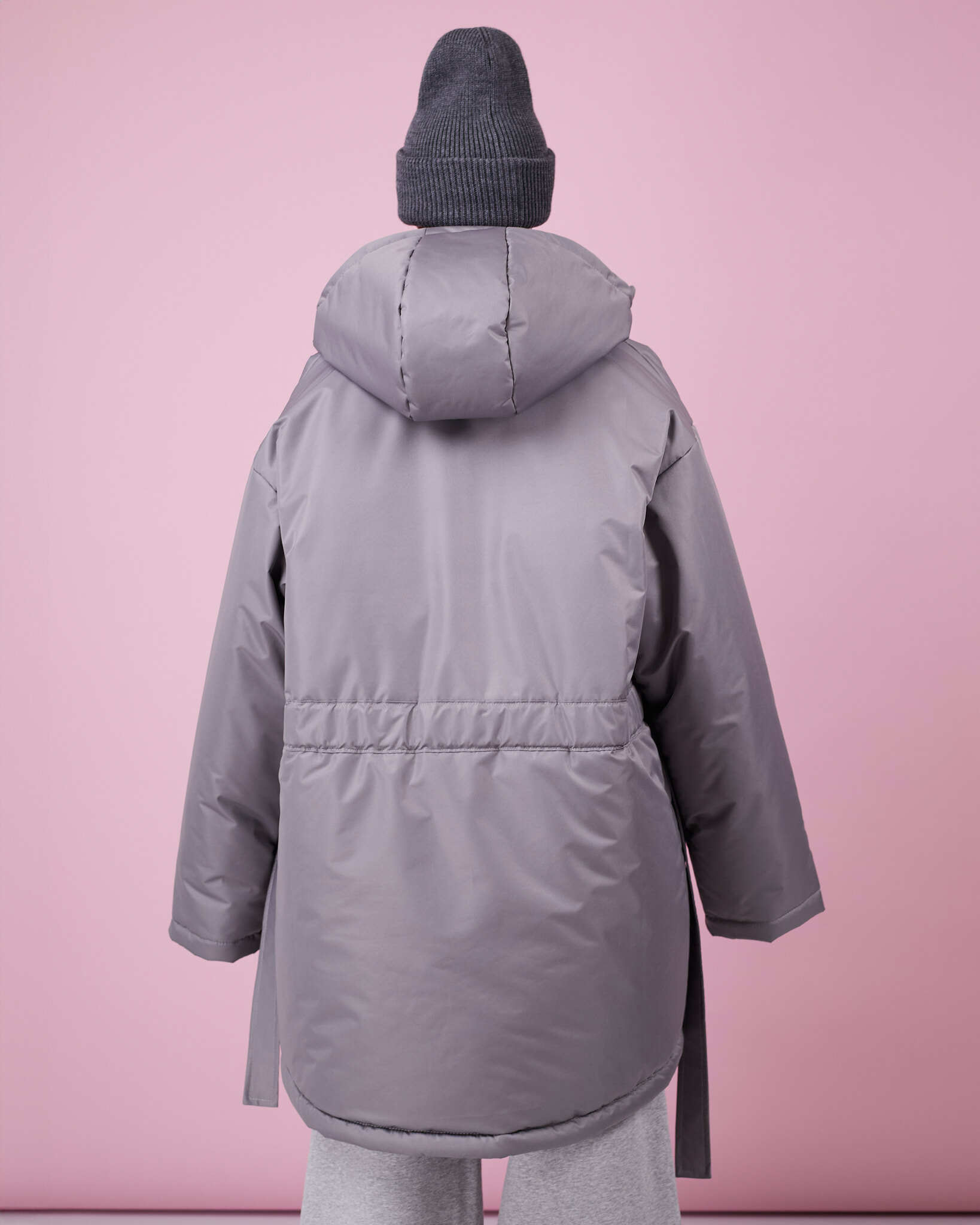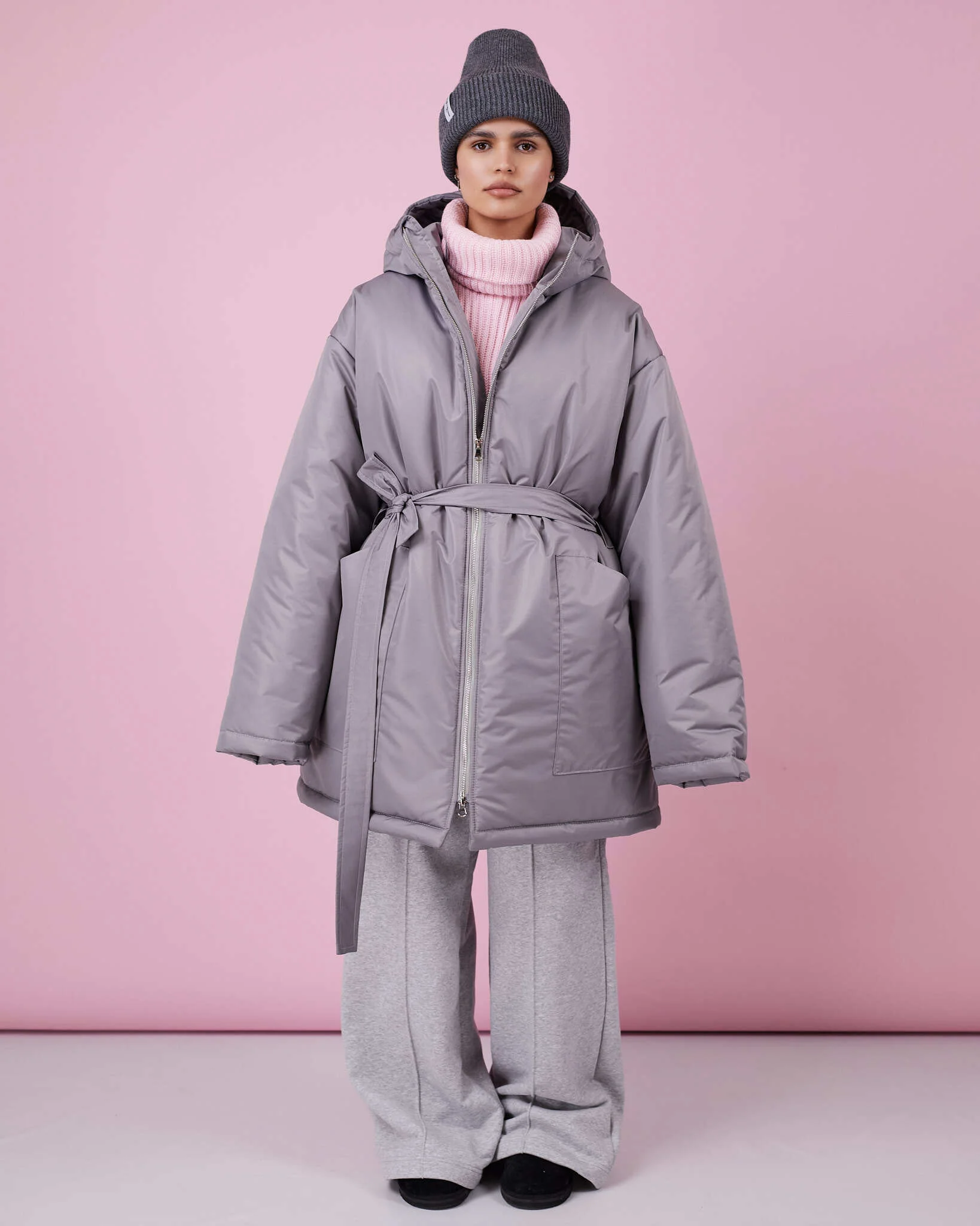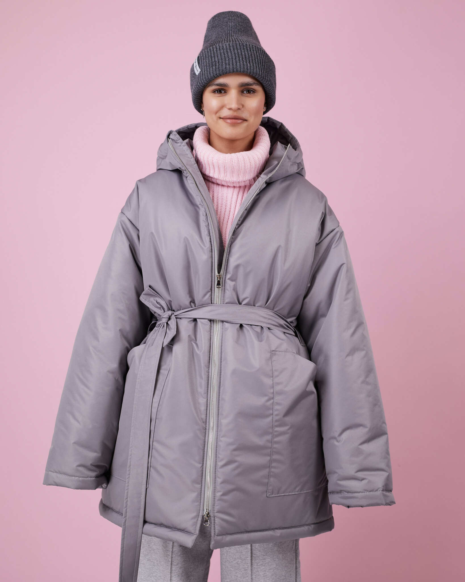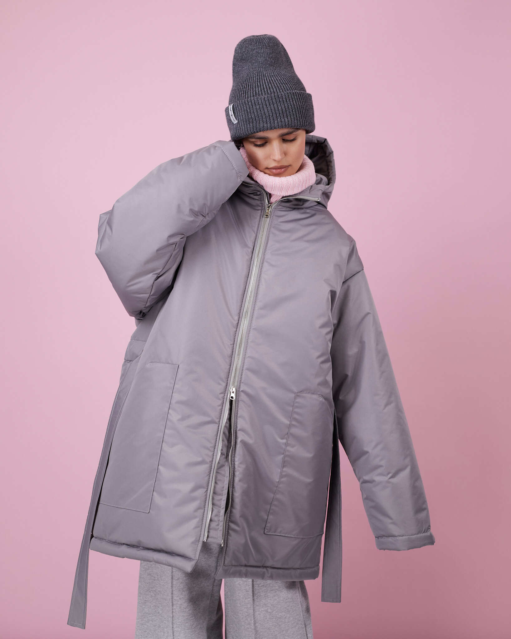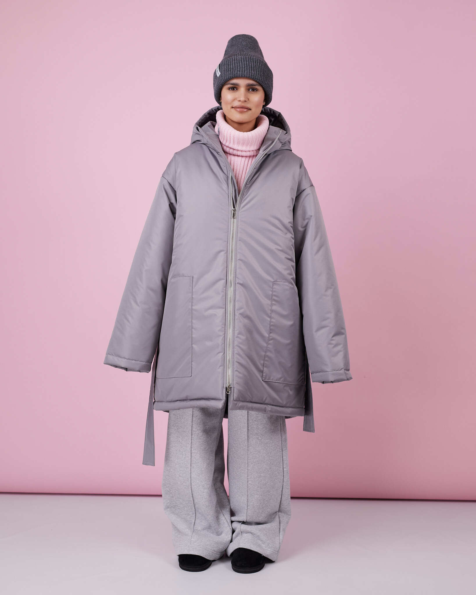 Прямой оверсайз крой, возможность затягивания пояса, глубокие боковые карманы, внутренний карман на молнии.