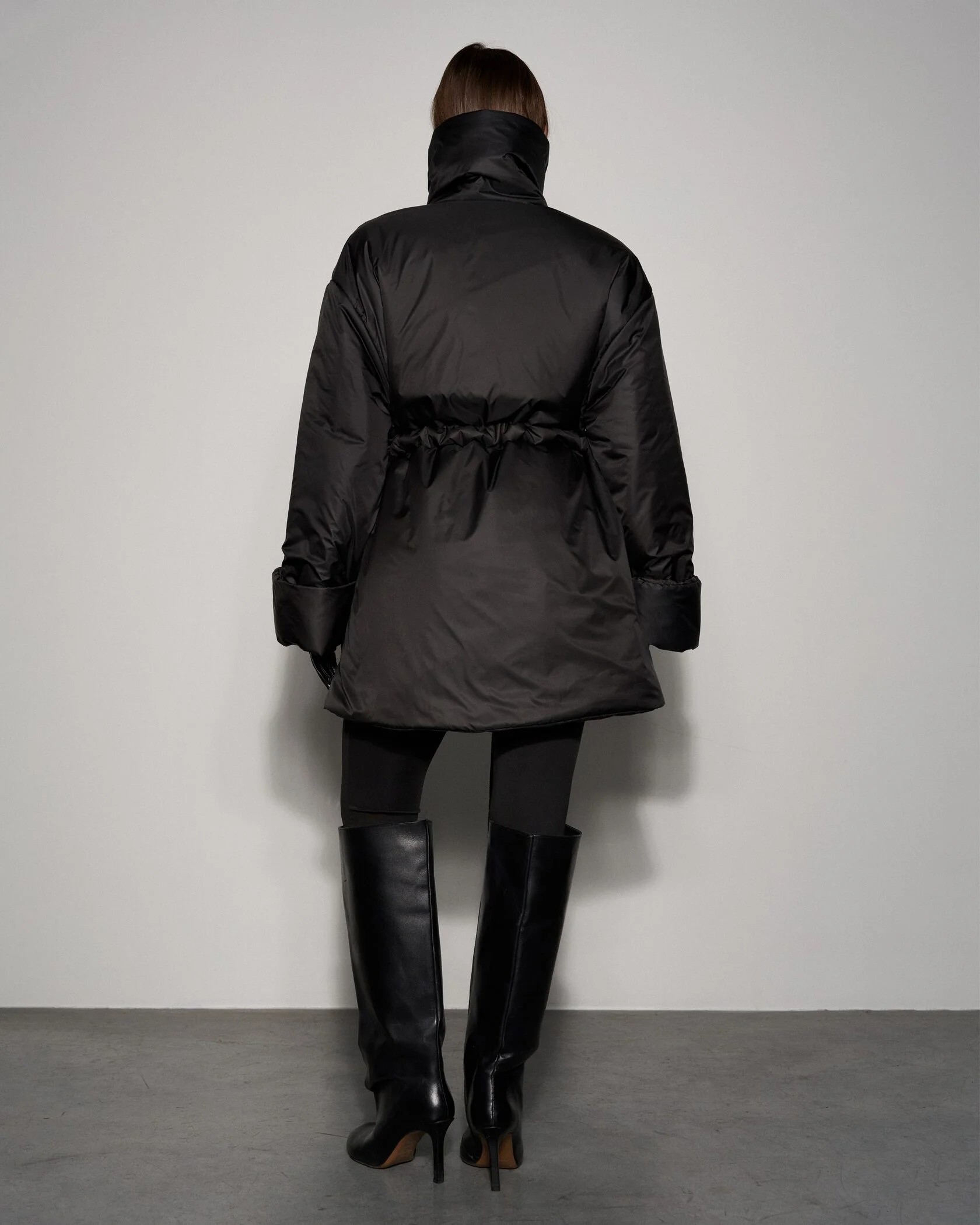 Укороченный пуховик чёрного цвета с объемным воротником и мягкой стёжкой. Свободный крой и пояс на талии позволяют регулировать посадку и создавать выразительный силуэт. Утеплённая модель подойдёт для холодного сезона (до -25°C), сочетая функциональность и продуманный дизайн.