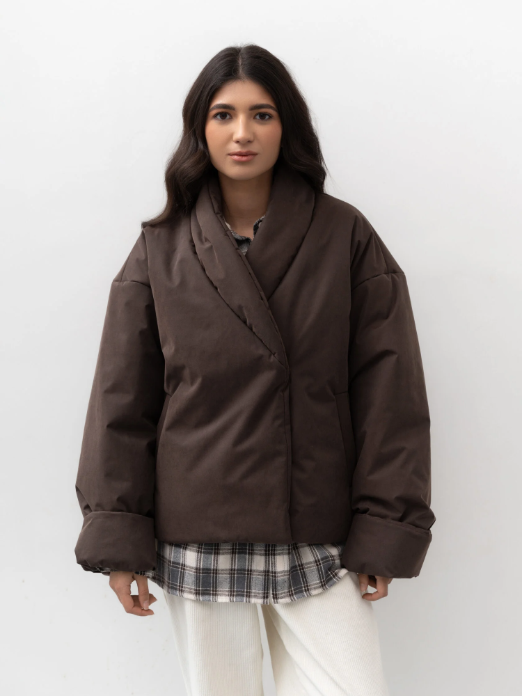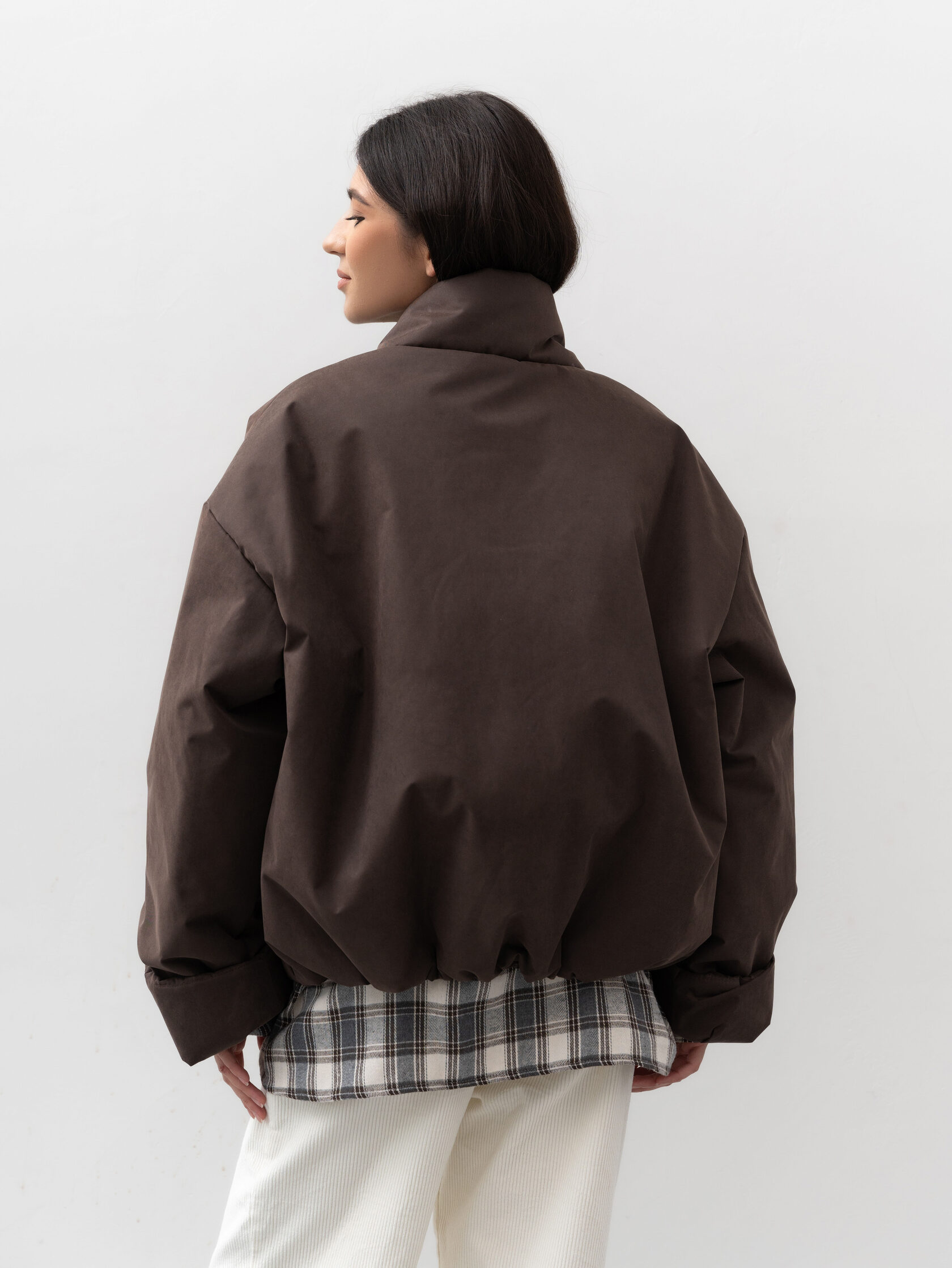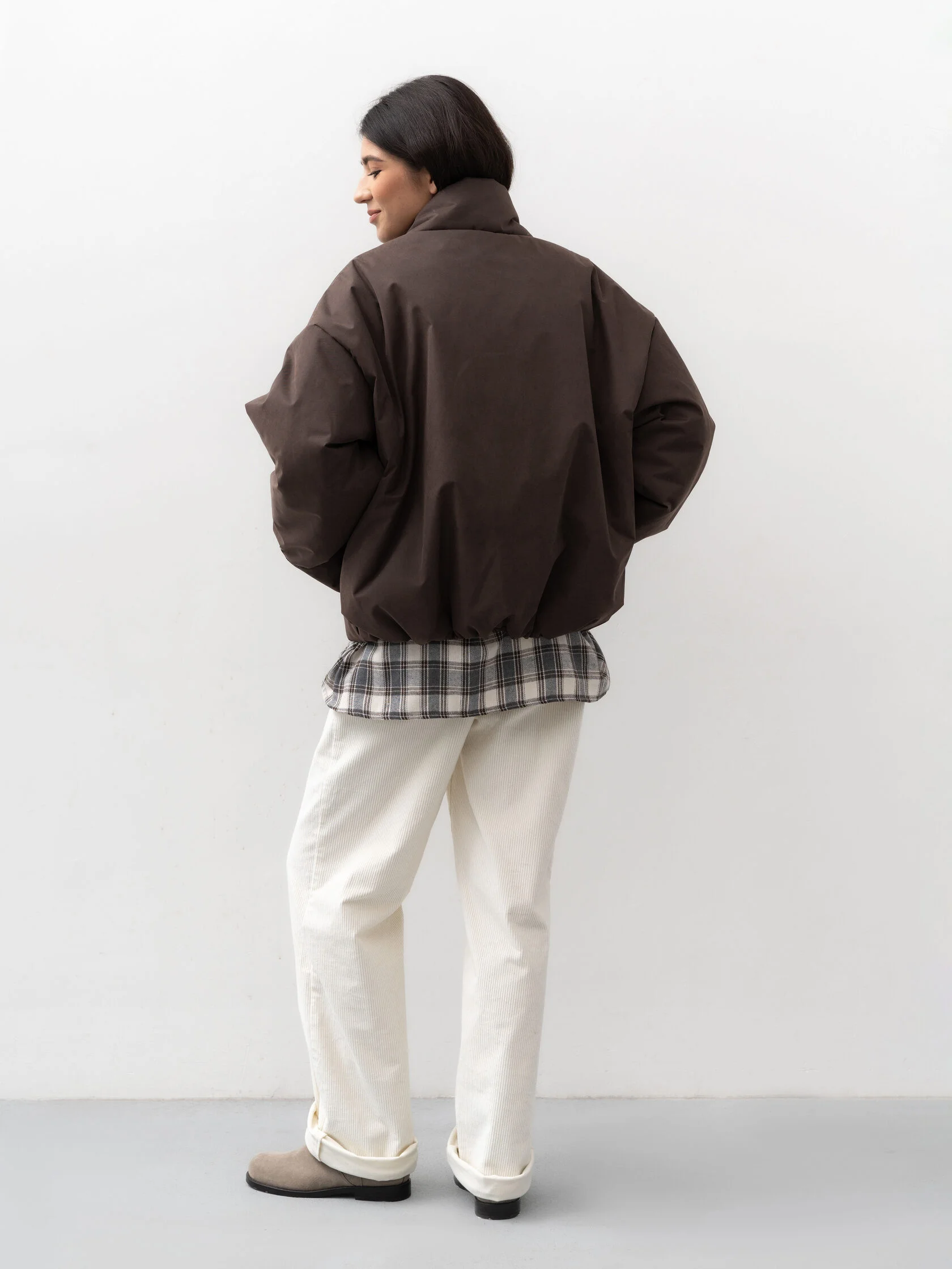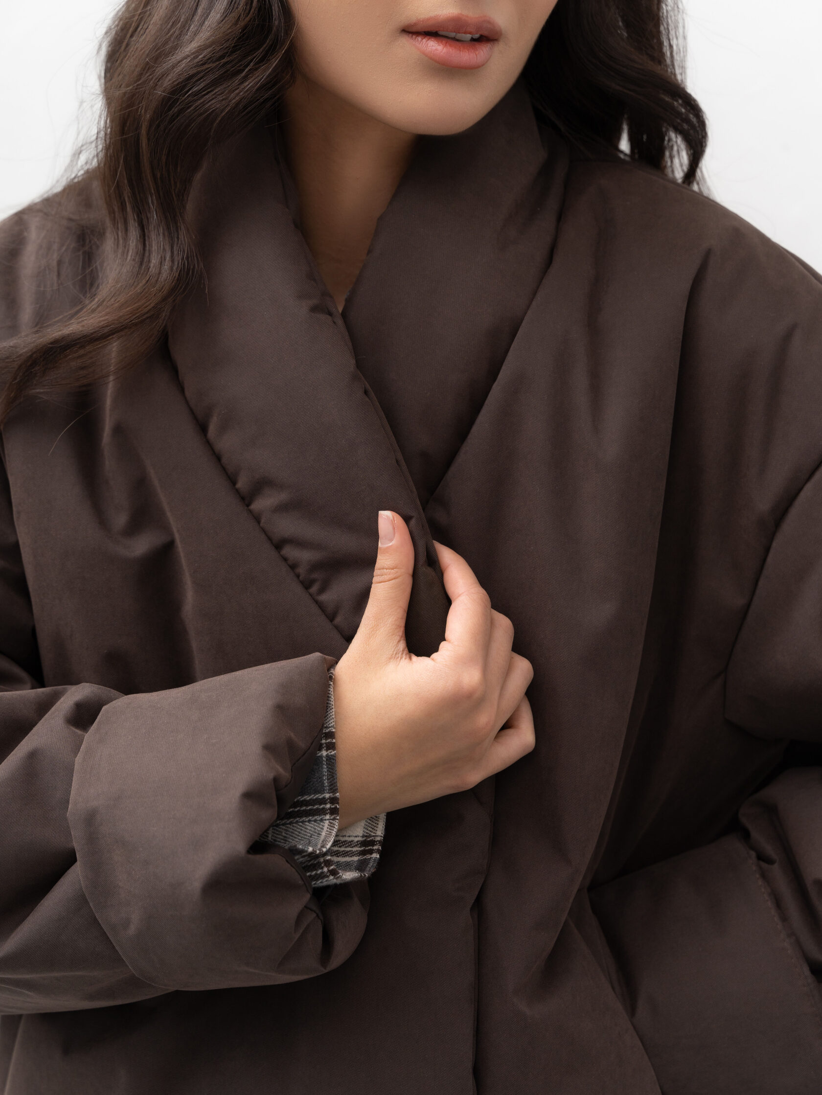 Куртка в шоколадном оттенке с оверсайз-силуэтом – уютный и теплый спутник холодного сезона. Наполнитель из альполюкса и подкладка из полиэстера обеспечивают комфорт и защиту от ветра, а спущенный рукав и застежка на кнопках делают образ расслабленным и стильным. Хорошо смотрится как с брюками, так и с юбками — легко создать женственный городской образ