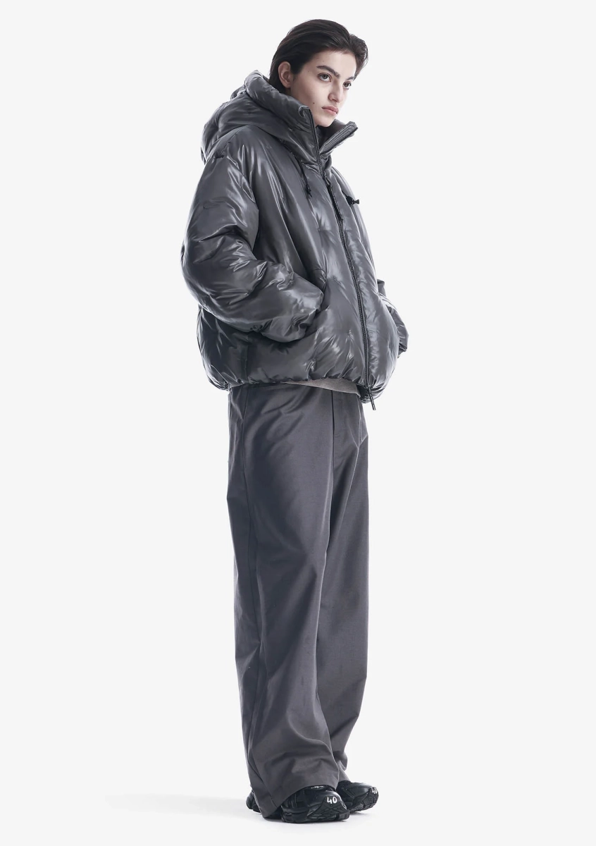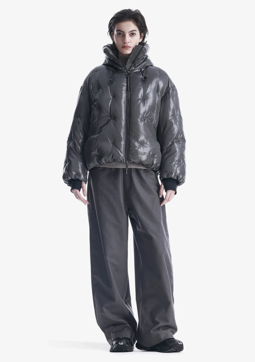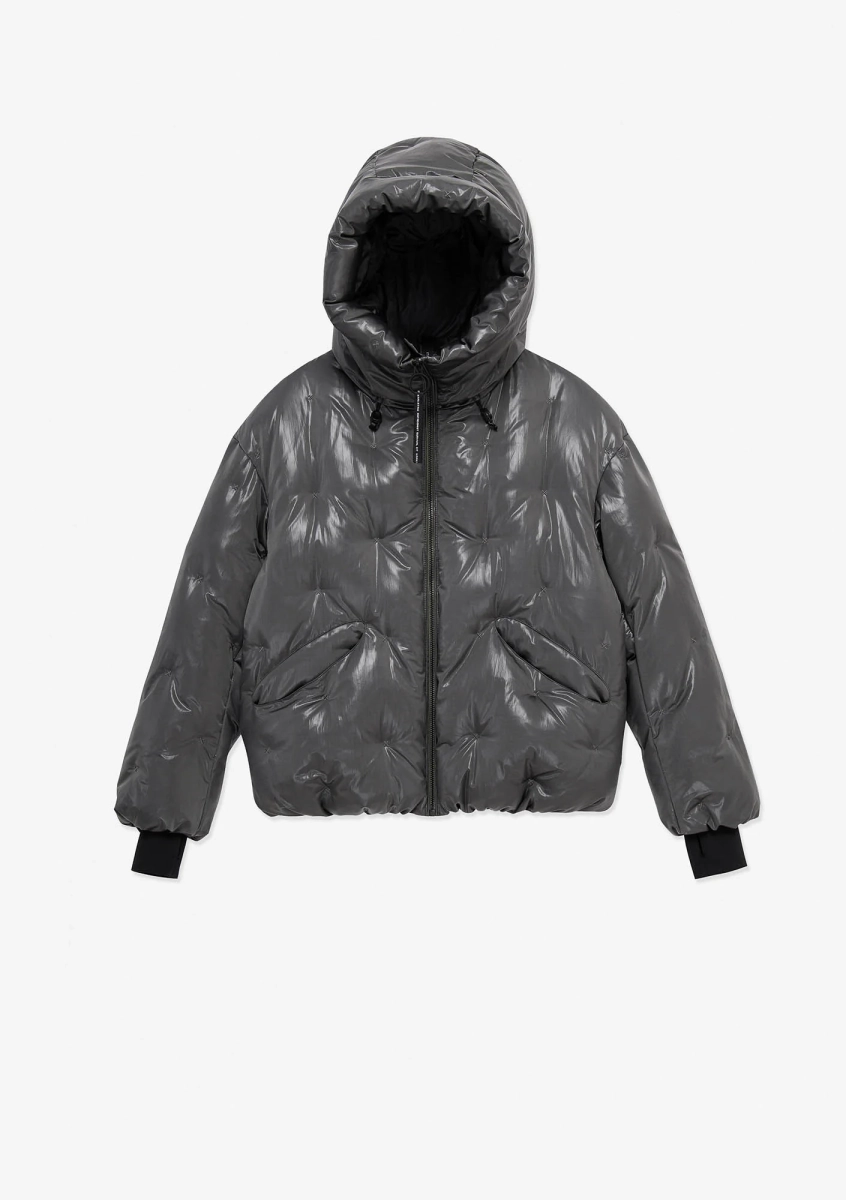 Ткань с эффектом бликов и глубины состоит из двух соединённых слоёв: полупрозрачного гладкого нейлона снаружи и переработанного полиэстера с плотной фактурой внутри. Cire-финиш удерживает пух и усиливает водоотталкивающие свойства. Покрыта стойким водоотталкивающим составом из экологичных ингредиентов без содержания PFC — не загрязняет окружающую среду и безвреден для организма человека.