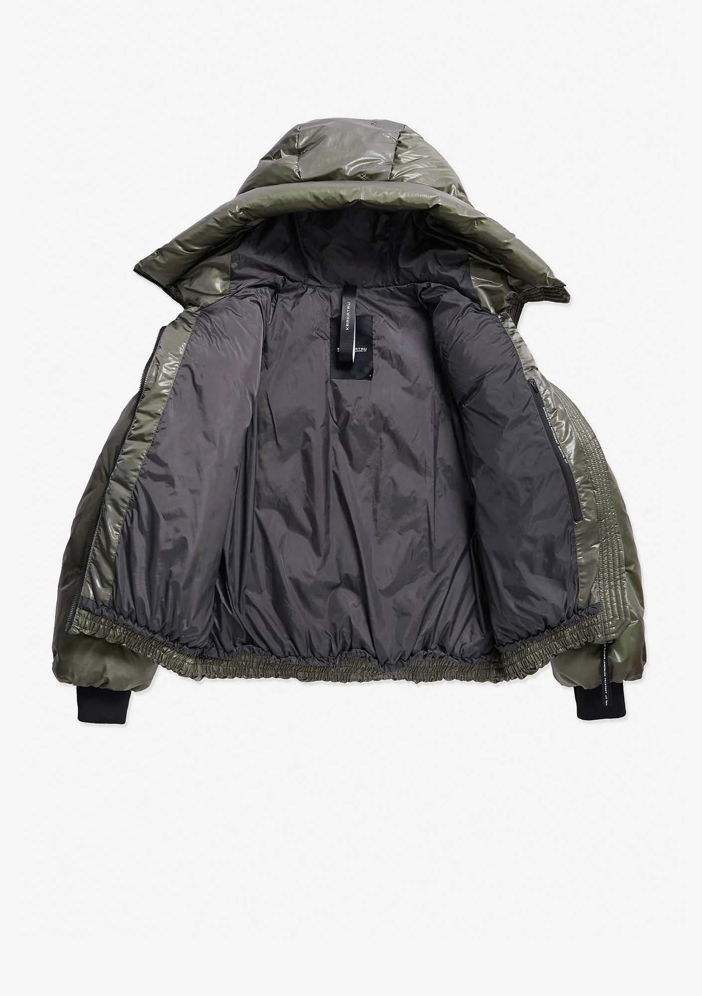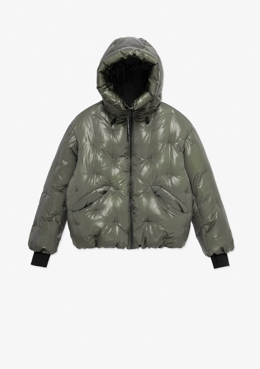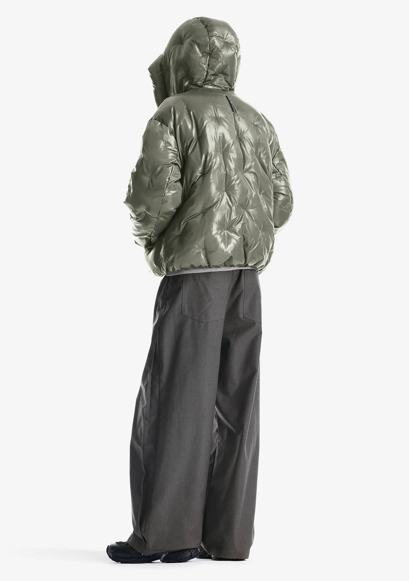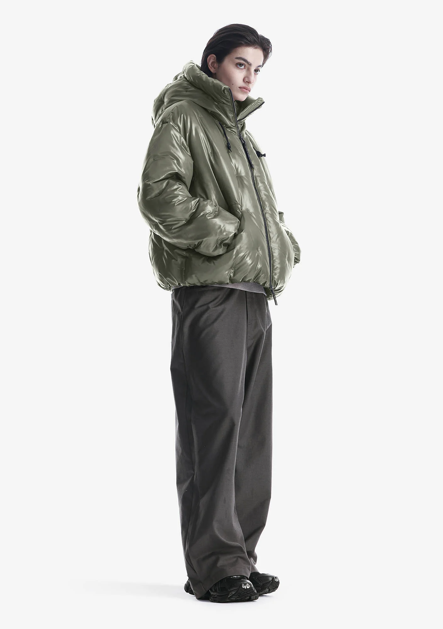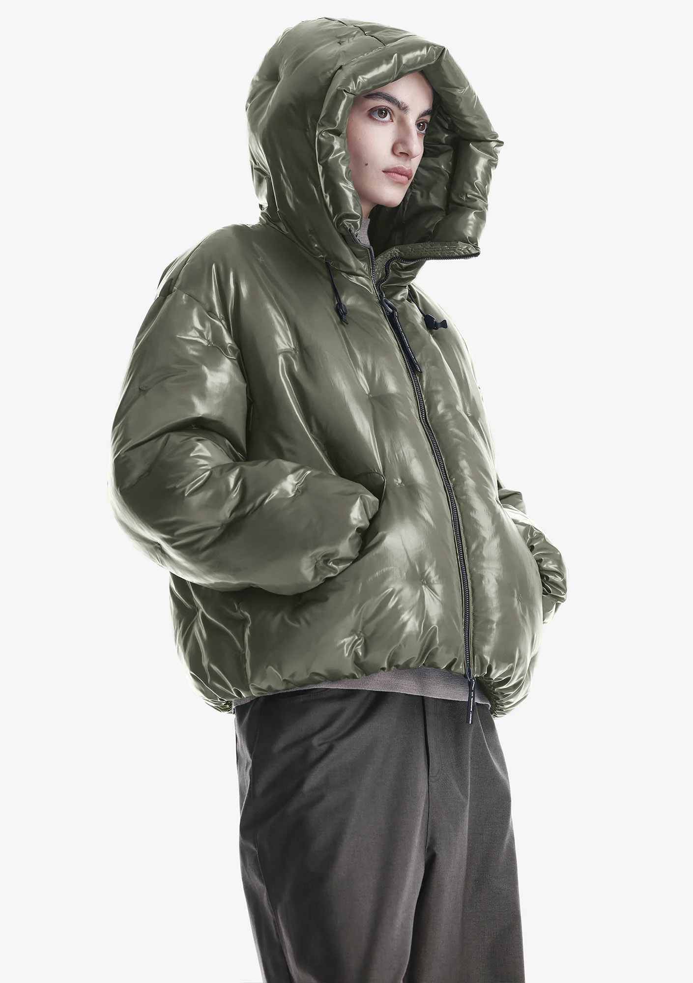 Ткань с эффектом бликов и глубины состоит из двух соединённых слоёв: полупрозрачного гладкого нейлона снаружи и переработанного полиэстера с плотной фактурой внутри. Cire-финиш удерживает пух и усиливает водоотталкивающие свойства. Покрыта стойким водоотталкивающим составом из экологичных ингредиентов без содержания PFC — не загрязняет окружающую среду и безвреден для организма человека.