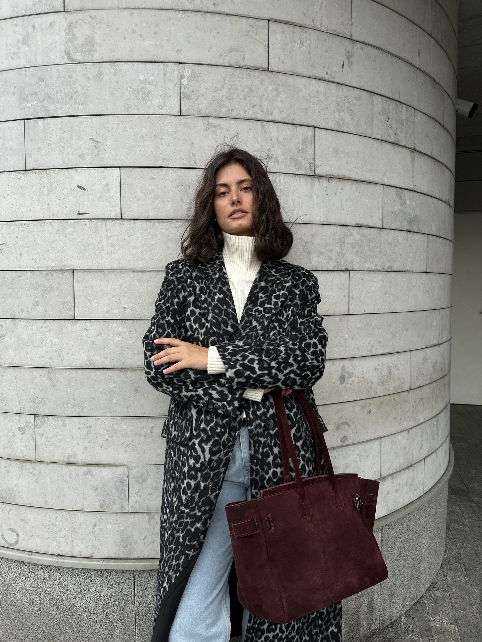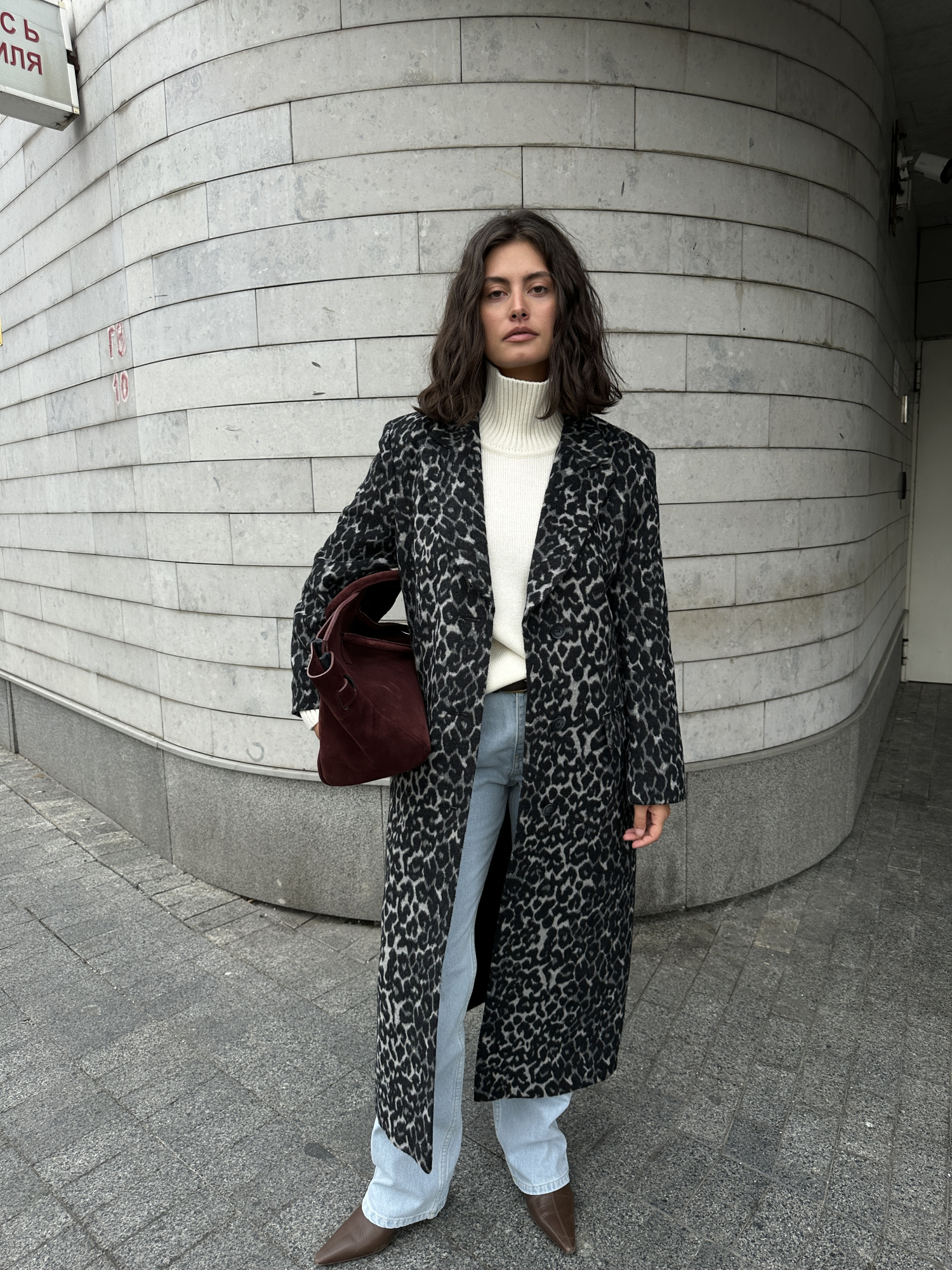 Однобортное пальто из смесовой шерсти в актуальной леопардовой расцветке.