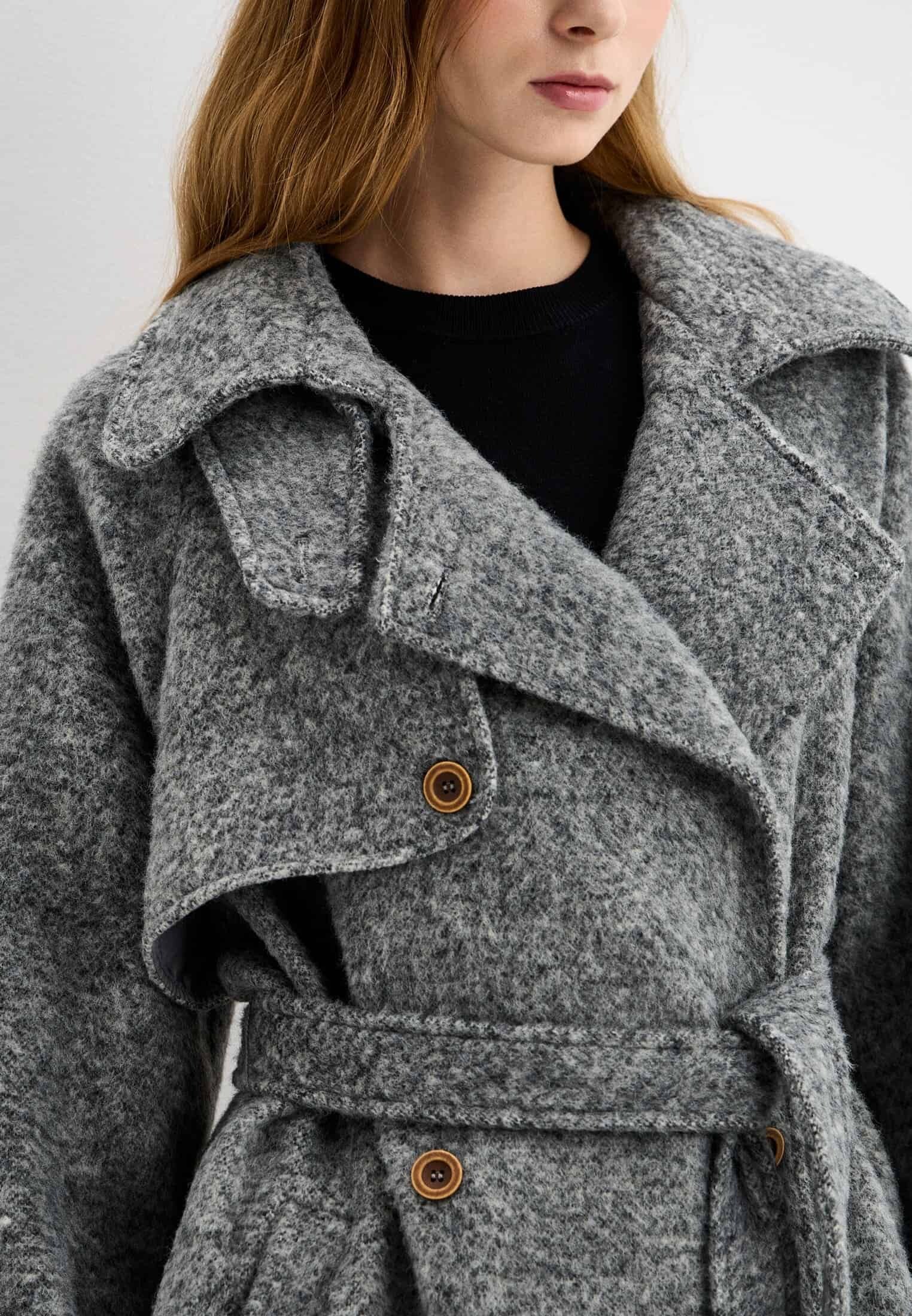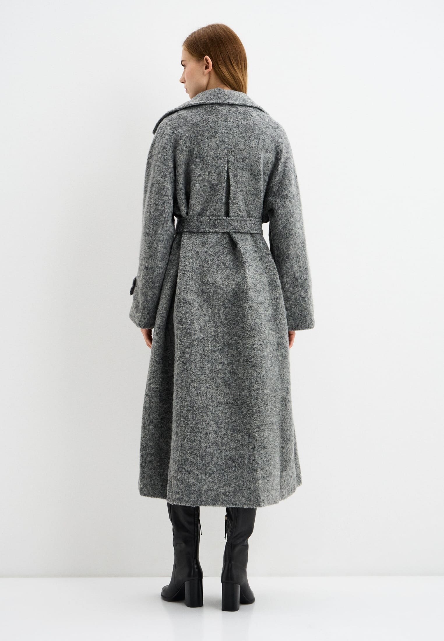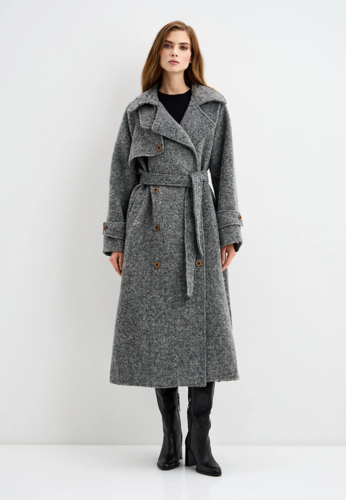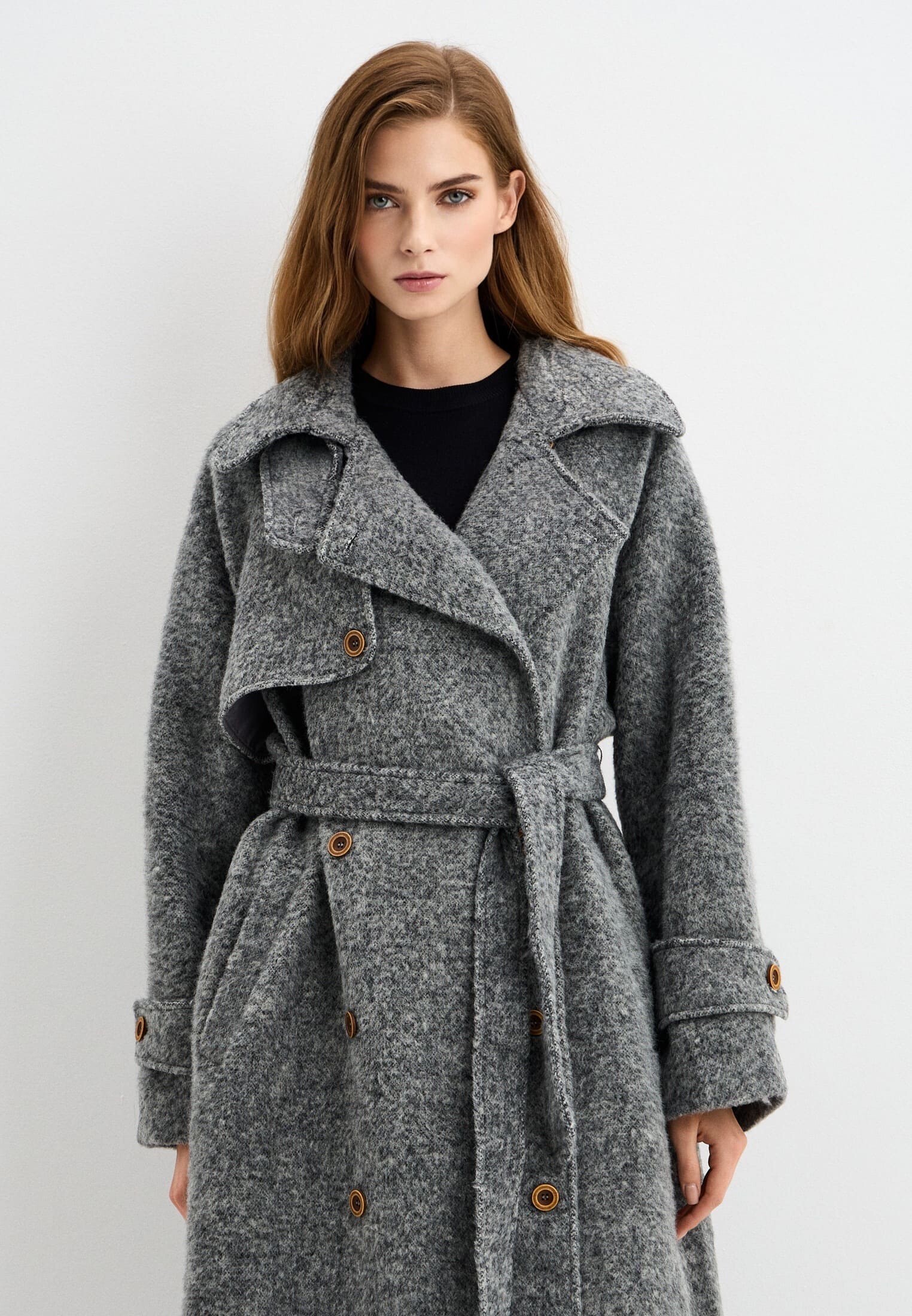 Дизайнерское пальто-халат оверсайз (размер 42–46) выполнено из мягкой шерстяной ткани с ворсом. Свободный крой с запахом фиксируется поясом, создавая ощущение непринуждённой элегантности. Крупные лацканы, двубортная застёжка на пуговицы и декоративный пелерин-клапан на груди подчеркивают архитектурность силуэта.