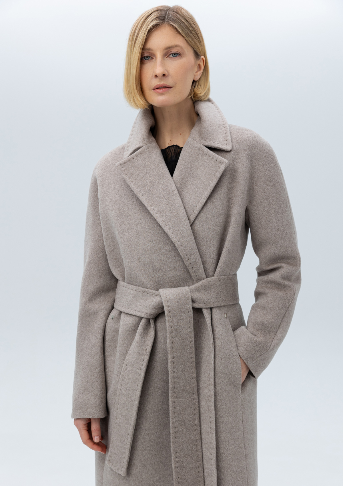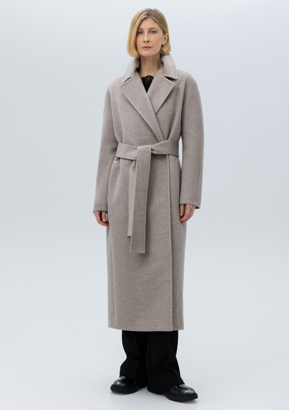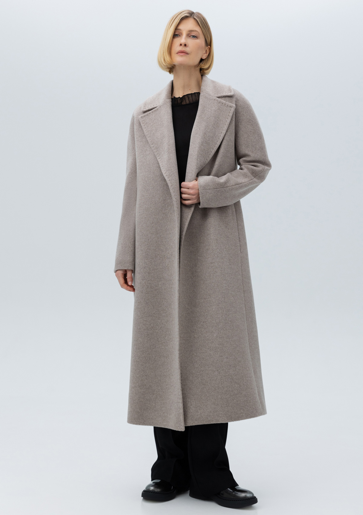 Женское пальто-халат Laplandia из высококачественной шерсти с добавлением шелка. Модель свободного прямого силуэта, английский воротник, комфортная линия плеча, цельнокроеный рукав, карманы в боковом шве, эффектная строчка "пунто", шлица по спинке. Пальто без застежки фиксируется широким поясом. Благодаря добавлению нейлона исключается пилинг, ткань становится более мягкой и прочной.