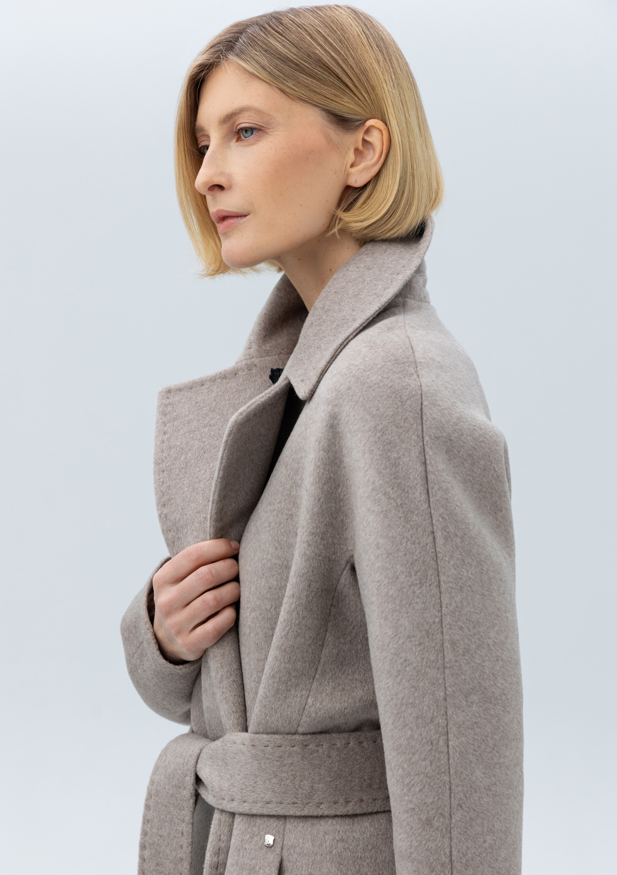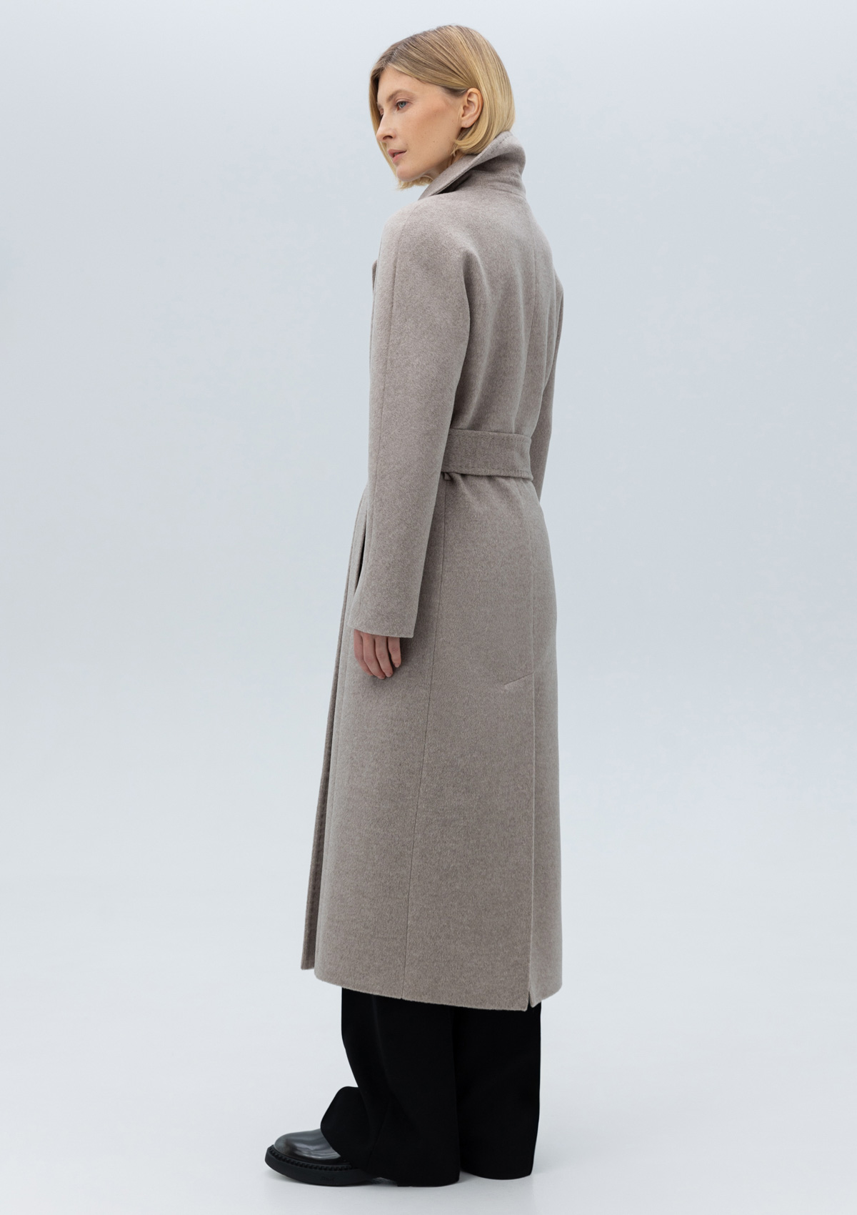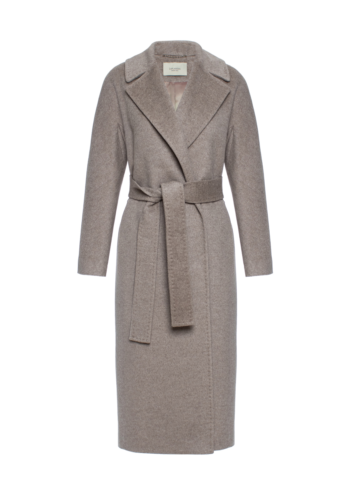 Женское пальто-халат Laplandia из высококачественной шерсти с добавлением шелка. Модель свободного прямого силуэта, английский воротник, комфортная линия плеча, цельнокроеный рукав, карманы в боковом шве, эффектная строчка "пунто", шлица по спинке. Пальто без застежки фиксируется широким поясом. Благодаря добавлению нейлона исключается пилинг, ткань становится более мягкой и прочной.