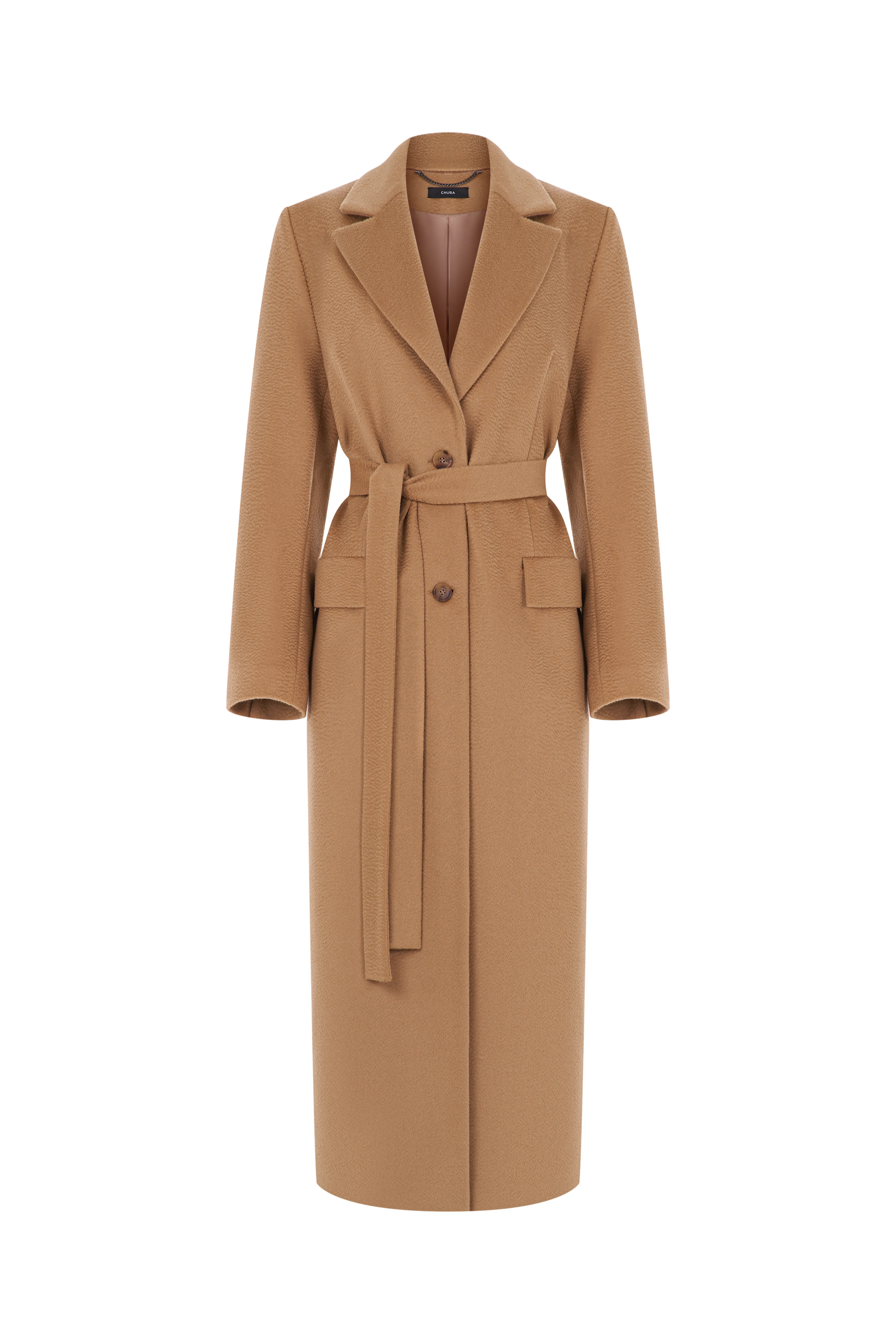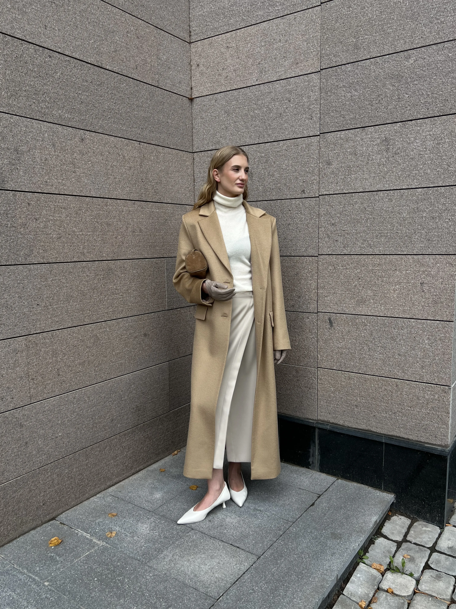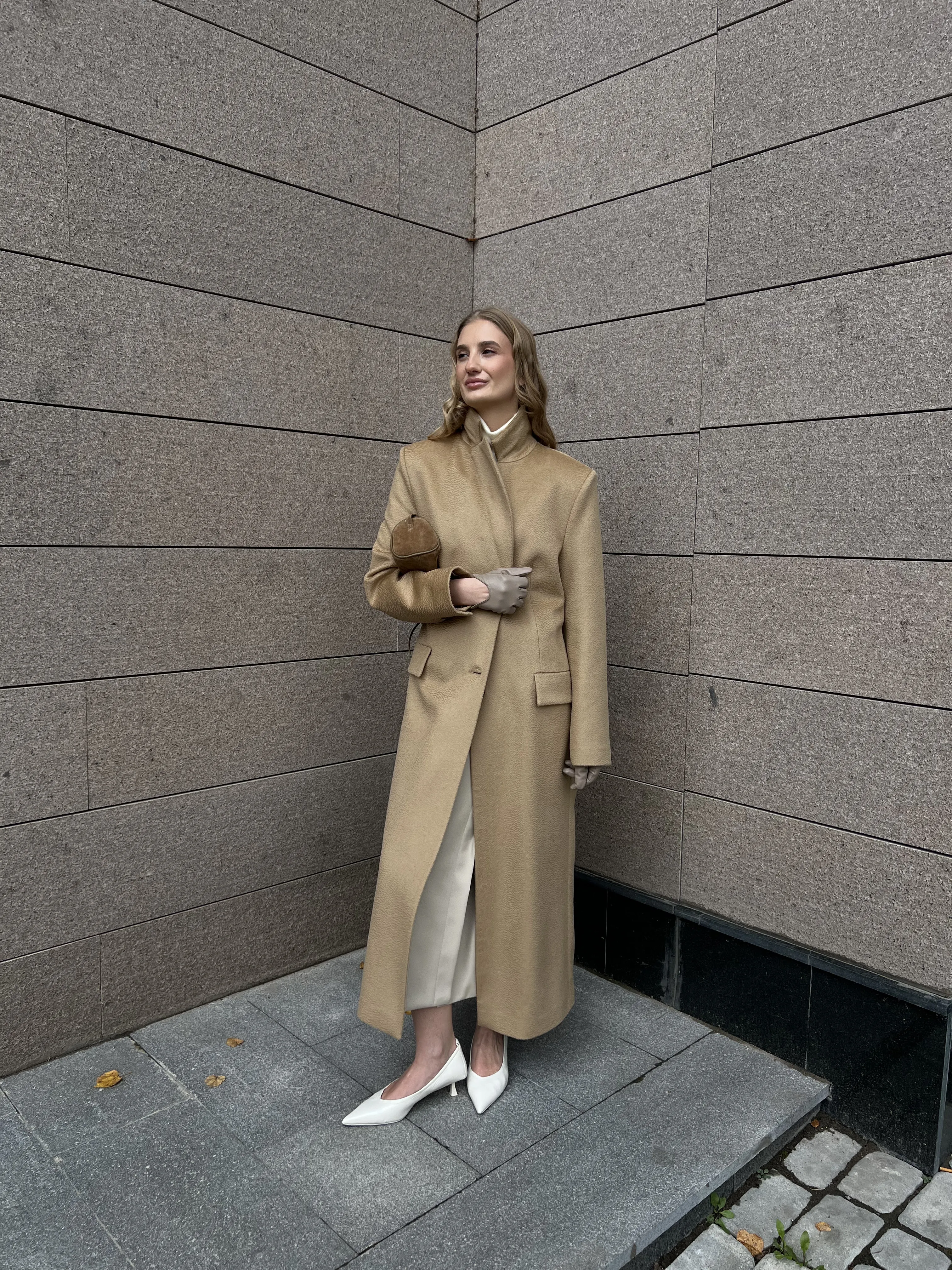 Акцентное пальто в песочном цвете. 100% шерсть, прямой силуэт и умеренный объем.