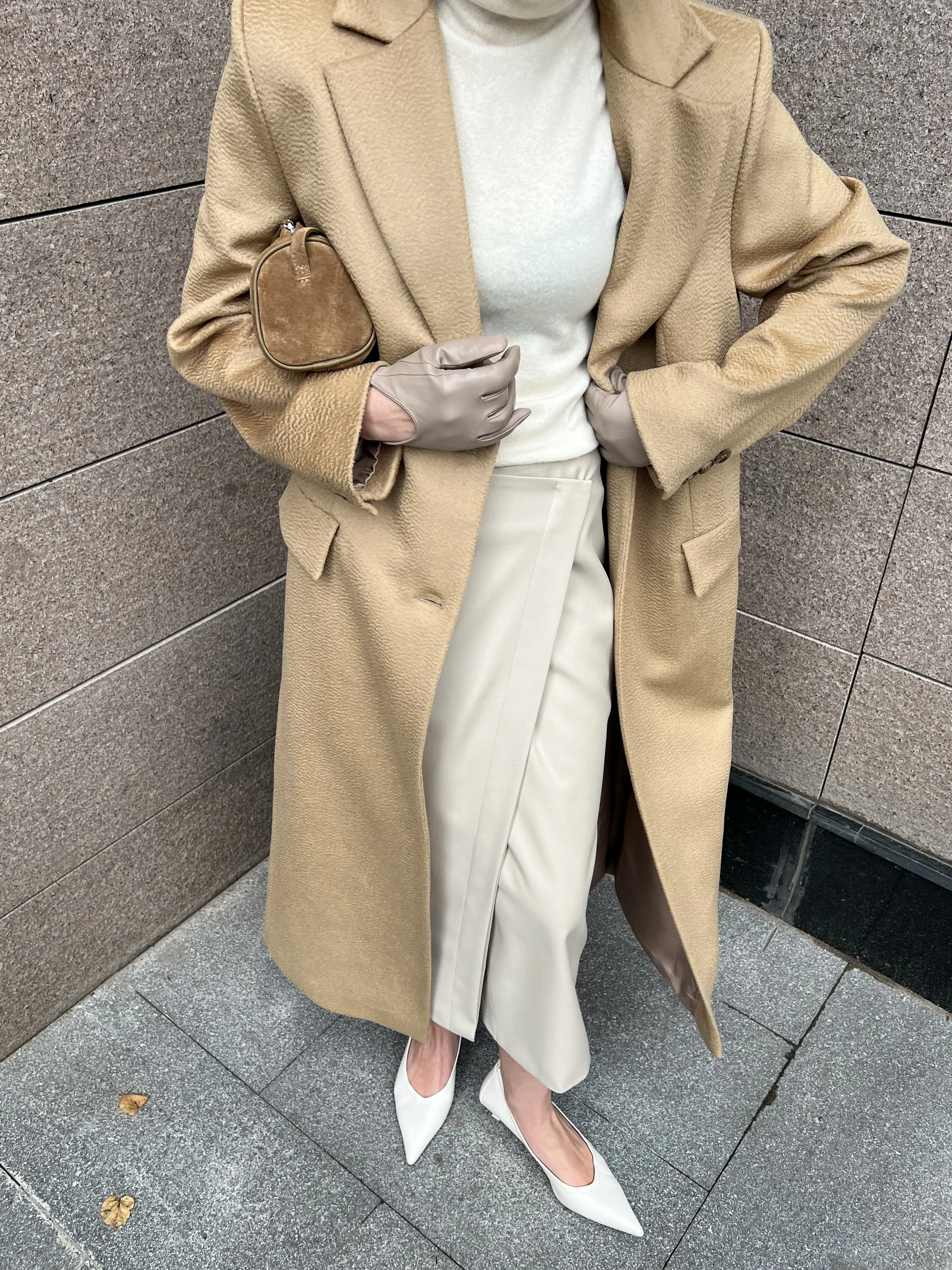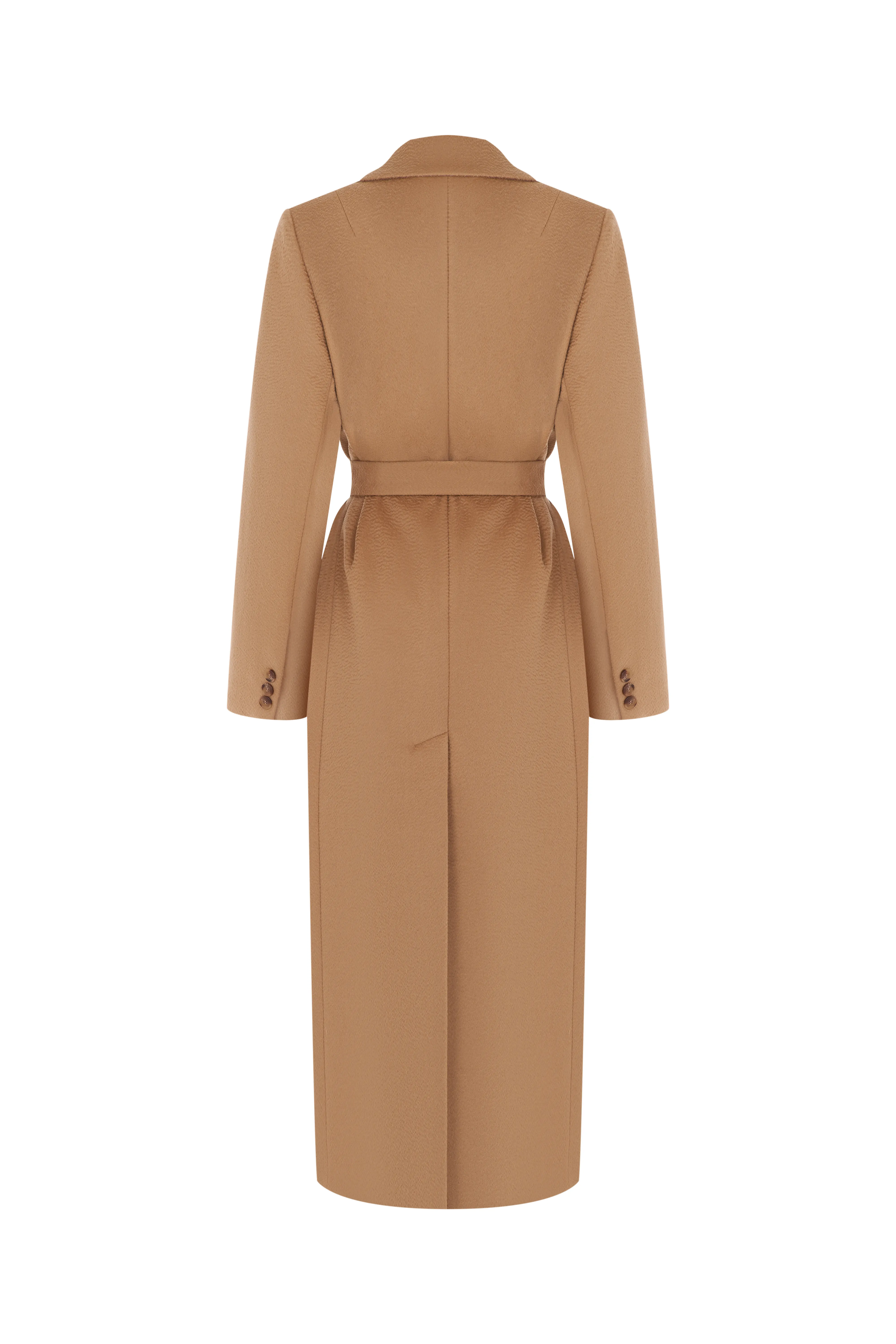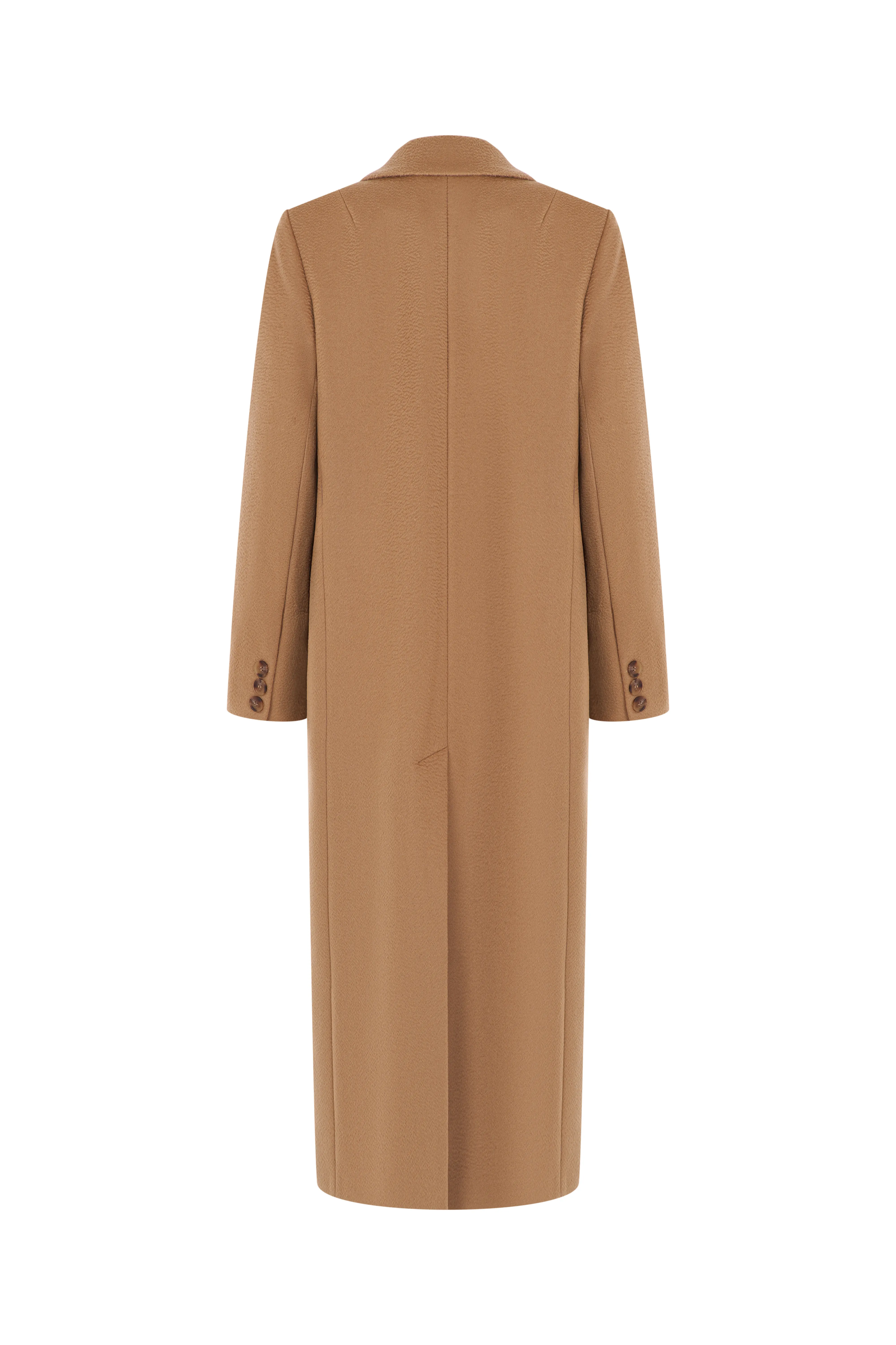 Акцентное пальто в песочном цвете. 100% шерсть, прямой силуэт и умеренный объем.
